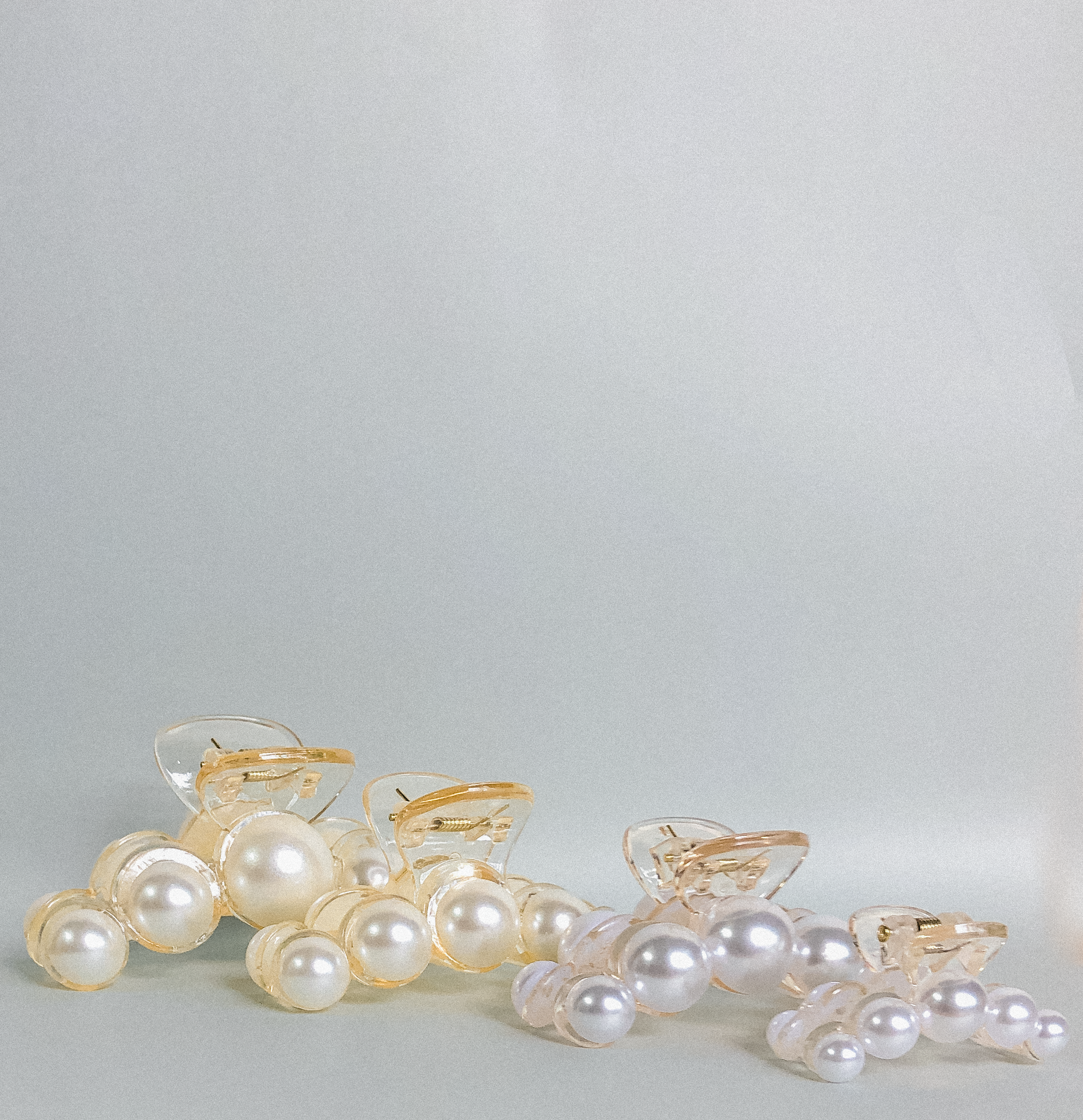 The Aphrodite Hair Claw Set is a 2pc cool toned pearl accessory set made of 100% acetate and measures 6cm x 2.5 cm and 4cm x 2cm .