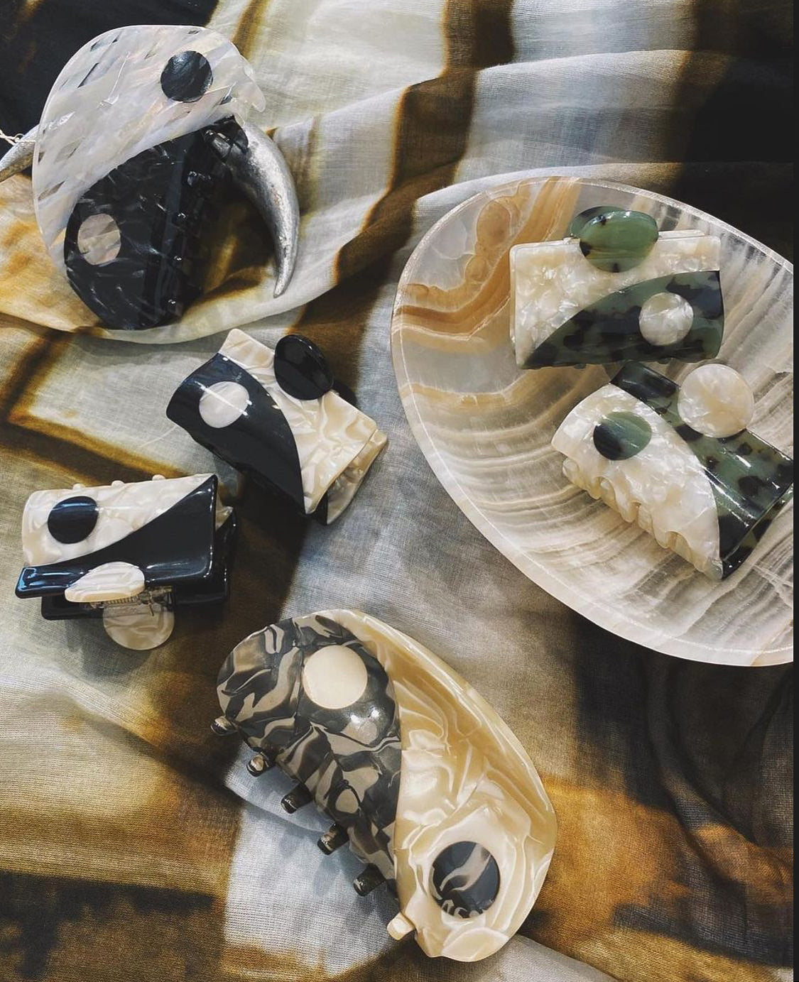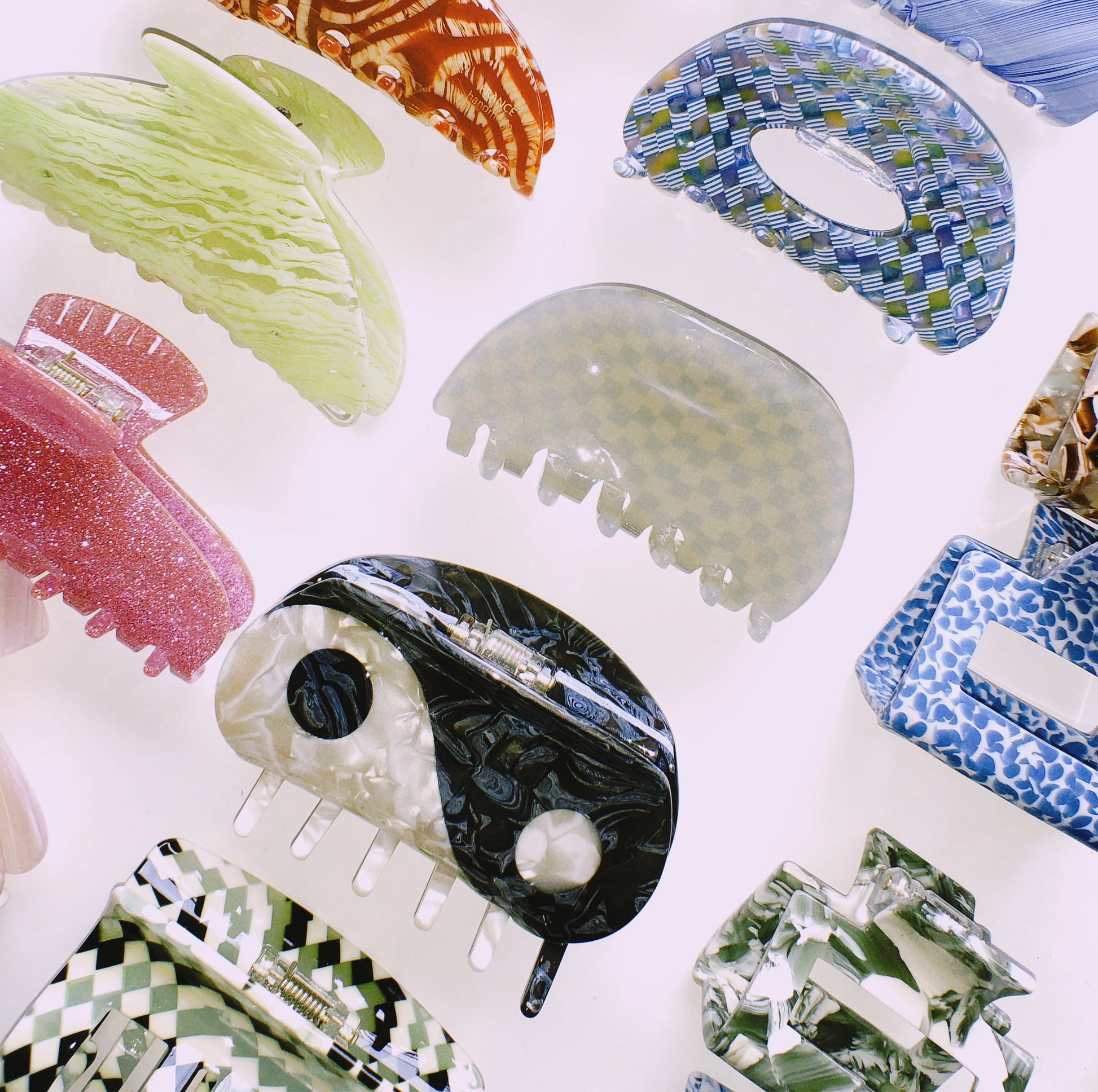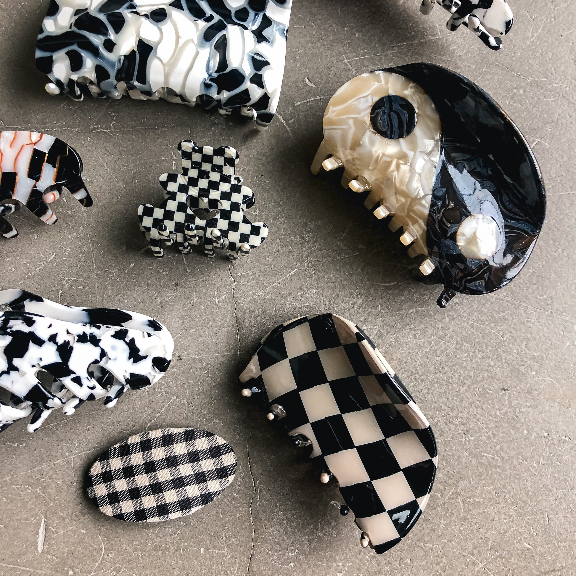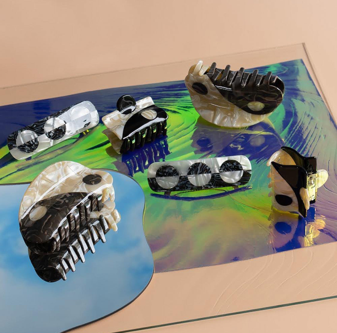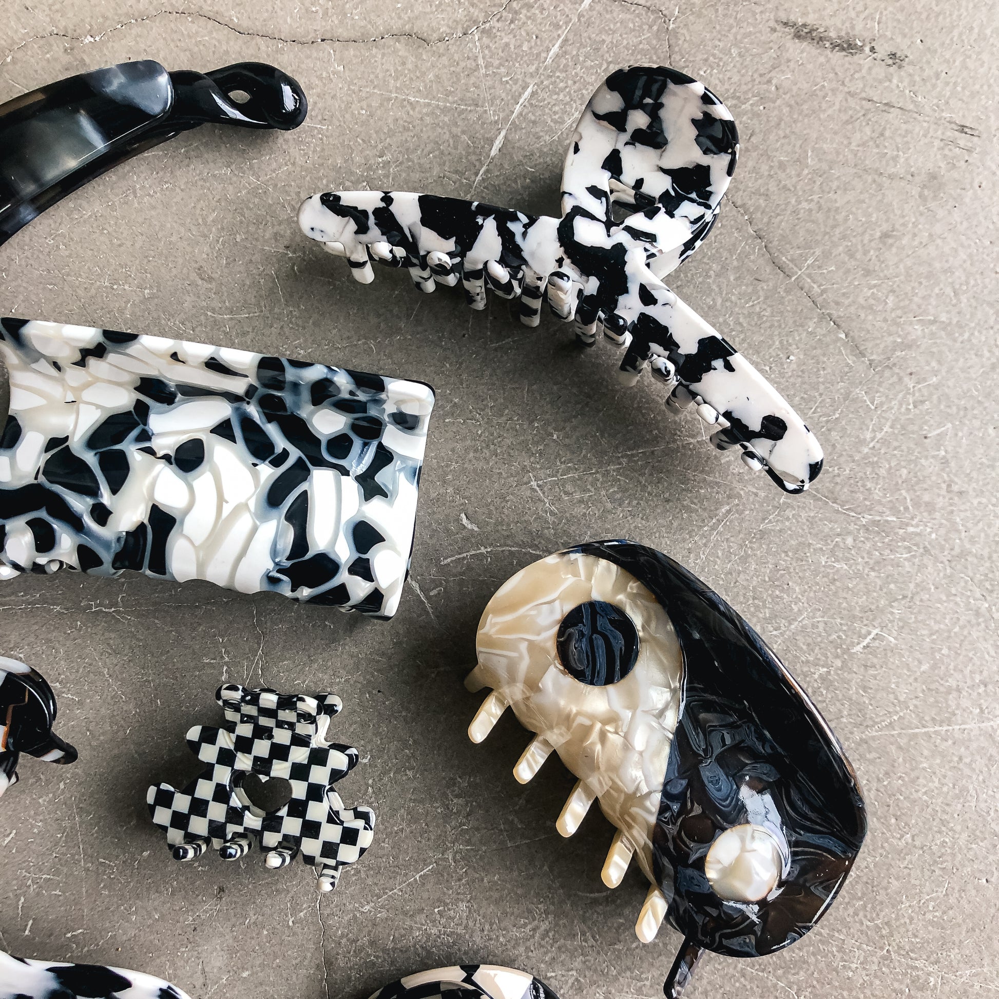 The Balance Hair Claw features a bold marbled shell finish Ying Yang print and measures approximately 8cm across, best suited for medium to long hair.