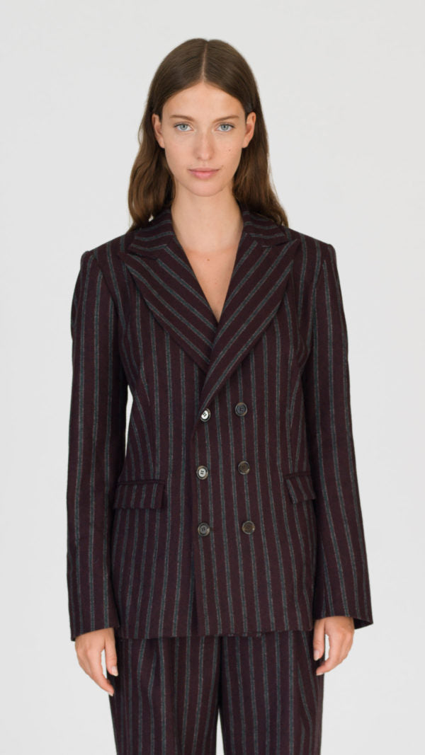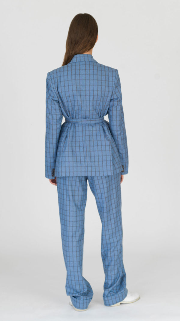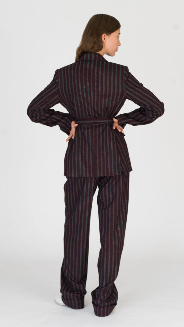 This crossed blazer with its large tailor collar and double buttoning closing system is offered in blue checked wool and burgundy stripe wool woven in Italy. Its two welt side pockets (with a flap) and two slits at the back give your silhouette an elegant allure. The long belt allows you to adjust the volume to your preference. The blazer’s body is entirely lined and will keep you warm all winter.