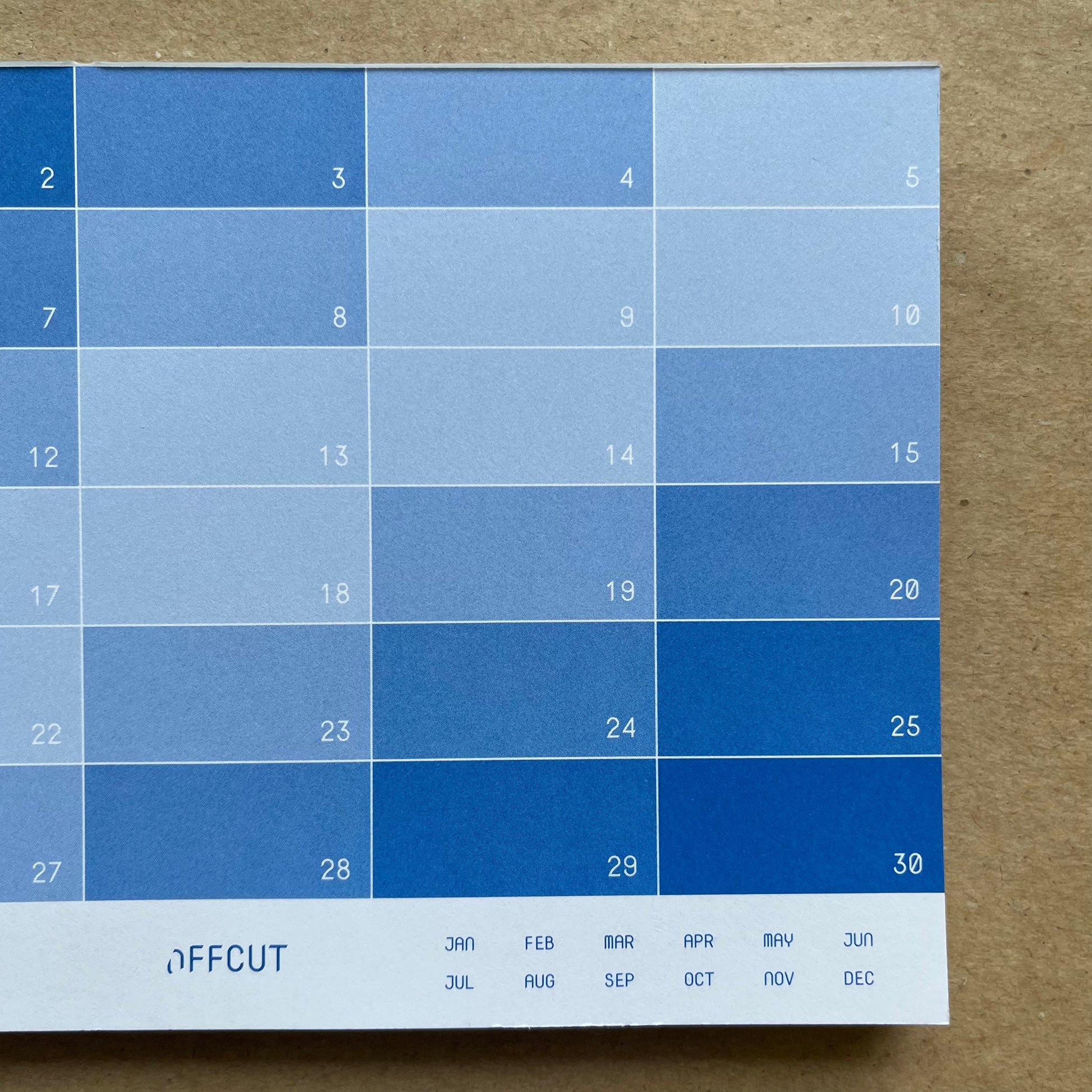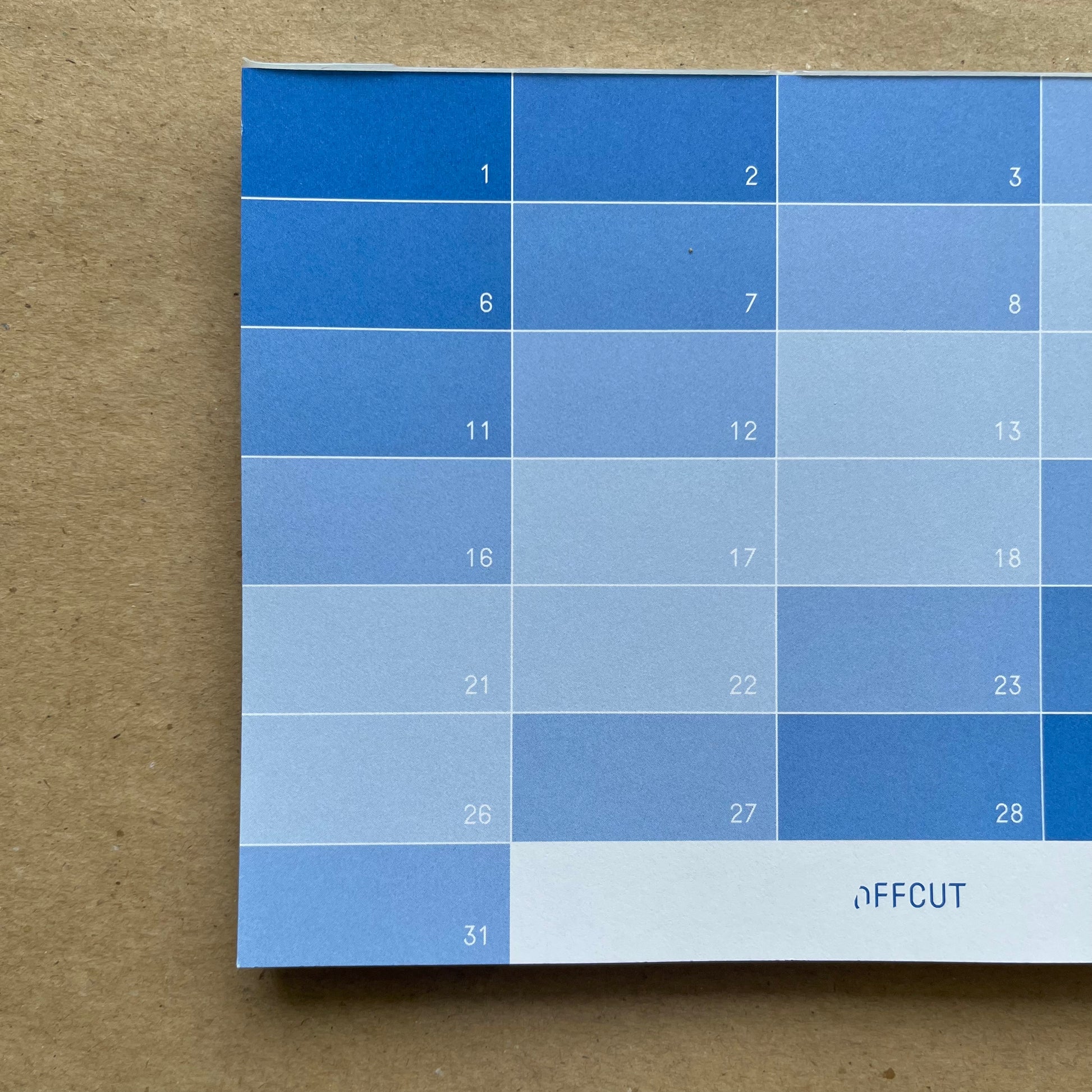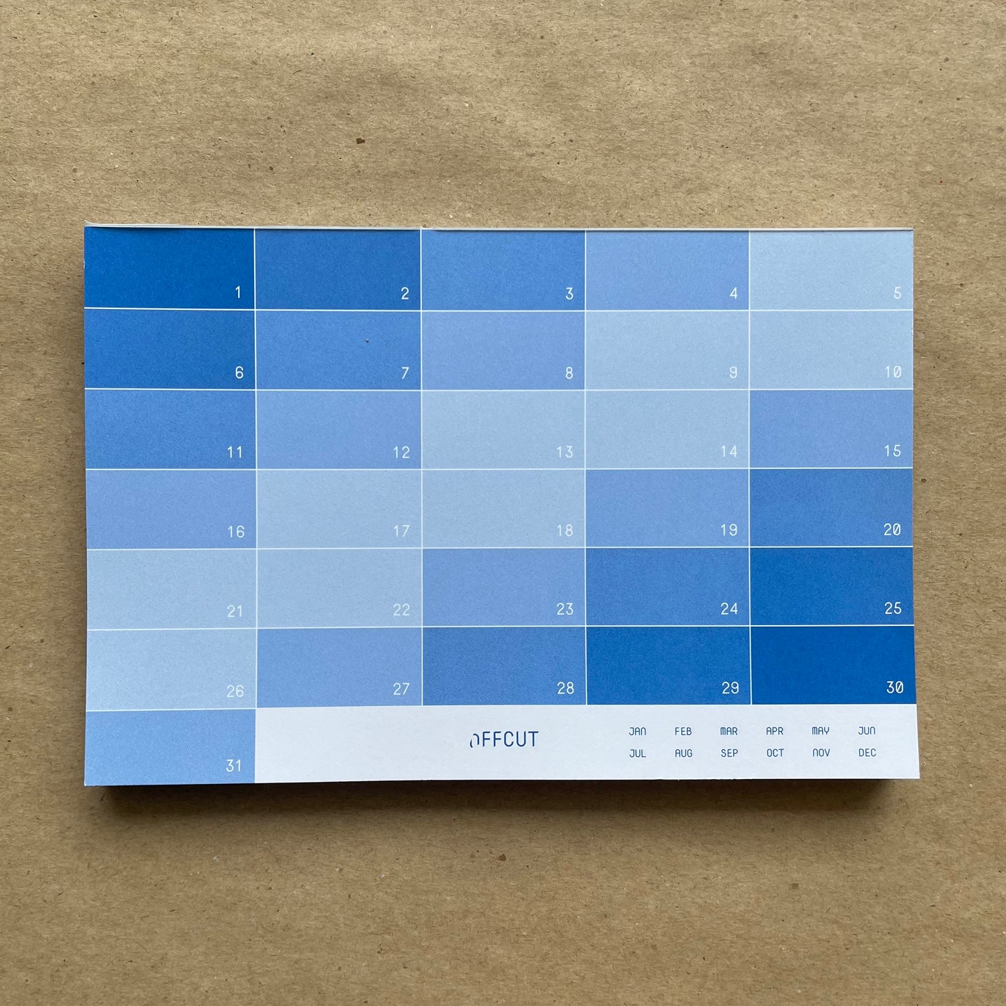 A monthly tear-off block calendar in a gradient of blue and white for overall scheduling.