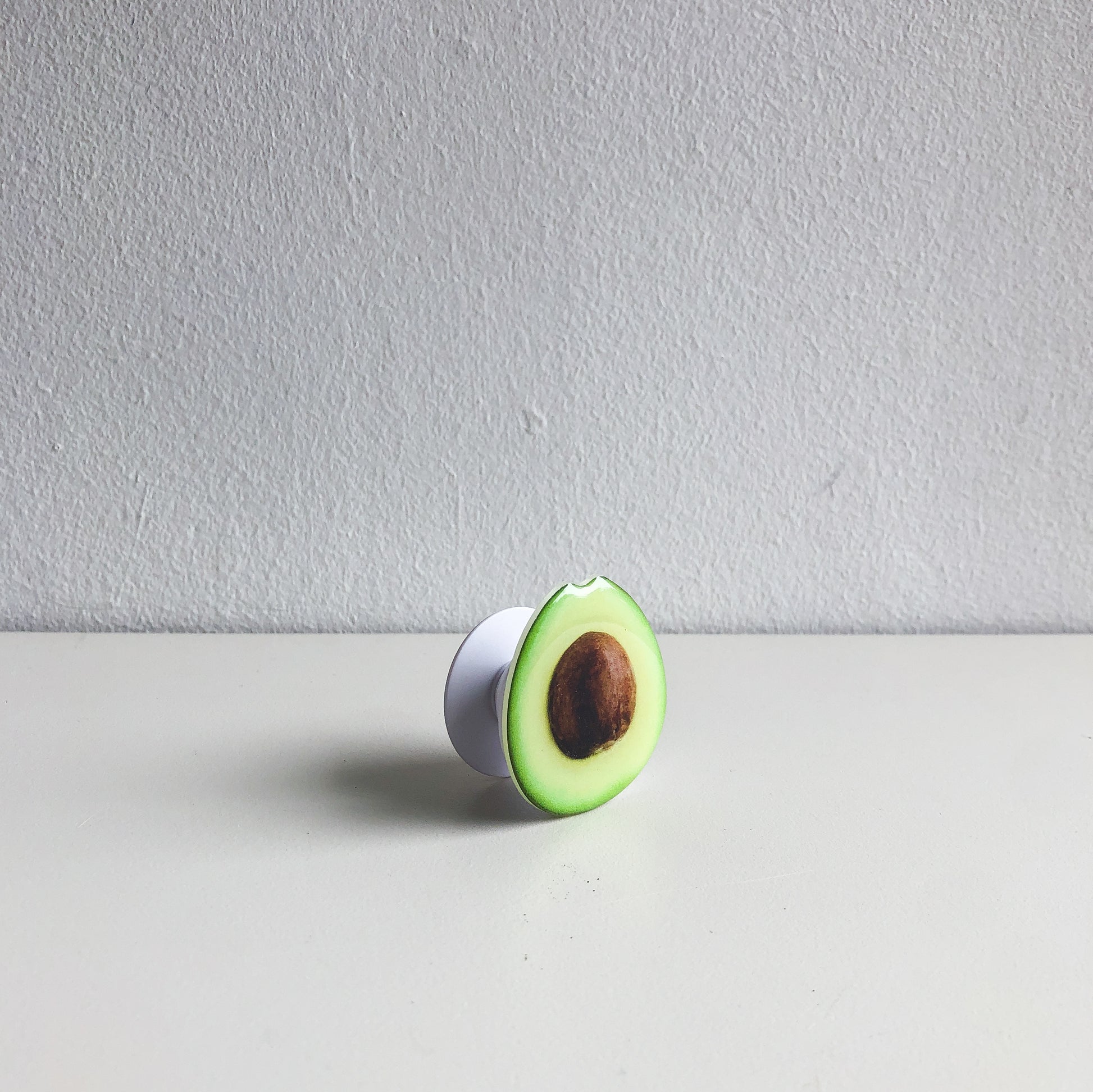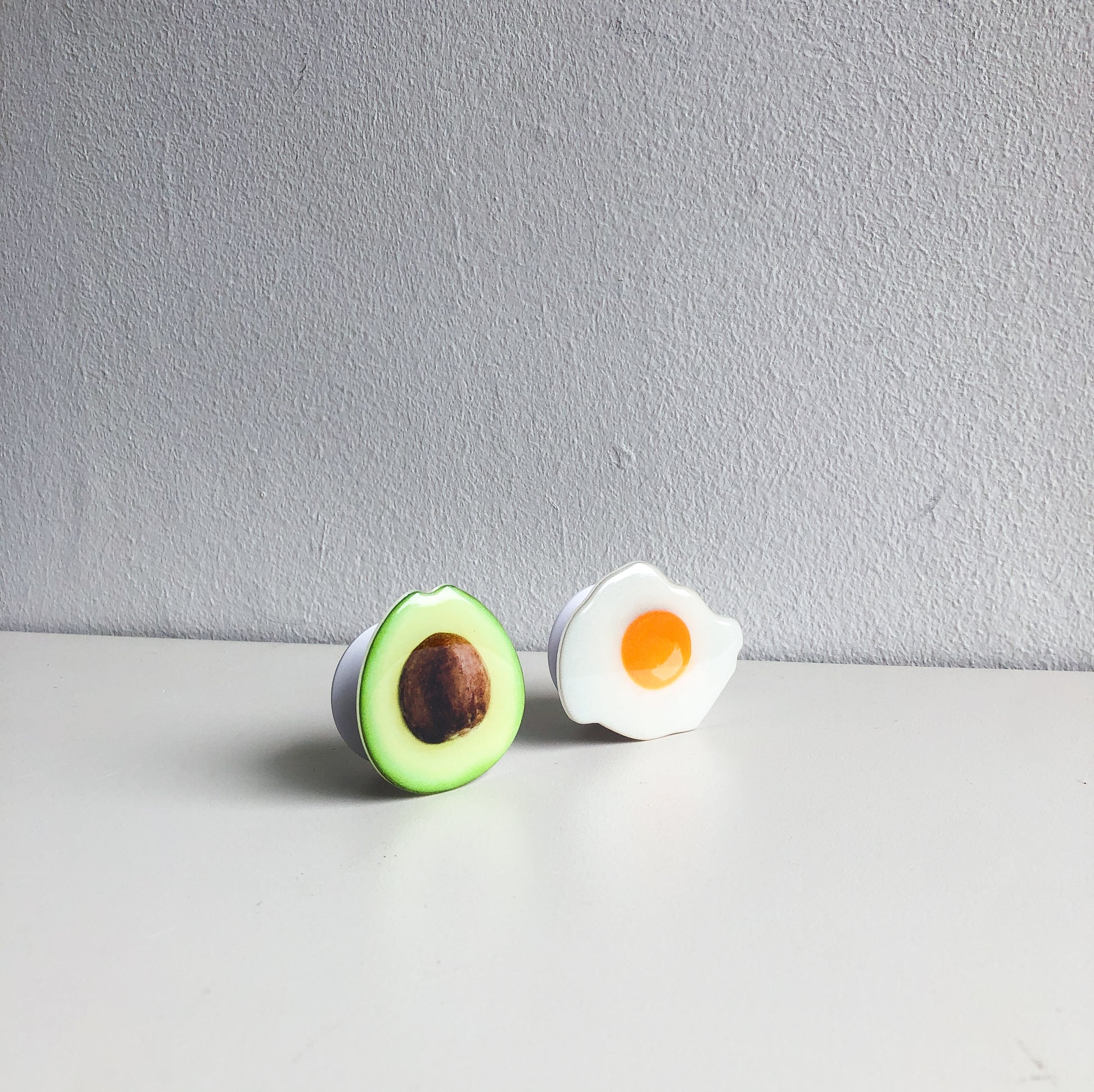 The Breakfast Set Pop Socket comes with a beautifully printed resin sunny side up egg or avocado half with heavy duty 3M adhesive backing for longevity.