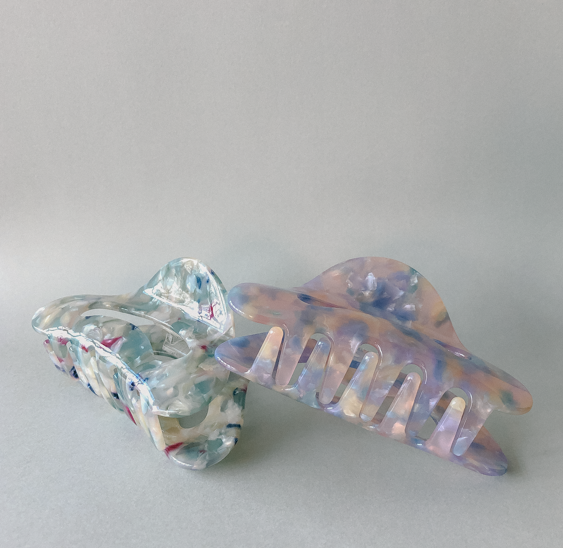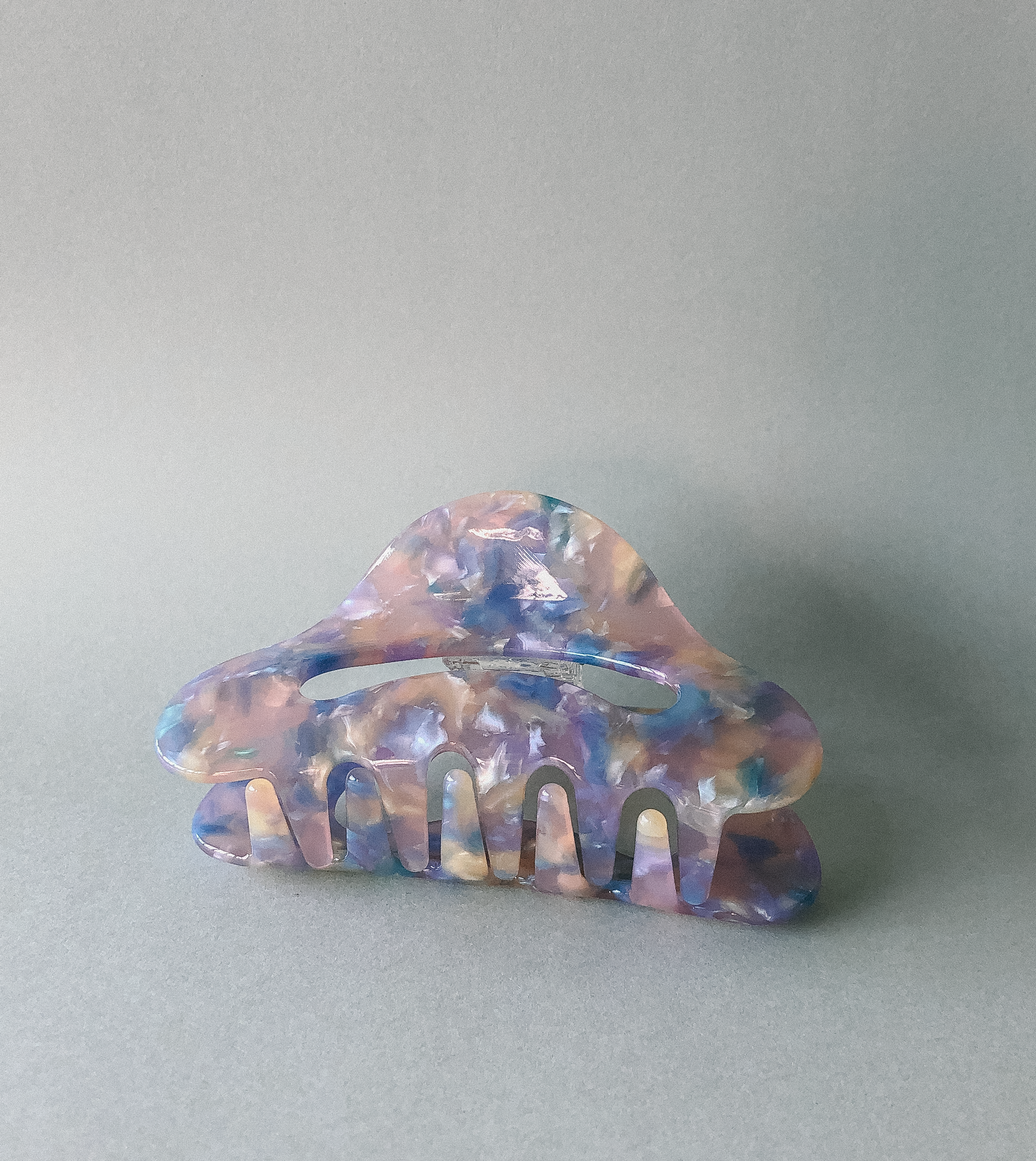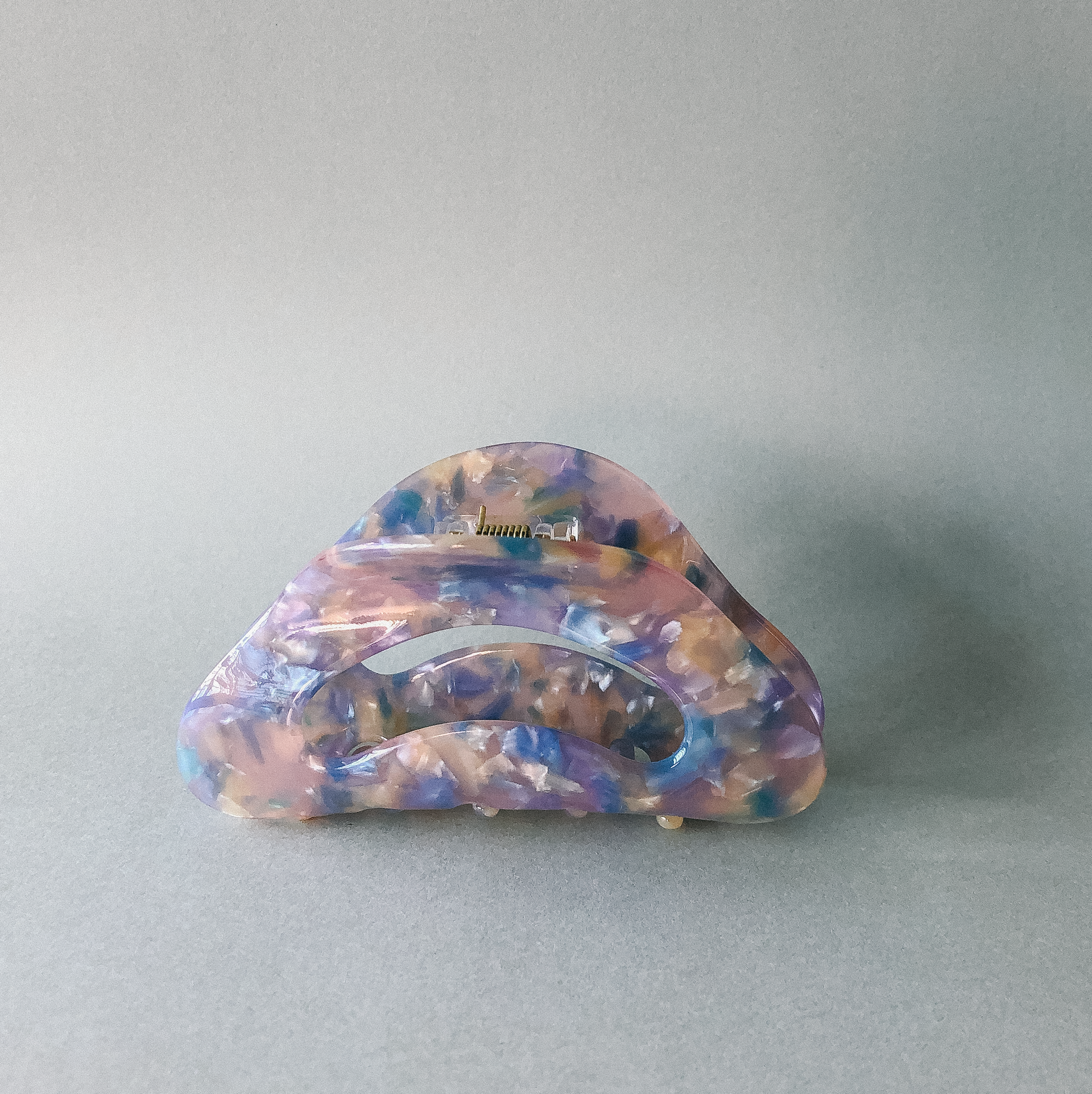 Carolina Vintage Acetate Hair Claws with swirls of navy blue, purple and gold in a speckled shell finish.