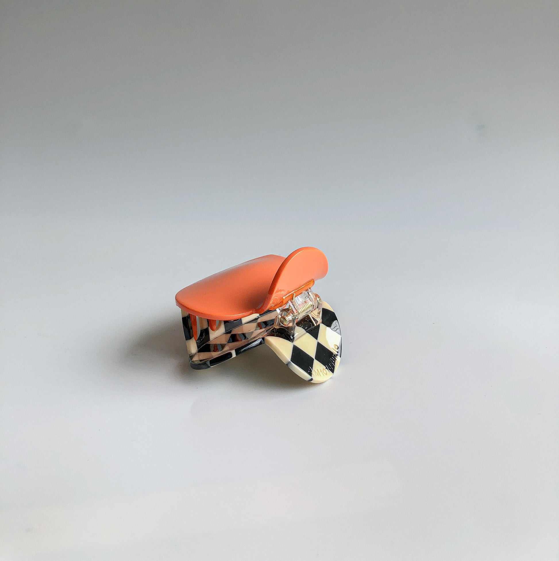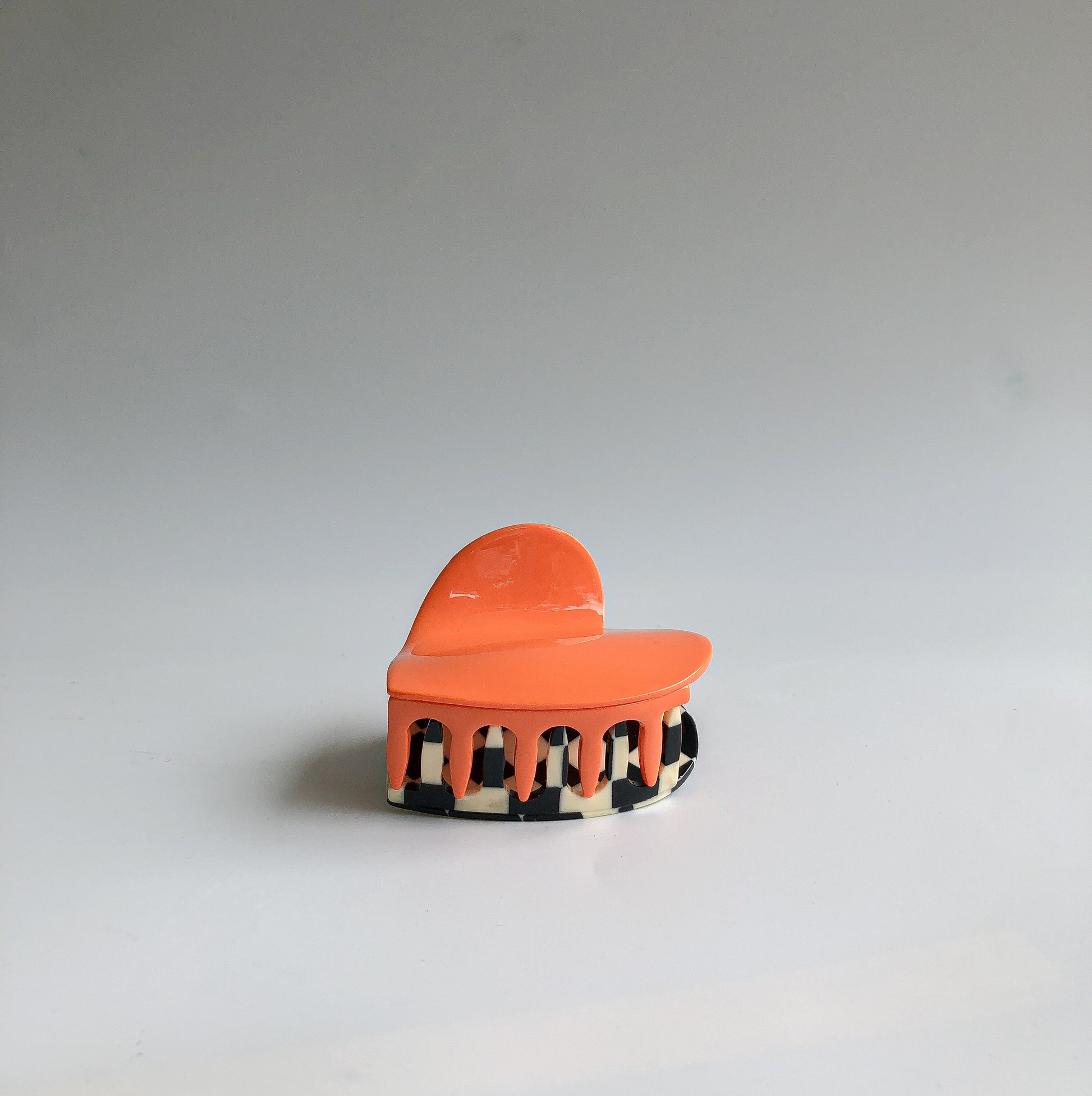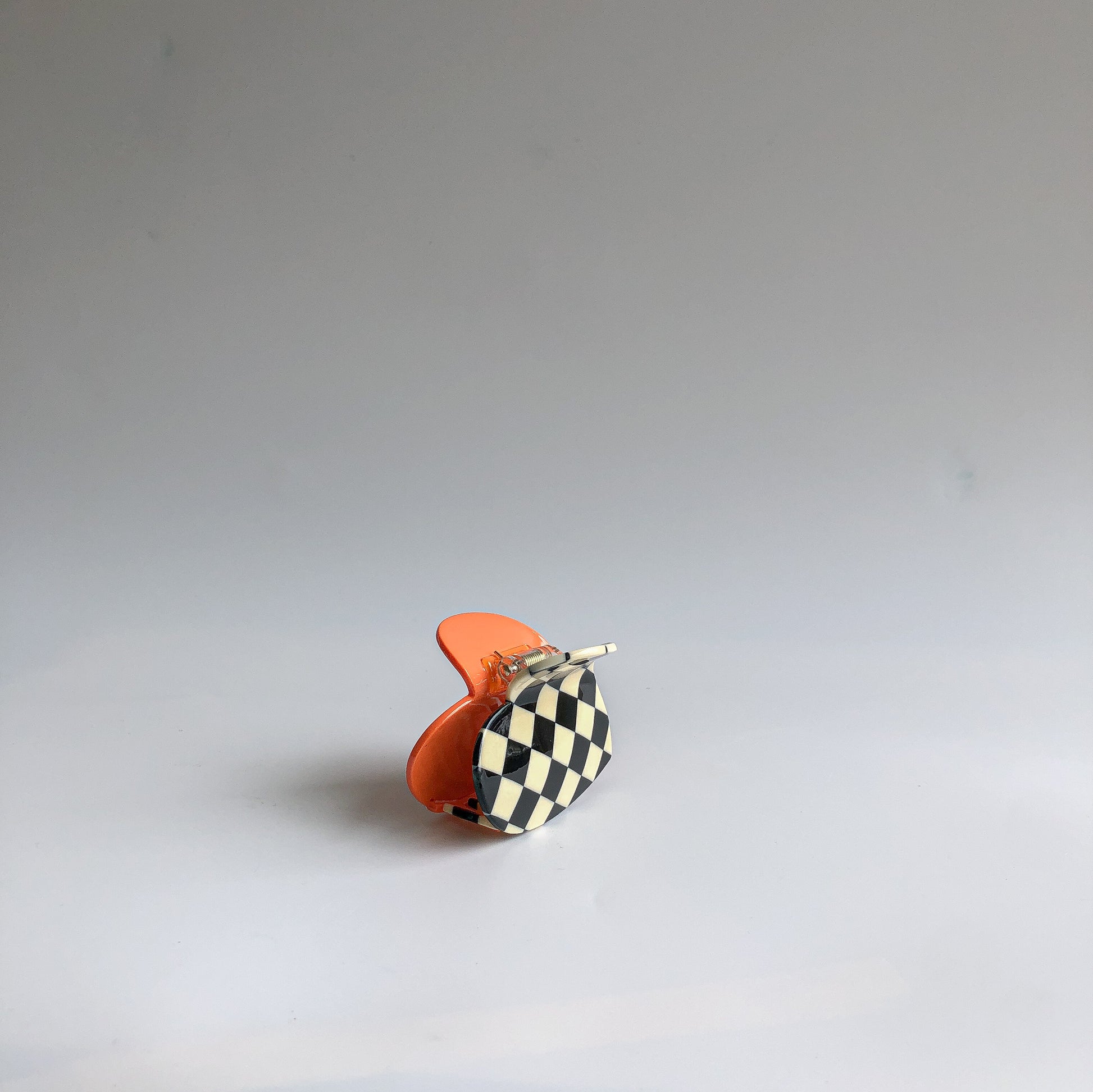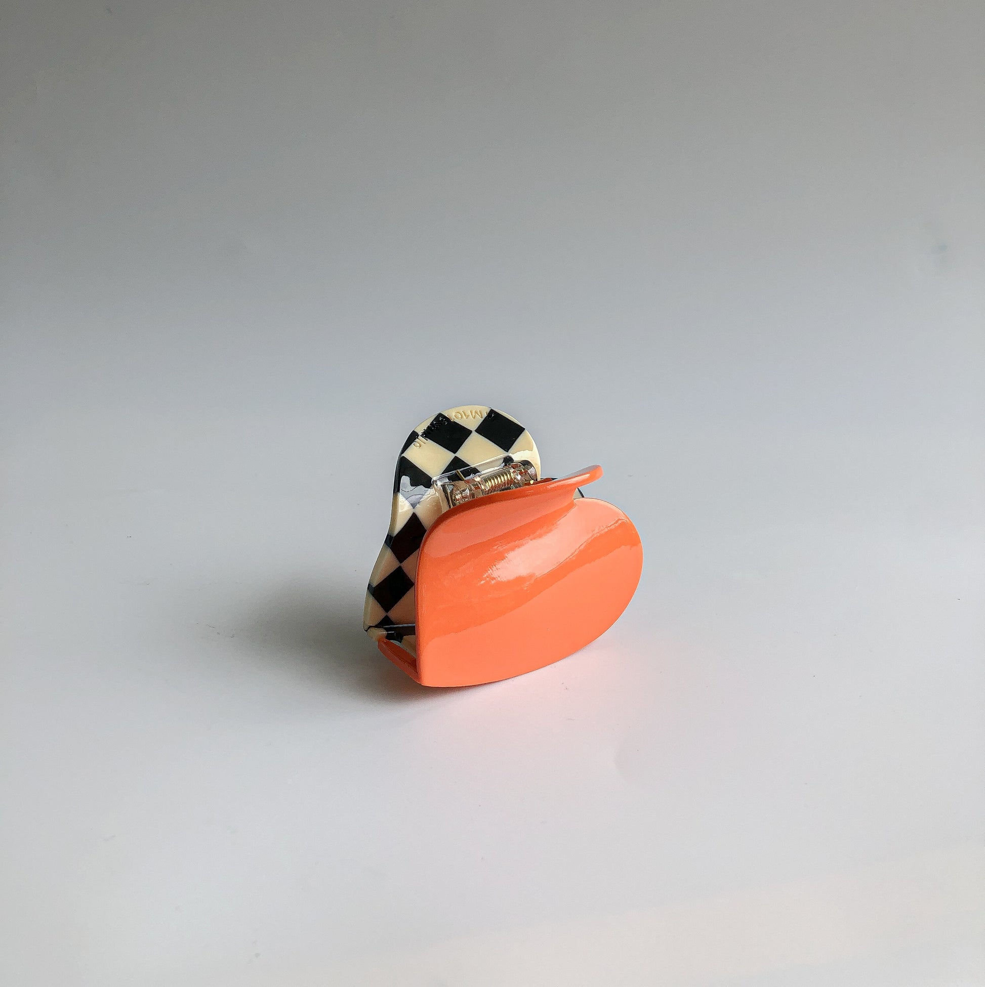 The Checkered Contrast Heart Claw Clip by Veronique is a dual face large heart shaped claw clip with bold black & white checkers on one side and bright orange on the other.