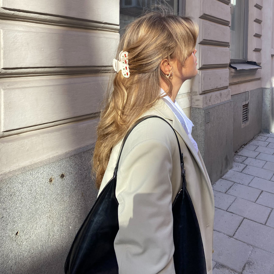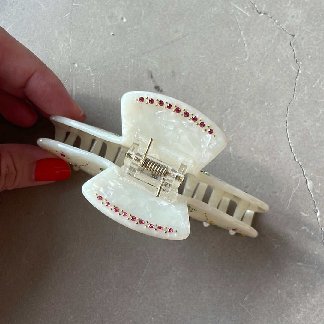The Cherry Bedazzle Hair Claw clip comes with crystal cherries and tiny crystal detailing set on a resin shell claw. Available in Cream, Pink or Blue Shell.