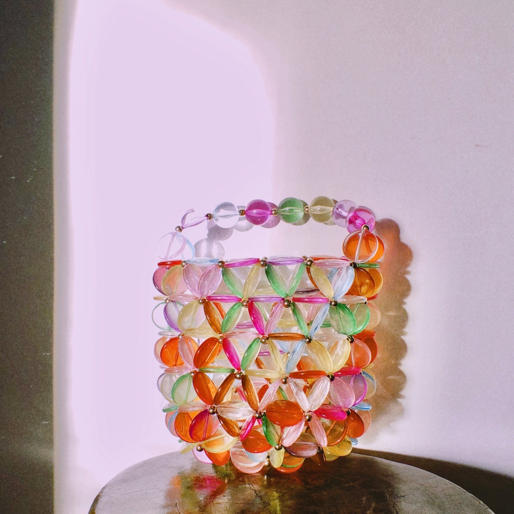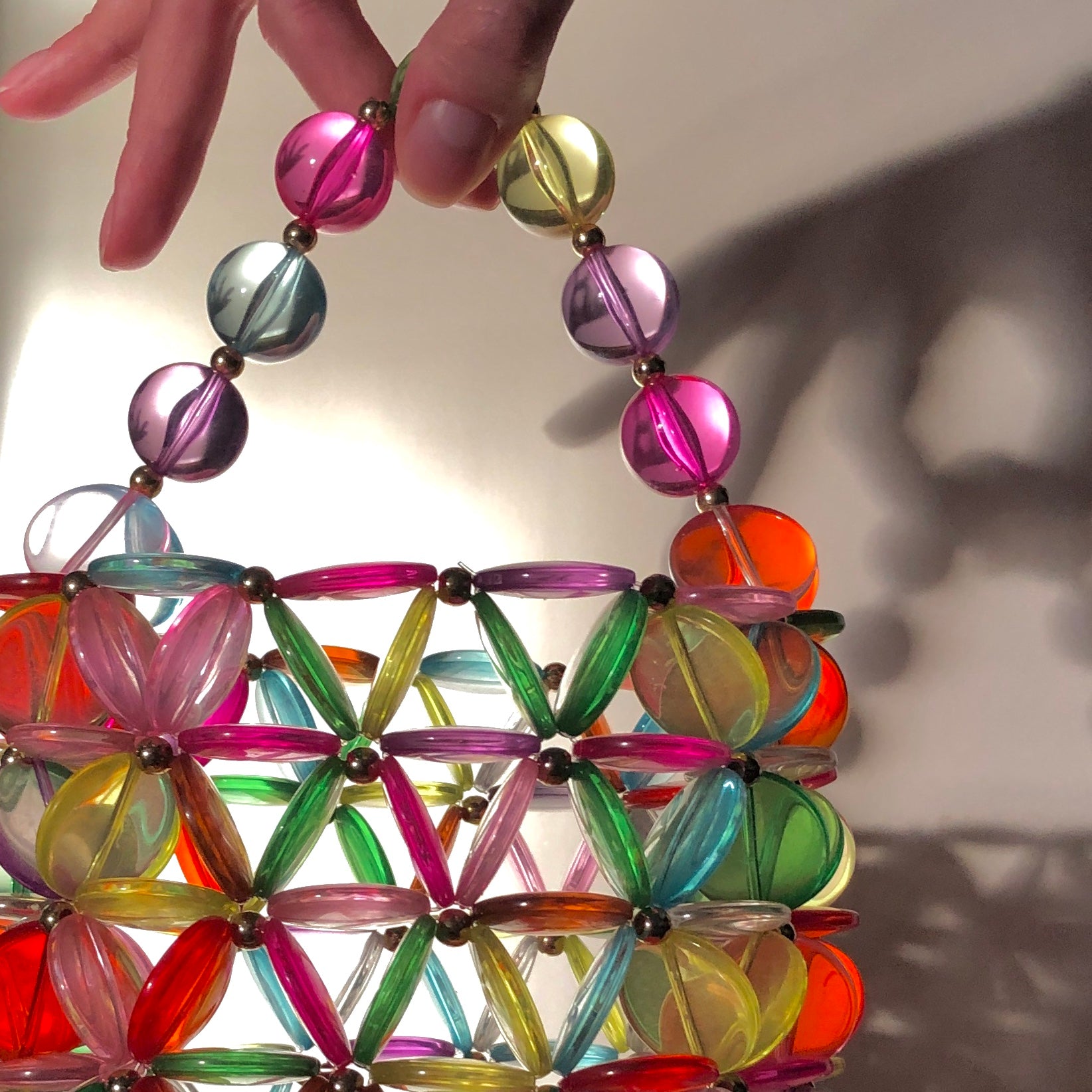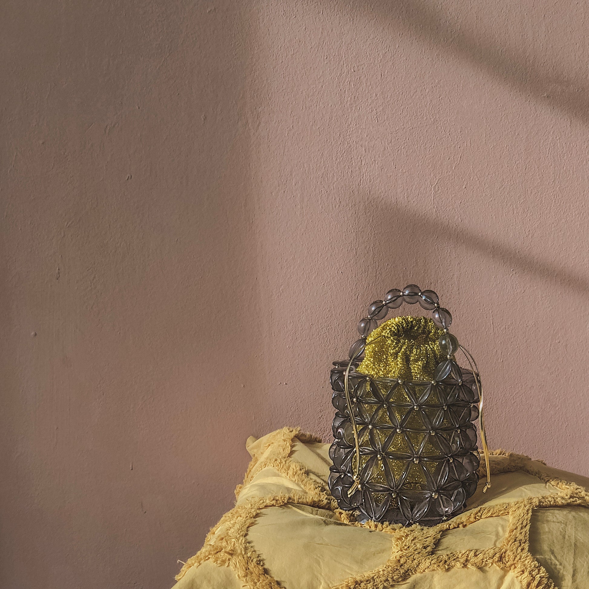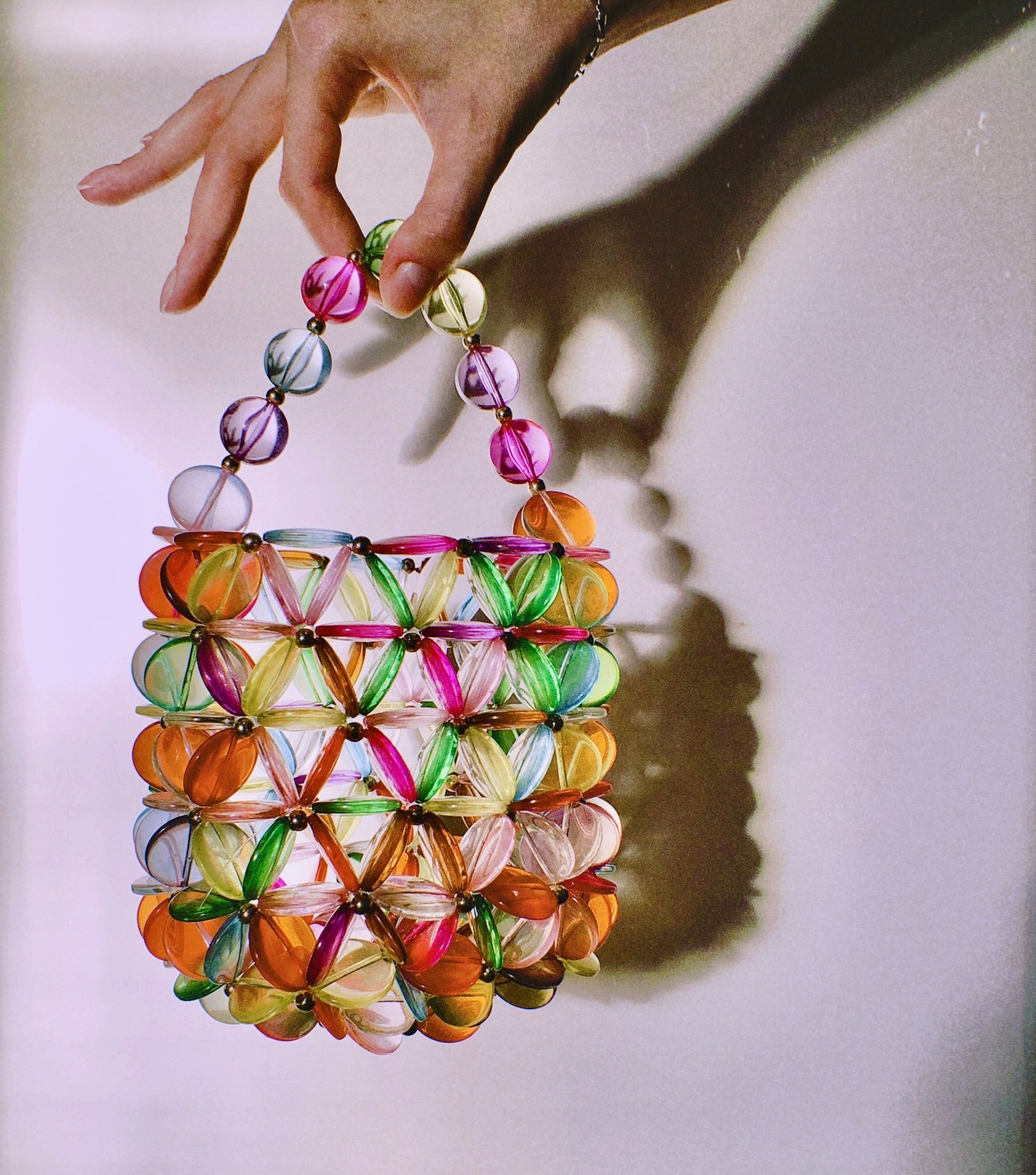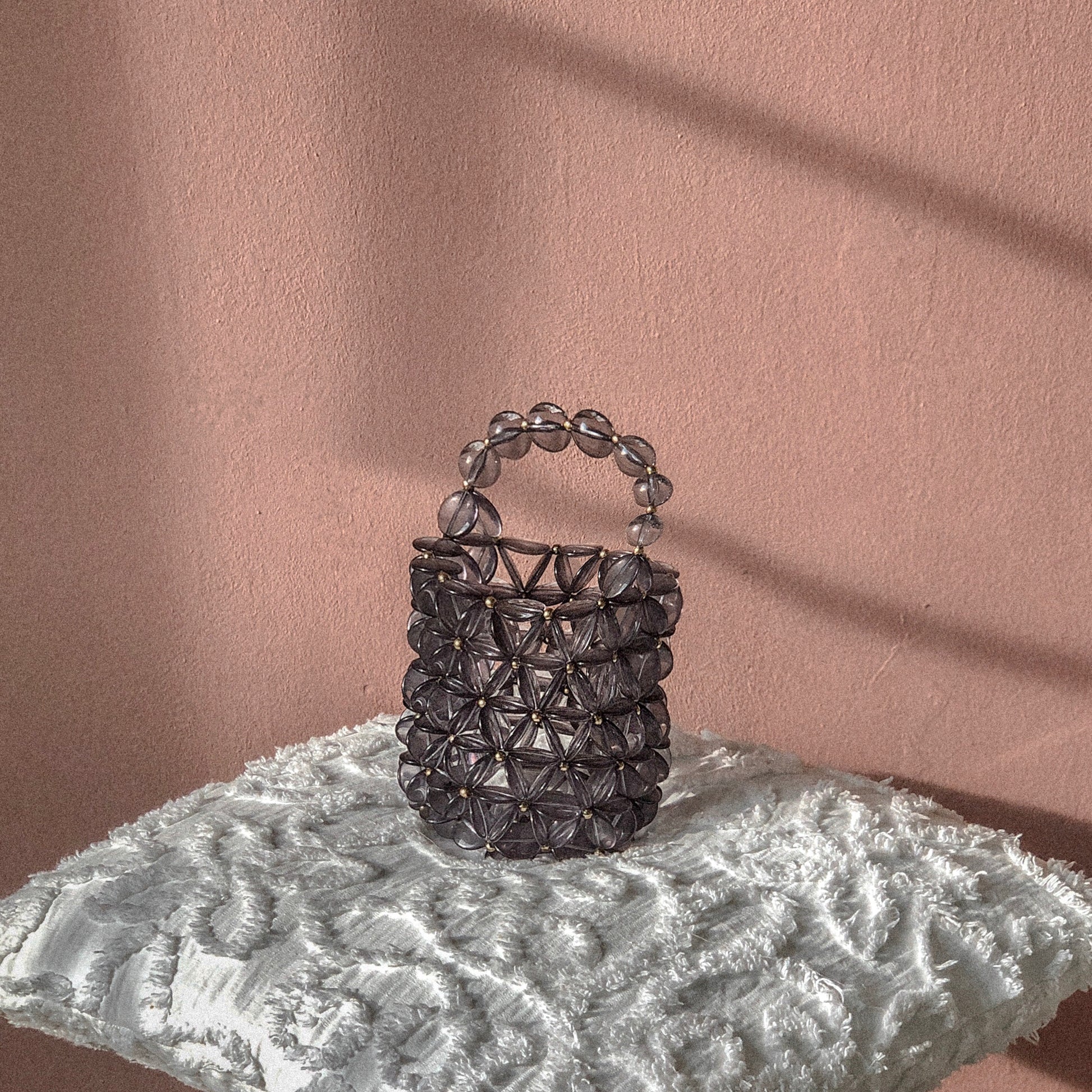 The body of this greyscale Kim Bucket Bag is made up of flatback acrylic shells bedazzled with silver beads, and a unique handle.