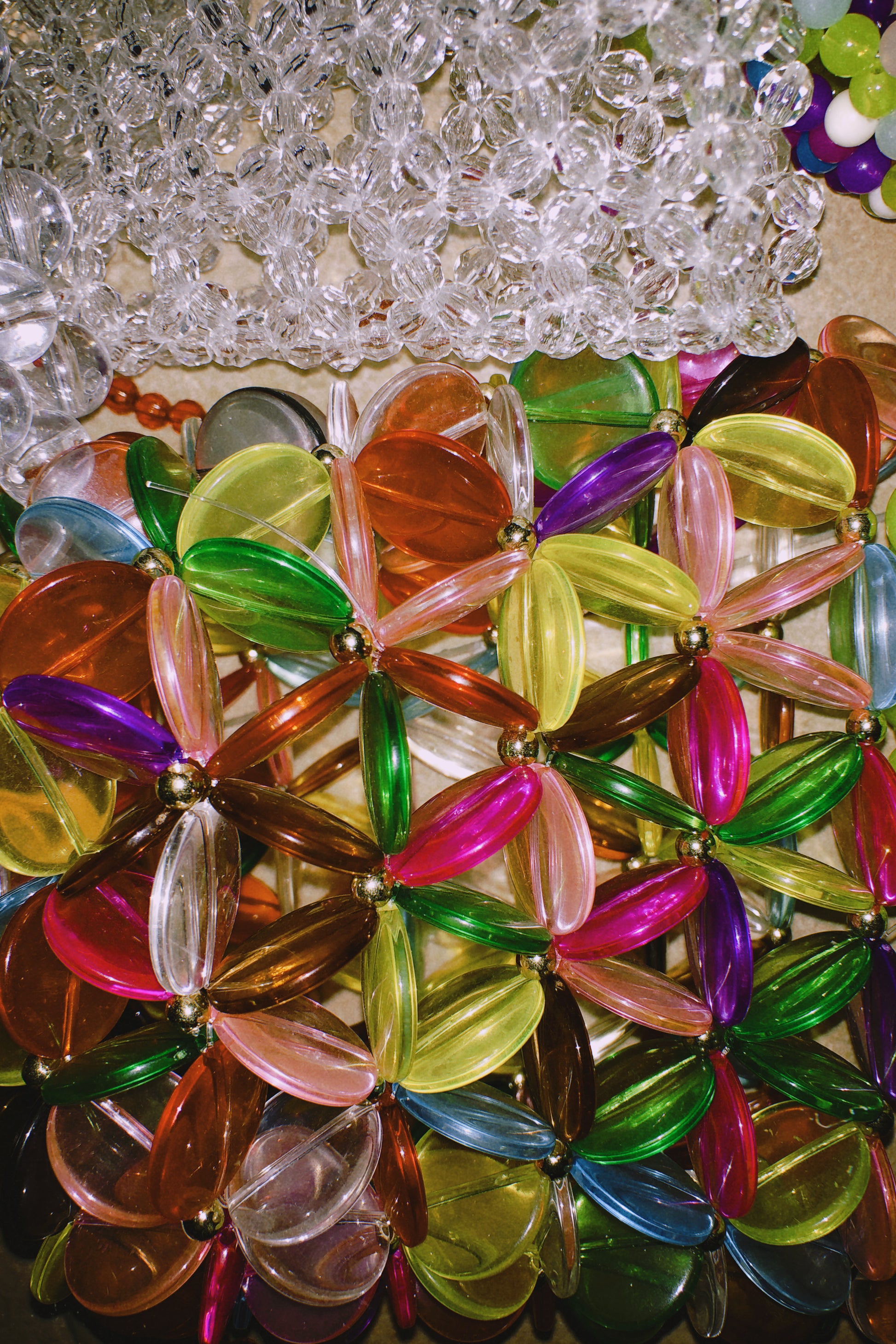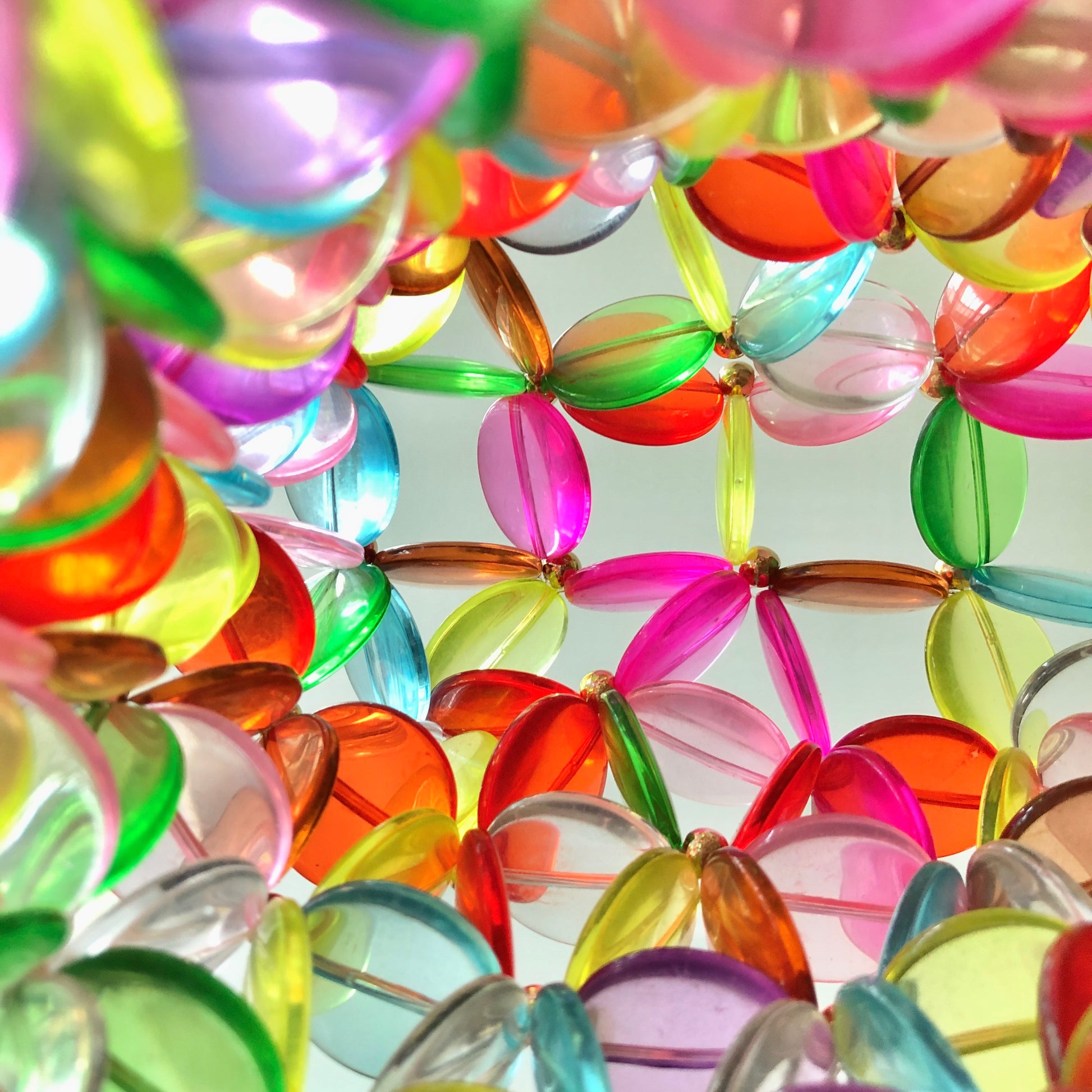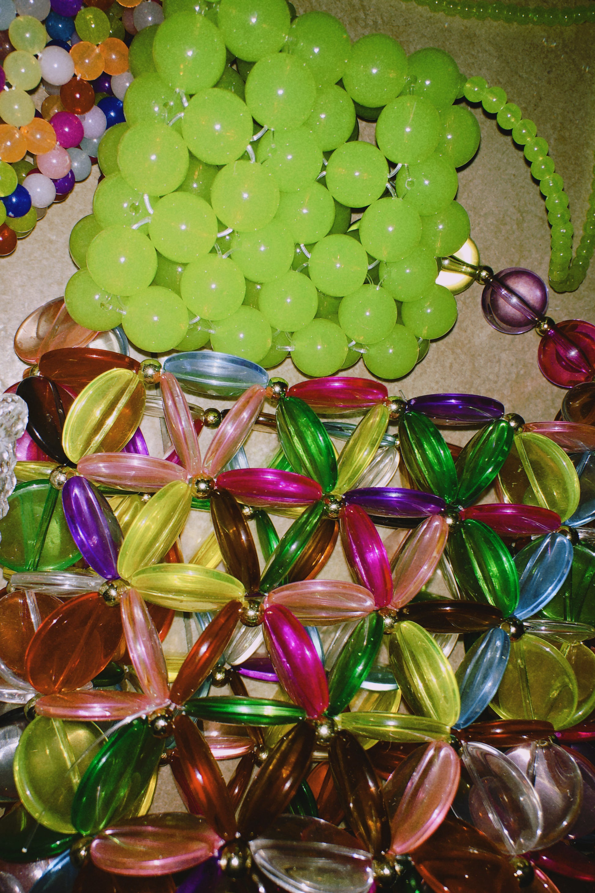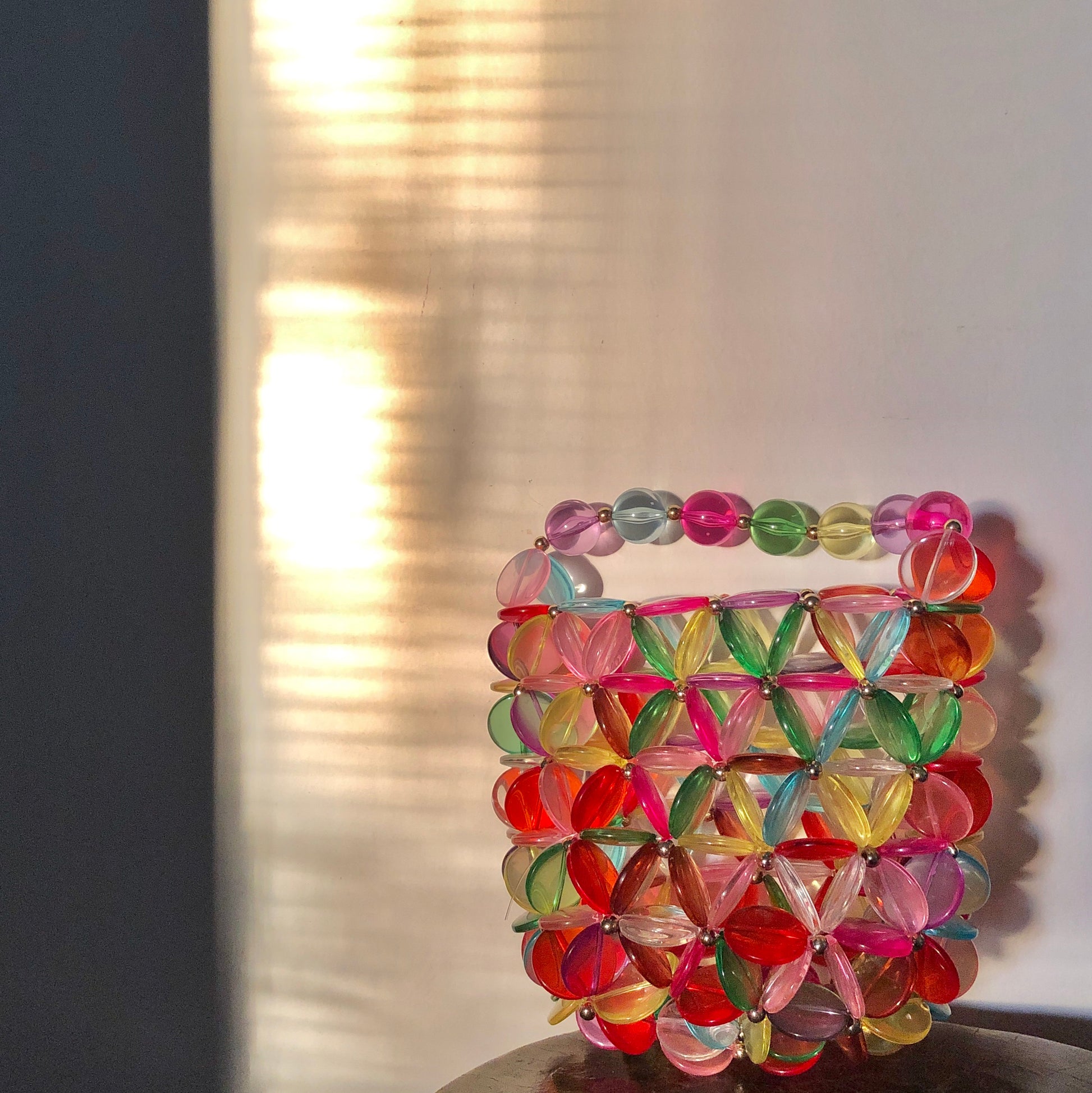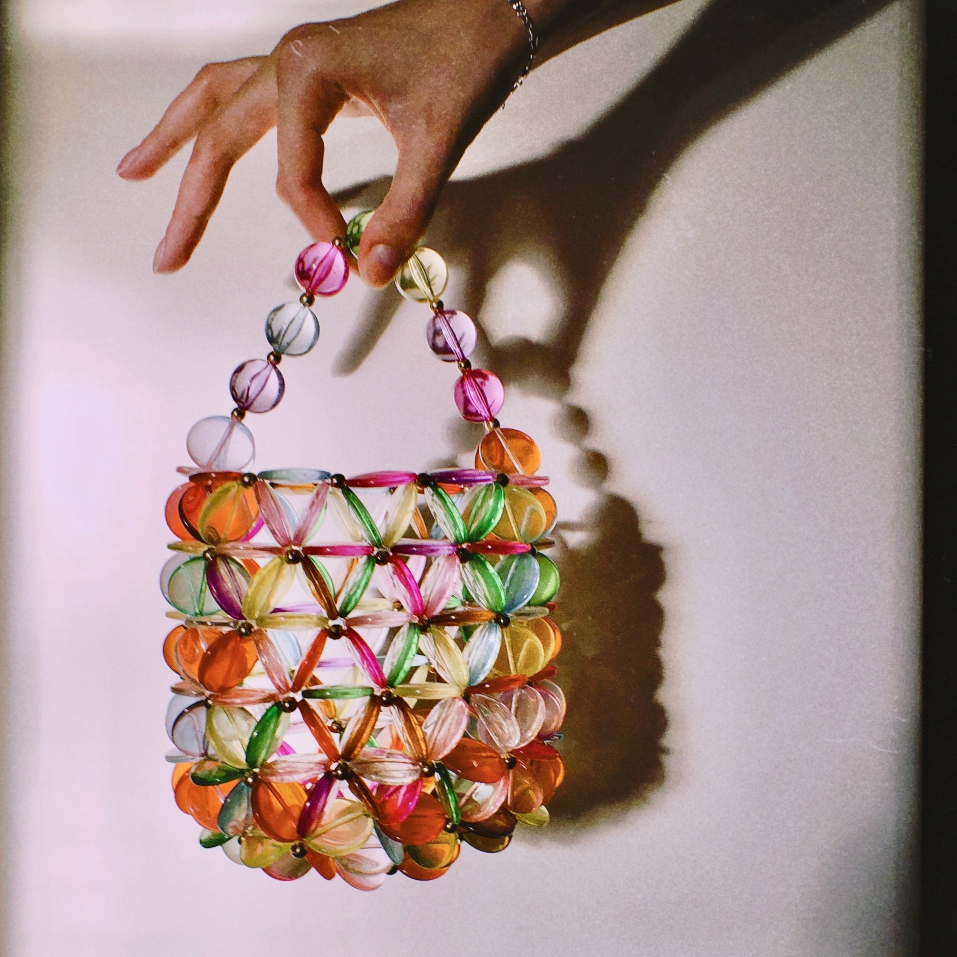 The body of this greyscale Kim Bucket Bag is made up of flatback acrylic shells bedazzled with silver beads, and a unique handle.