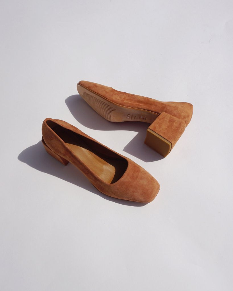 Square toe pump, suede leather. Heel covered in suede leather.
