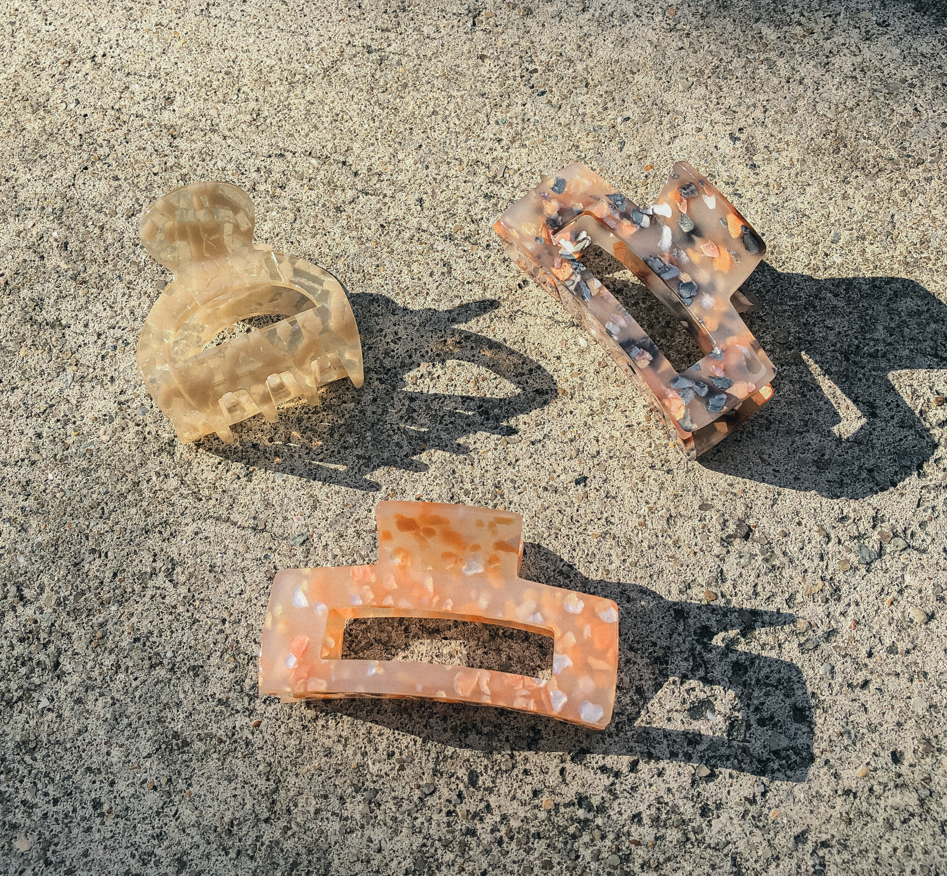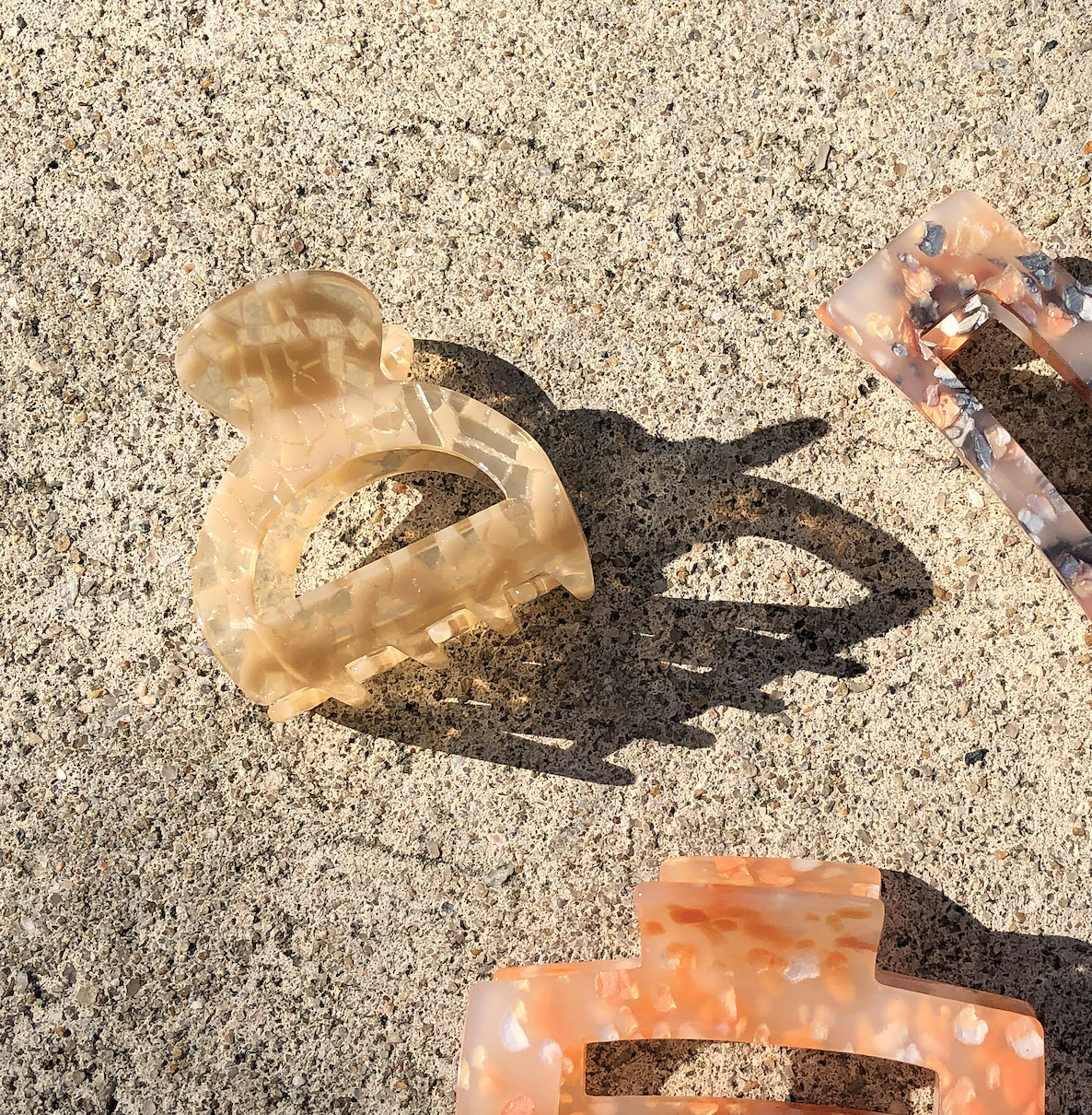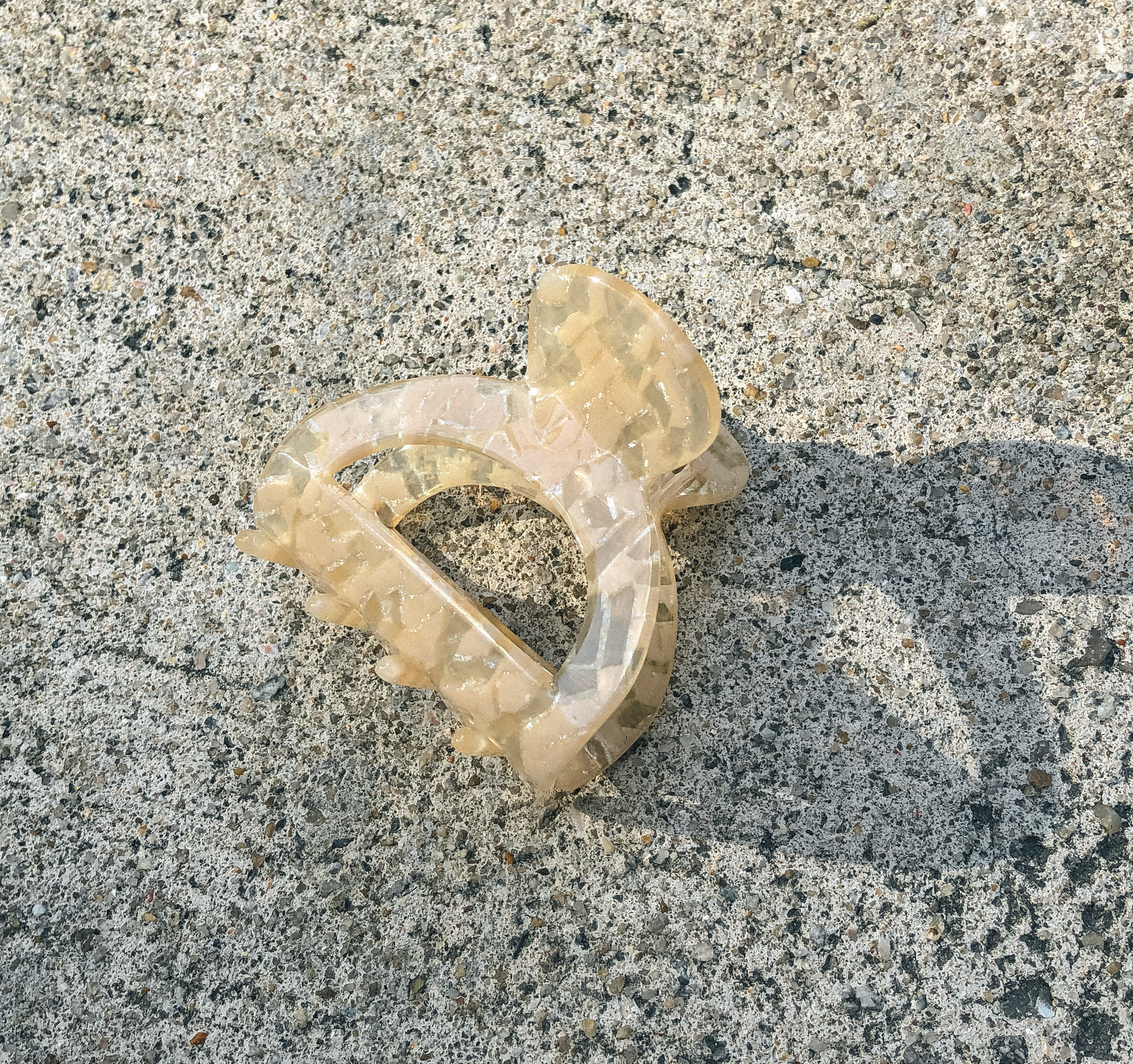The Creme Terrazzo Hemi Claw comes with a clear acetate body and cream shell pieces. This smaller clip is great for short to medium hair, as well as half up-dos.