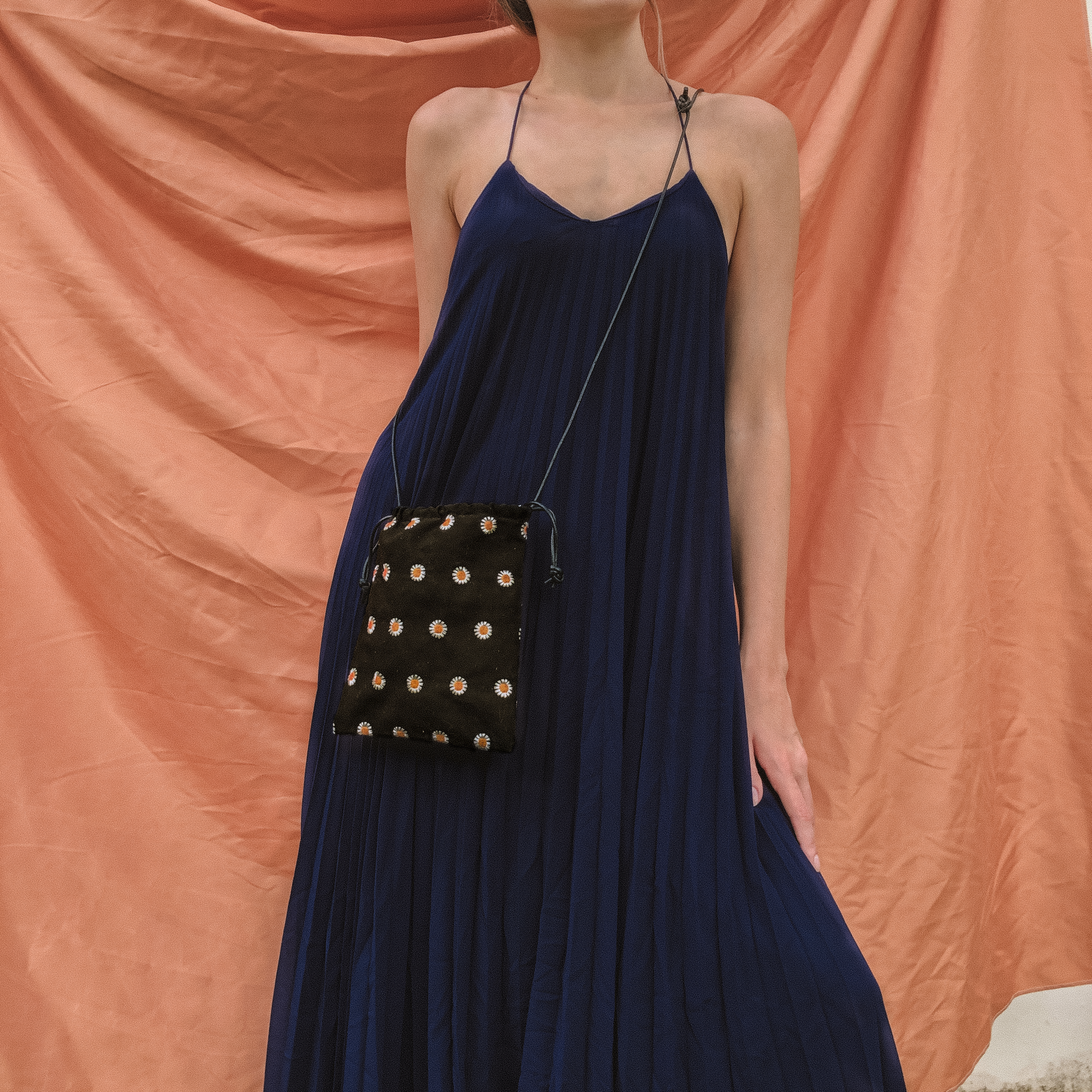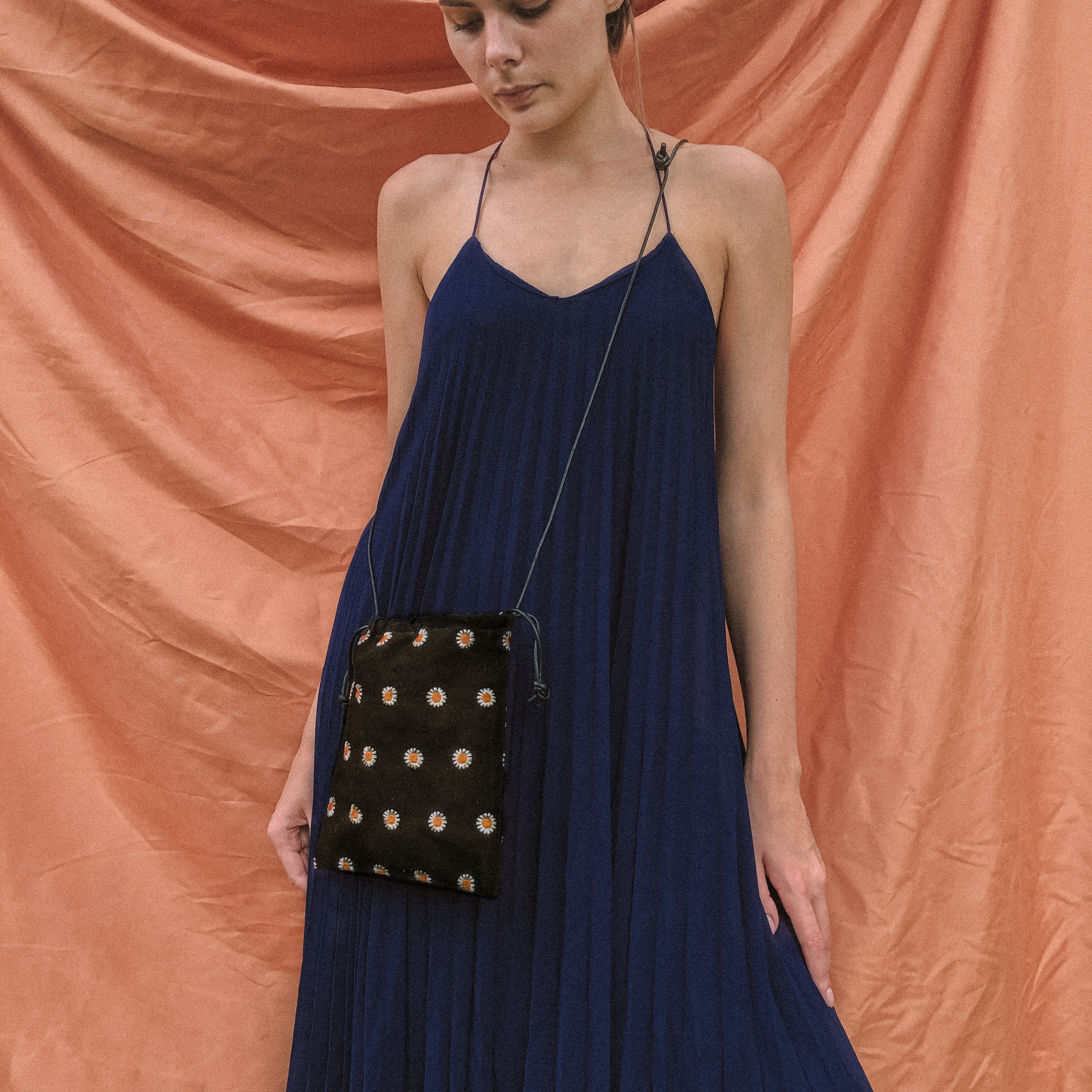 This drawstring sling bag is embroidered with little daisies all around. Functions as both a handy slingbag or pouch insert in your main bag, it is available in cream and black colourways.
