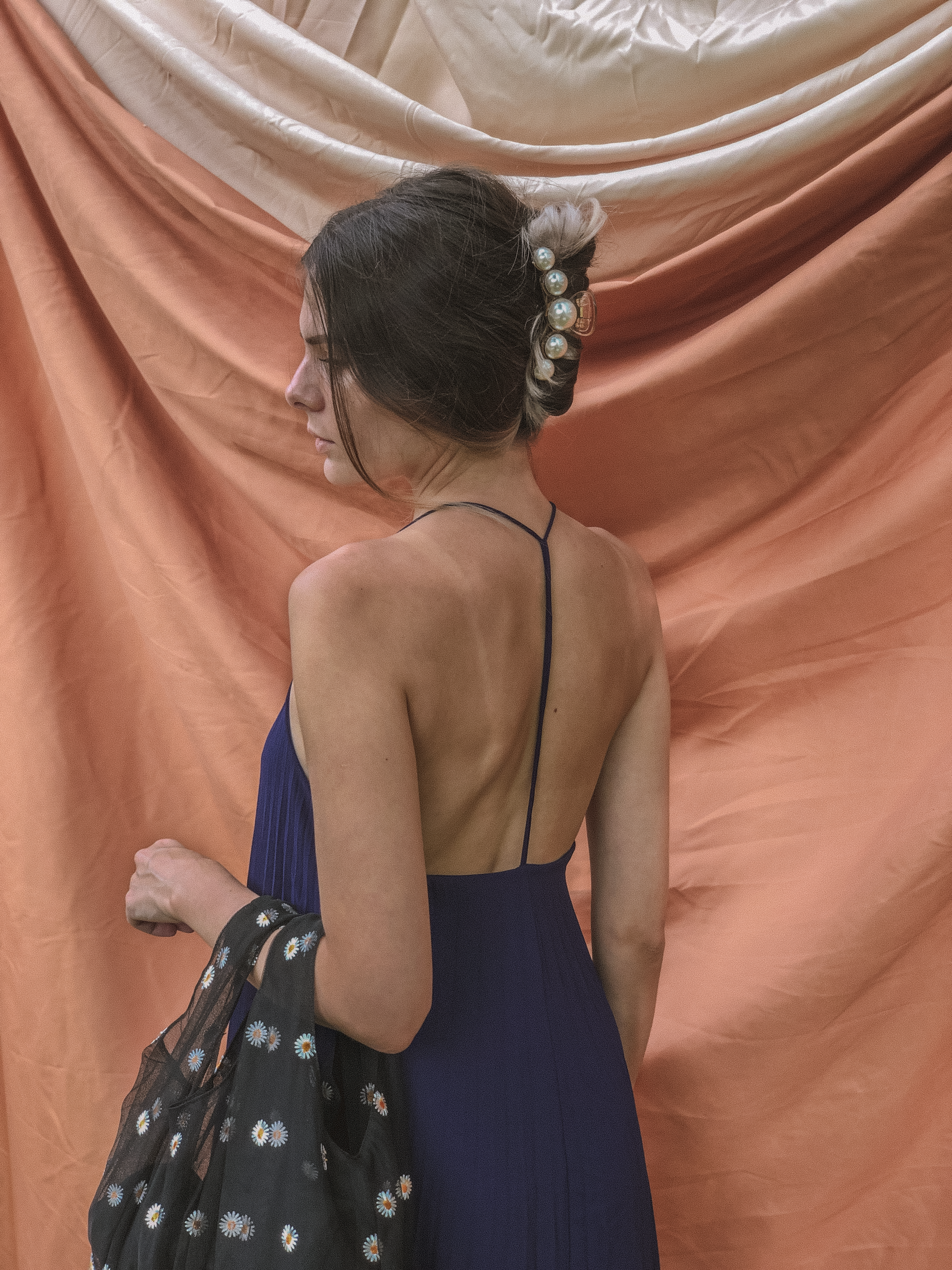 The Embroidered Daisy Mesh Bag is available in Bleu and Ebony.