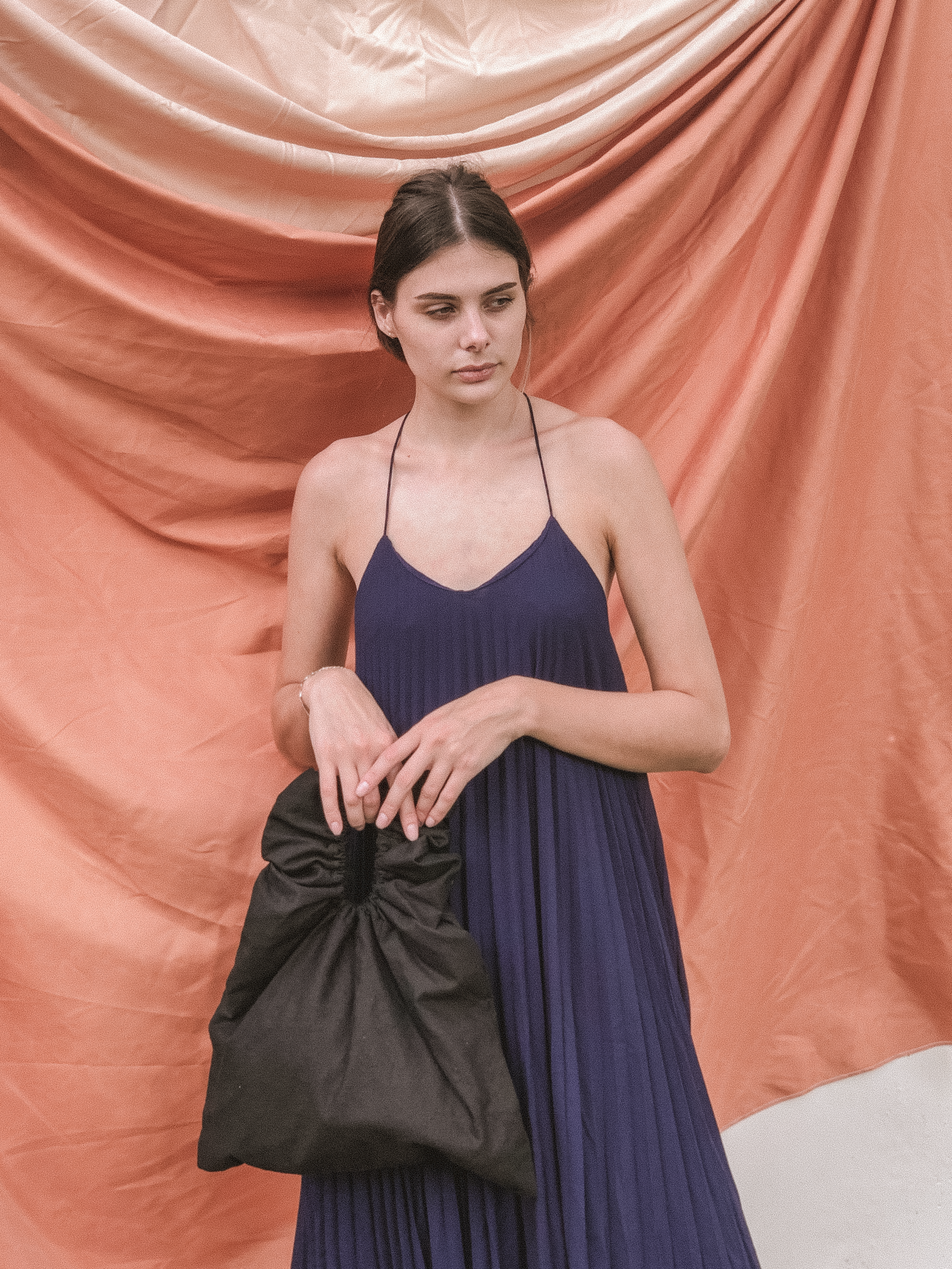 The Dumpling Bag is a beautifully ruched tote with an elasticated handle, and button closure. The Dumpling Bag is available in Black and White.