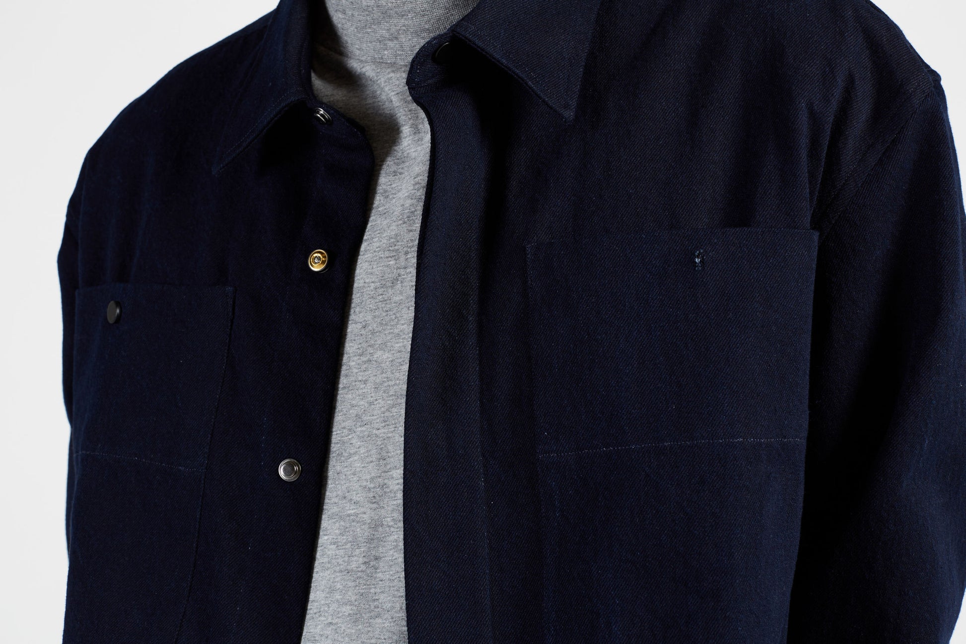 Regular fit indigo overshirt with two large snap buttoned chest pockets.
