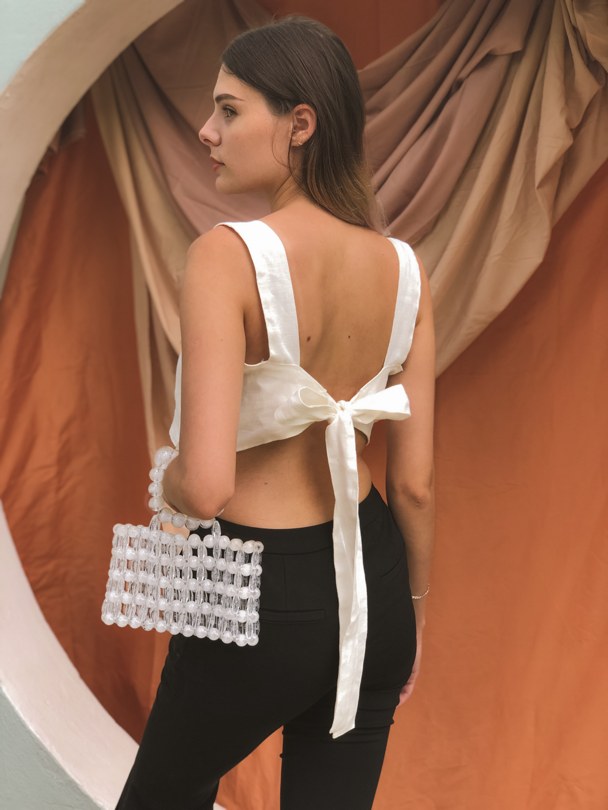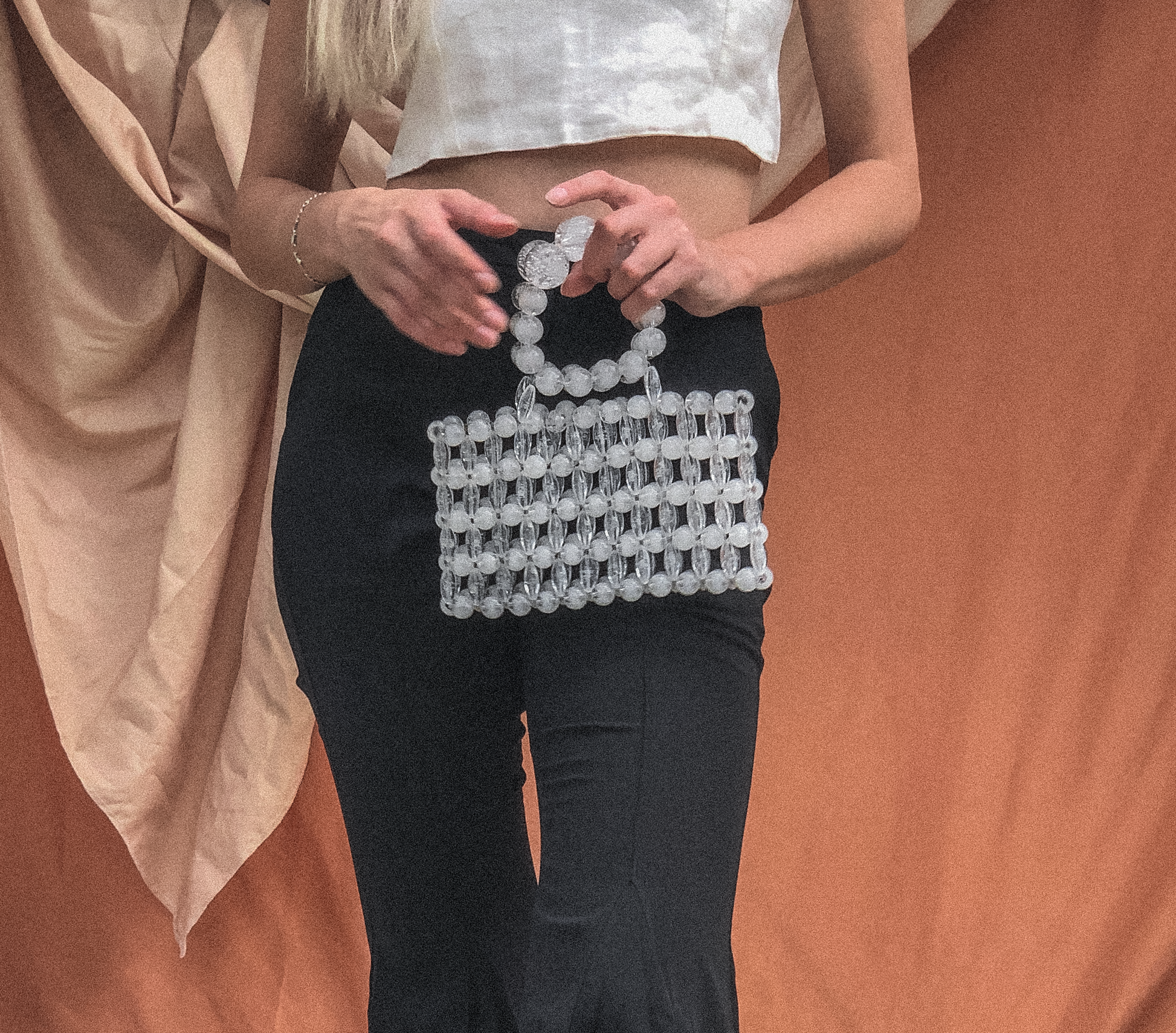 Beaded with large acrylic beads, this statement clutch is a great piece for any collection, going from a fancy night out to brunch. Comes with a drawstring bag to keep your belongings snug.