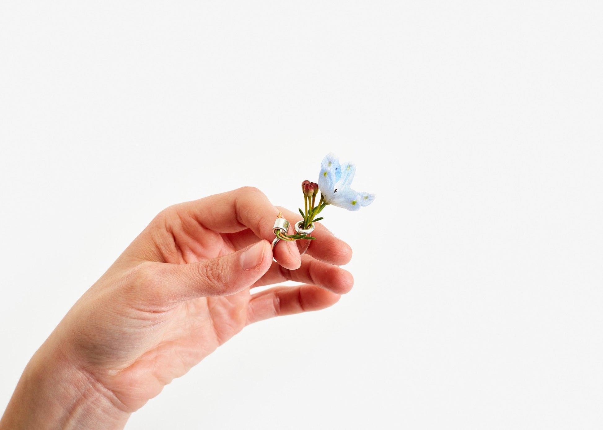 The Ikebana Ring is a sterling silver ring that holds a small bouquet of wildflowers. Ikebana is the Japanese art of floral arrangement, based on a philosophy of developing a closeness with nature. Insert a flower stem and wind it around the ring to create your own arrangement. The ring was designed by Gahee Kang for whatnot, a class at the School of the Art Institute of Chicago.