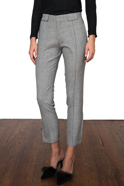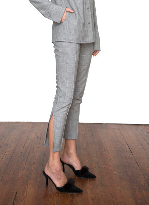 The Houndstooth Jacobsen Cigarette Trousers are high-waisted with a skinny (but not tight) fit and a pintuck detail down the centre of the leg. They feature a 9" slit from the hem with a silver ring trim detail at the top of the slit. The belt loops are 2.5" wide