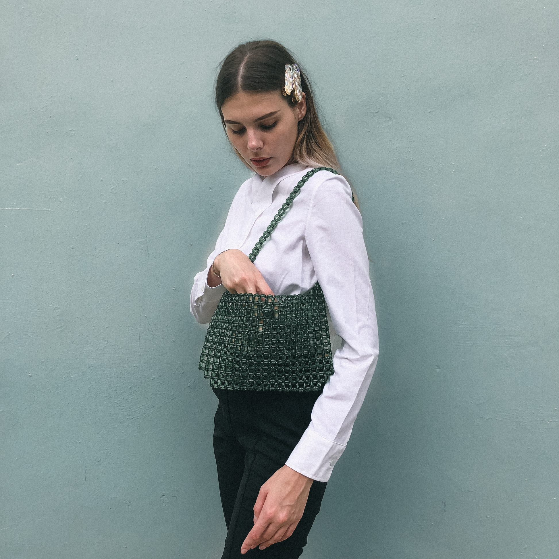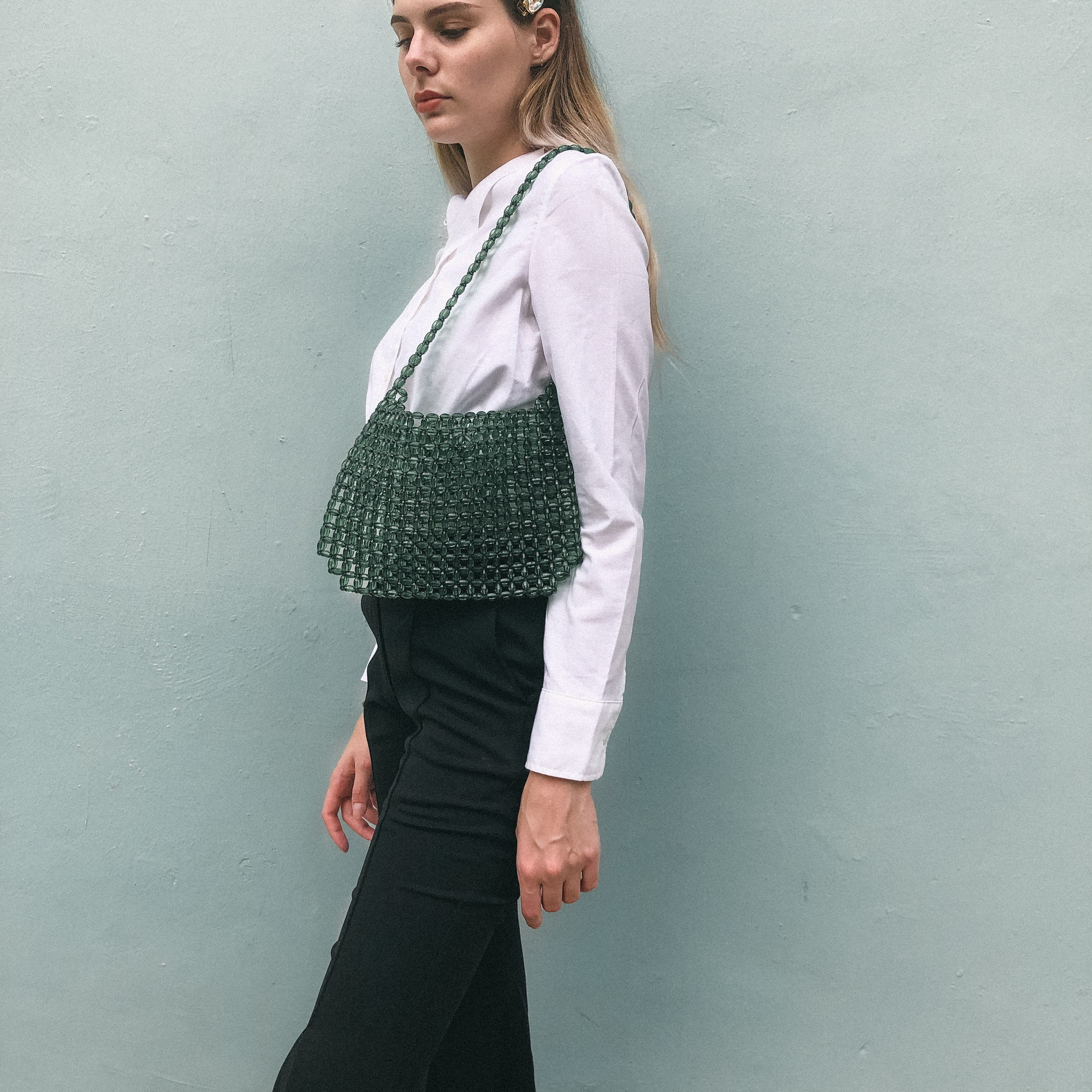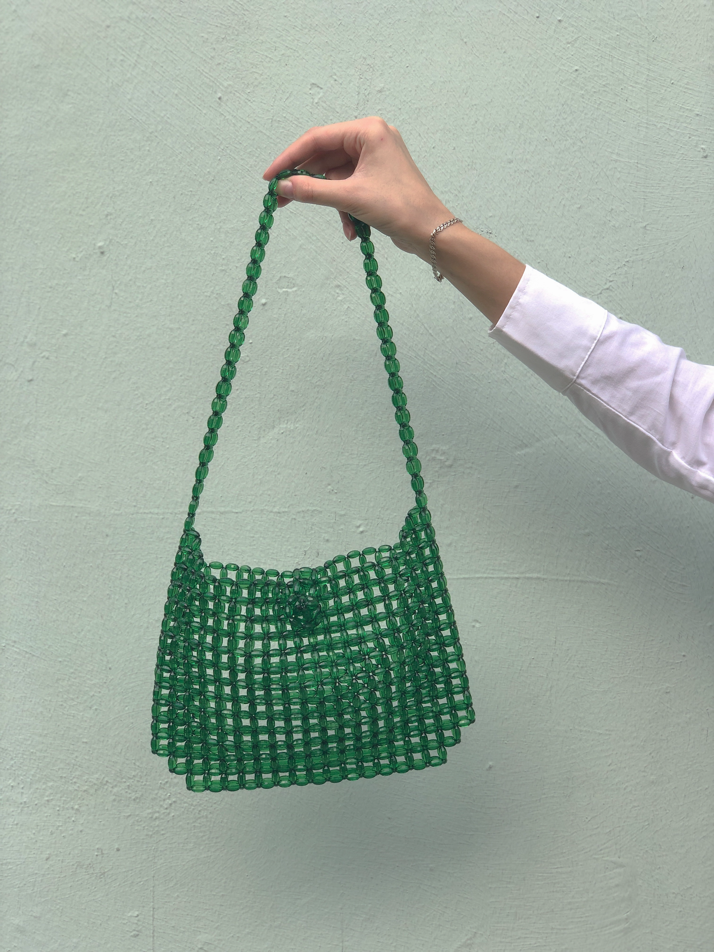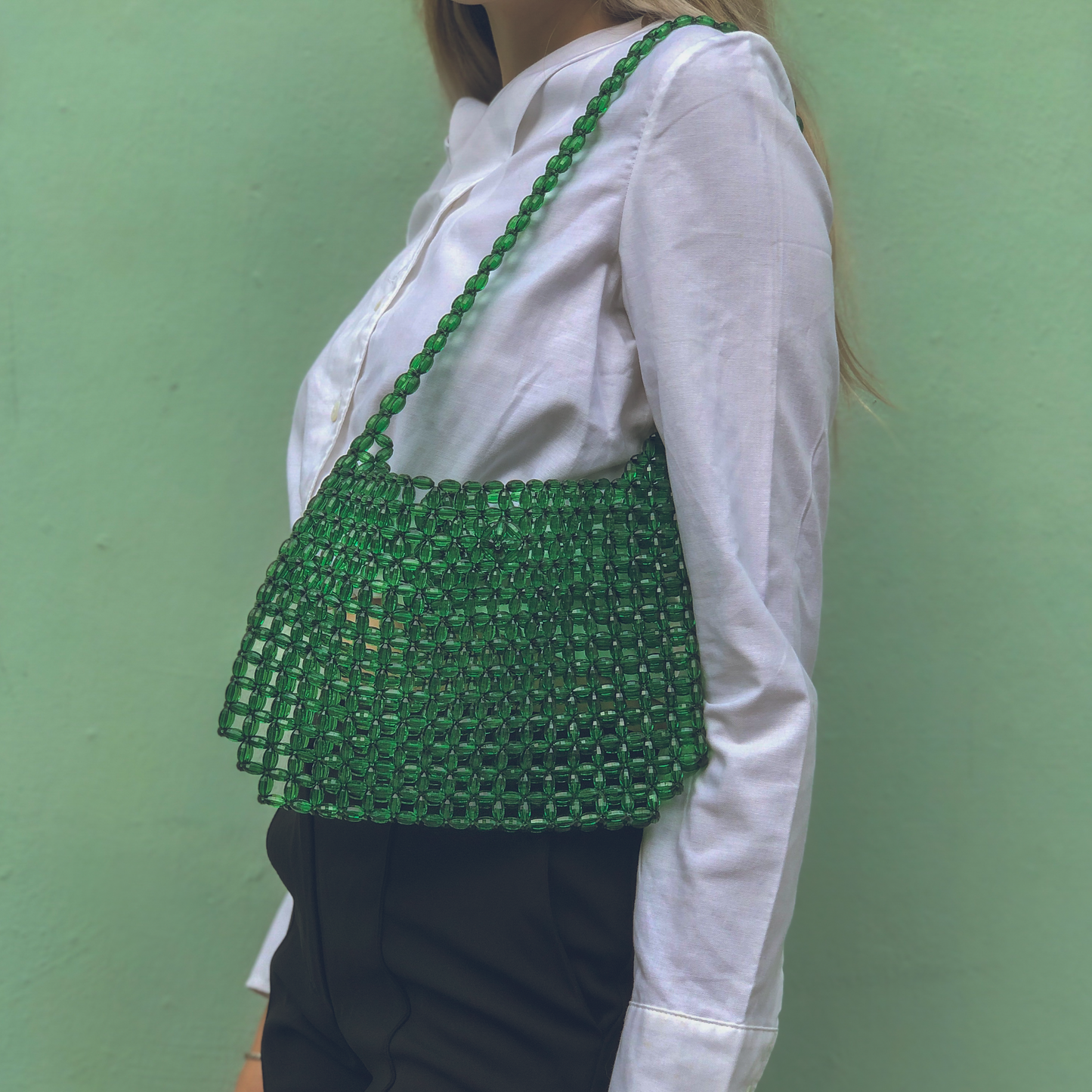 Beaded with jade green glass beads, this roomy handbag is a great piece for any collection, goes from brunch to the beach. Comes with a beaded closure and drawstring bag to keep your belongings snug.
