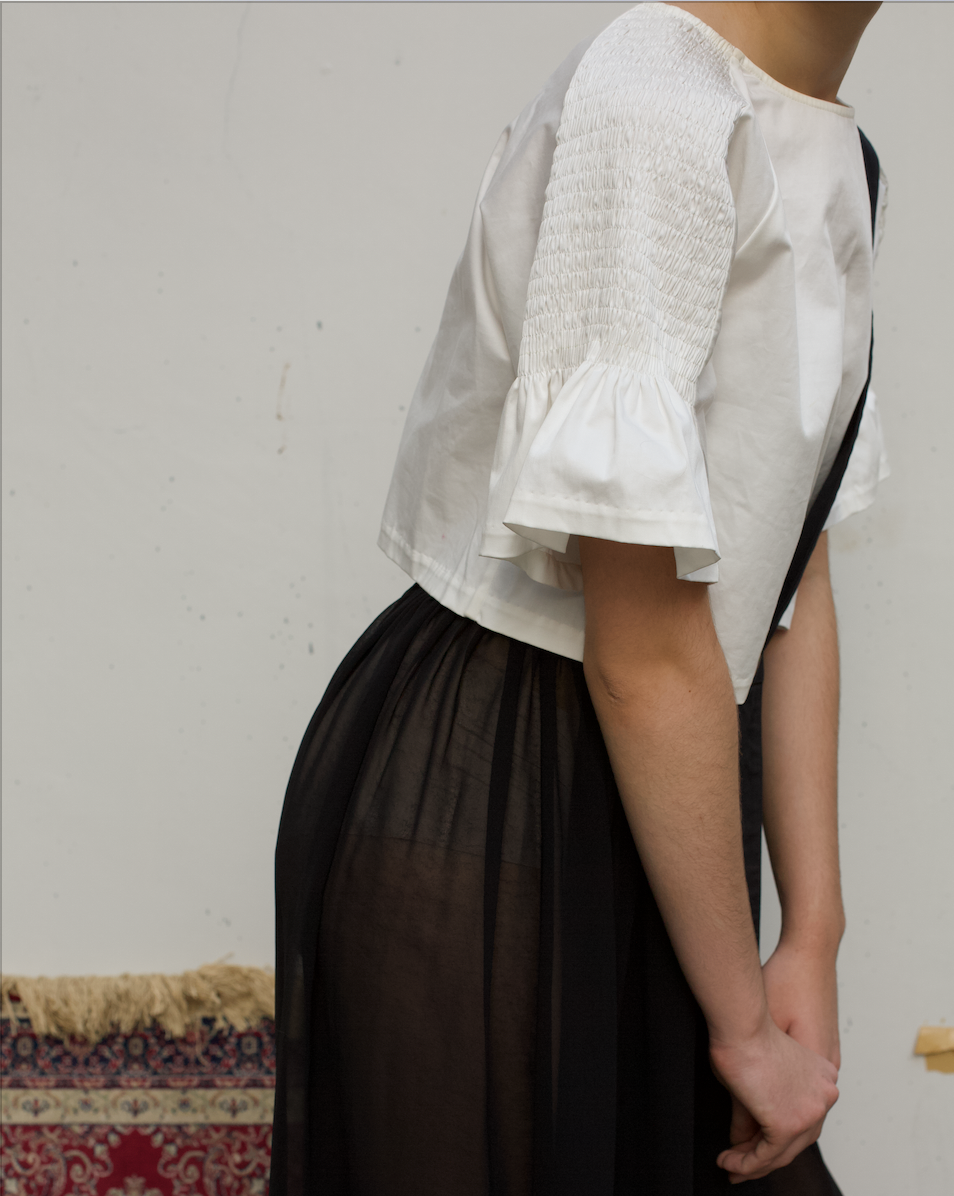 1. A rounded neckline cropped top with smocked sleeves from Ultramarine Studio