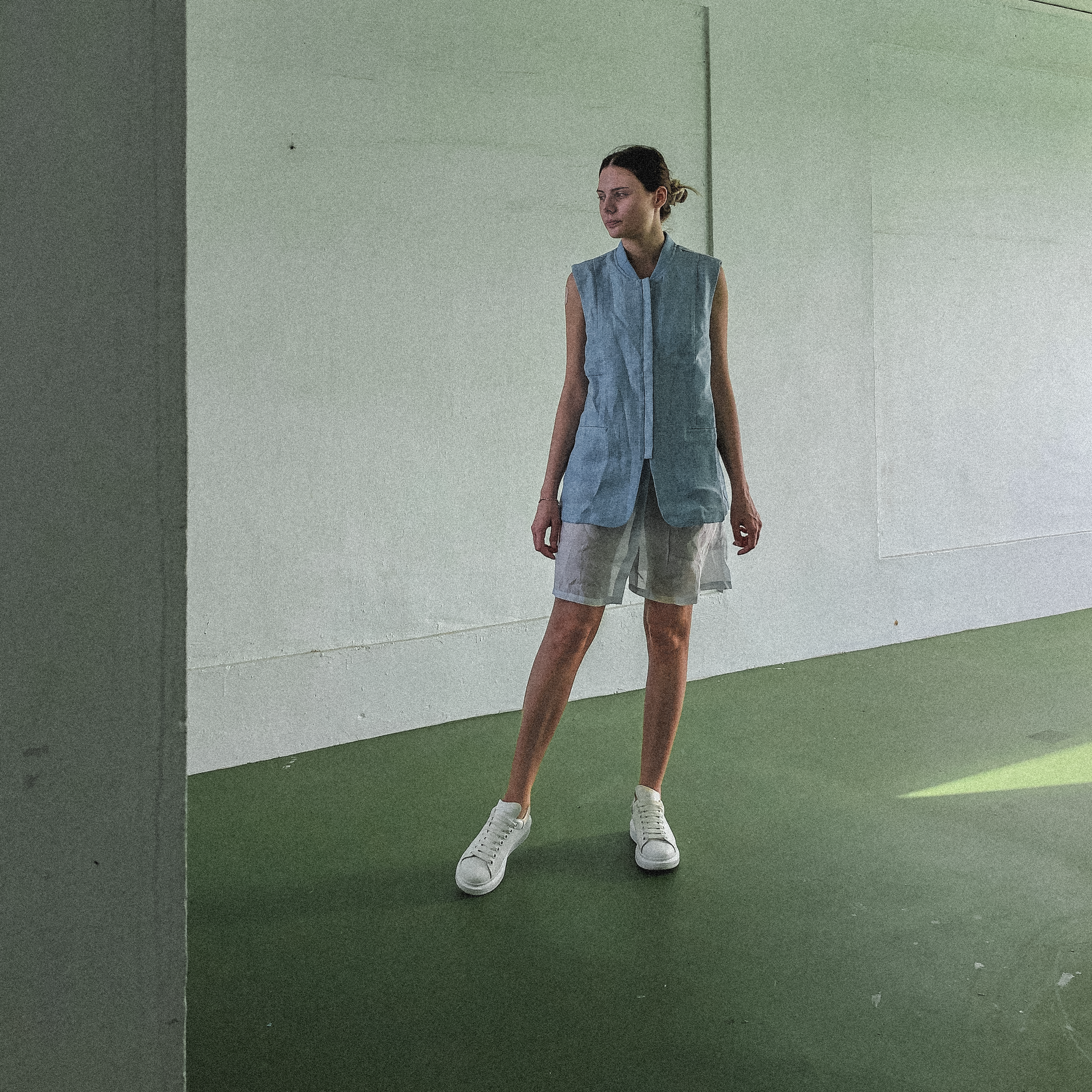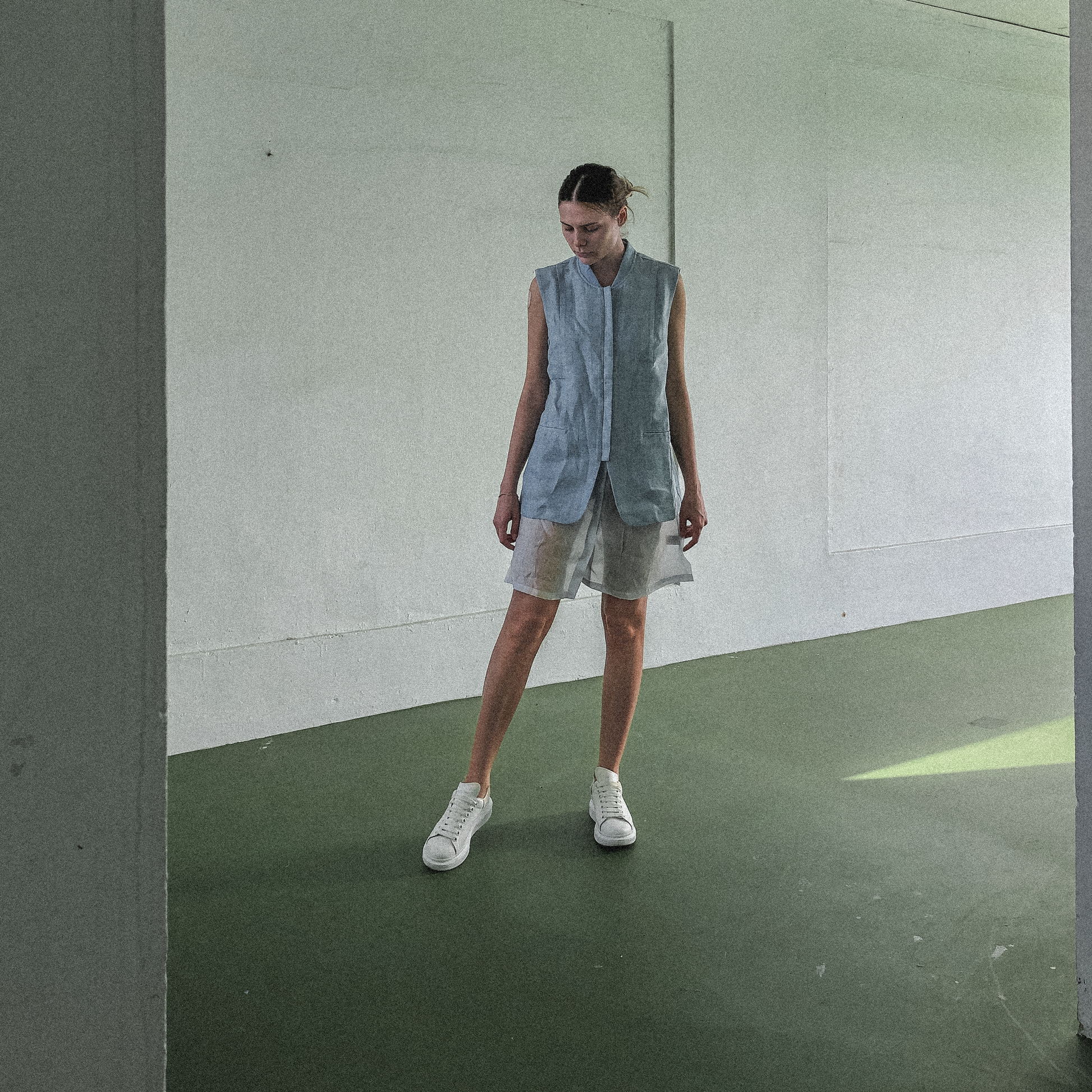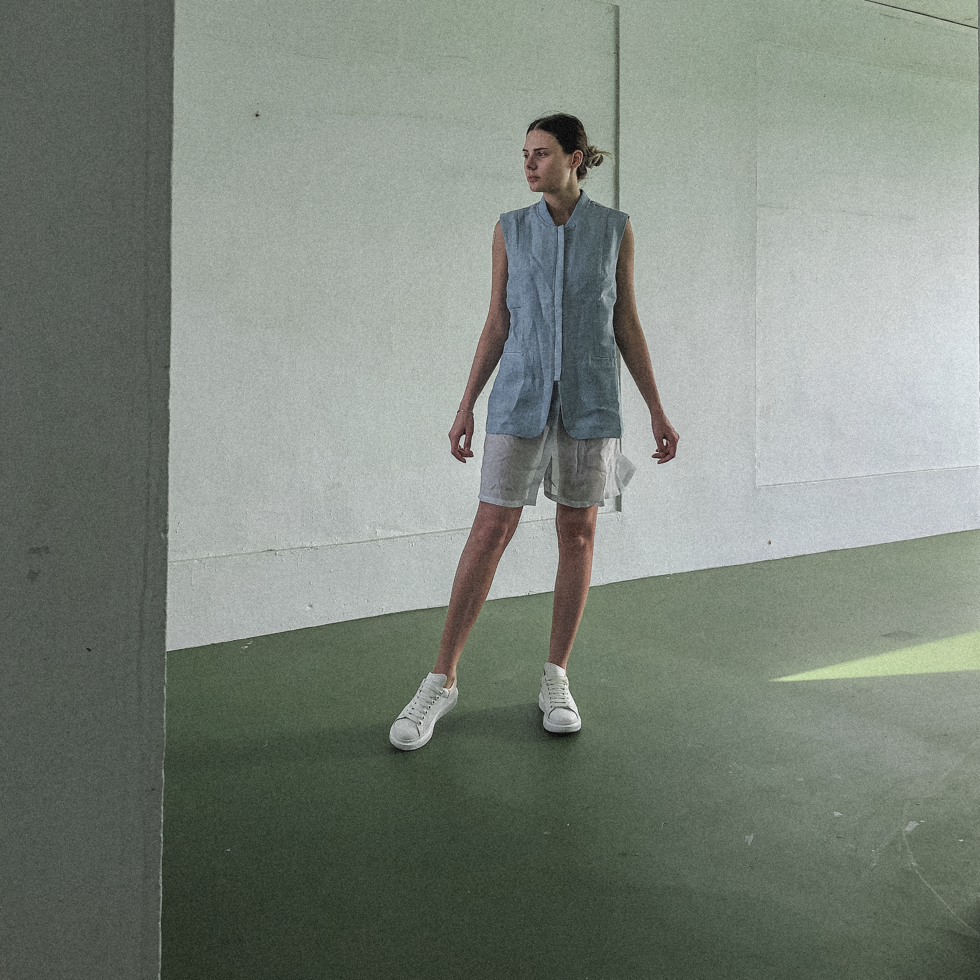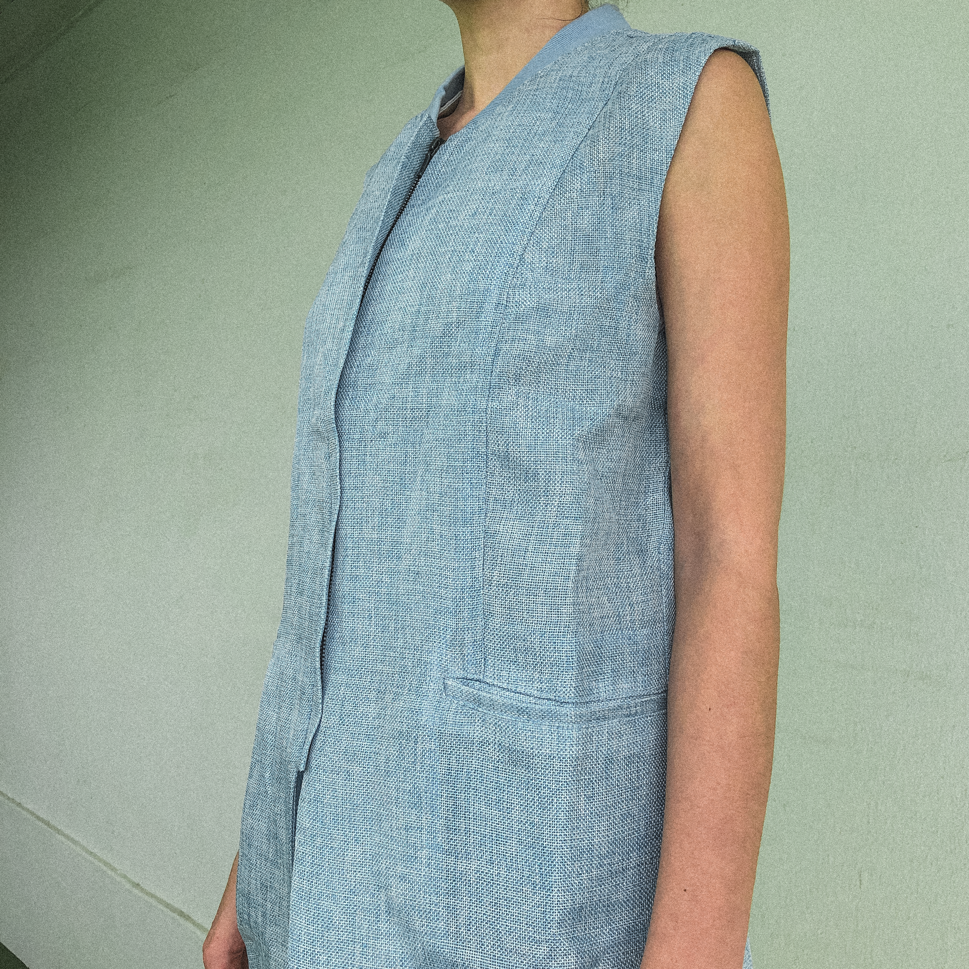 A longline zip-up vest with 2 front pockets. Wear as a outwear or as a top (pictured). Available in blush or teal.