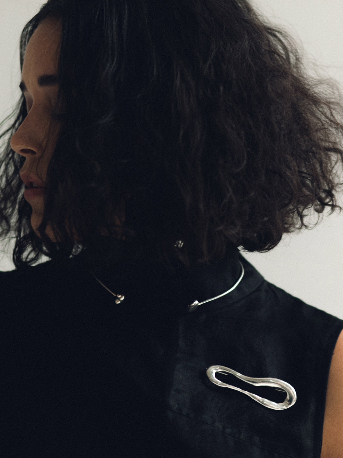 An asymmetrical and sculptural pin, perfect for a lapel or sweater closure.