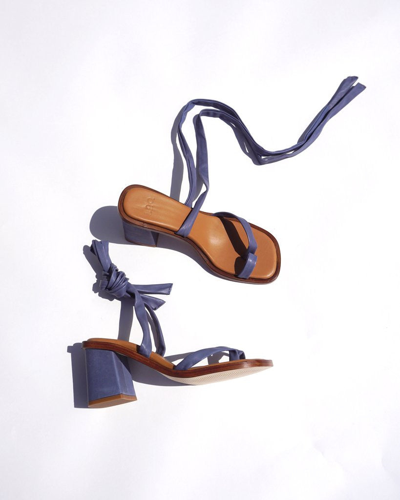 Lamb leather wrap sandal with leather covered 2 3⁄4 inch heel.