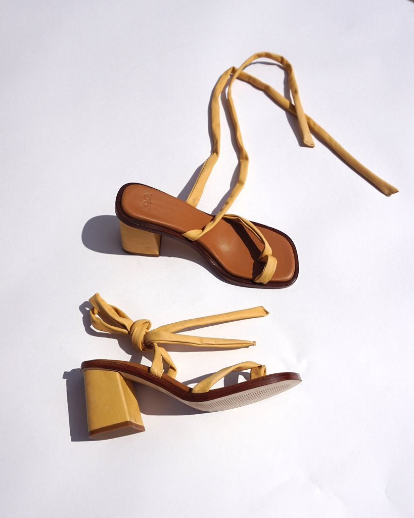 Lamb leather wrap sandal with leather covered 2 3⁄4 inch heel.