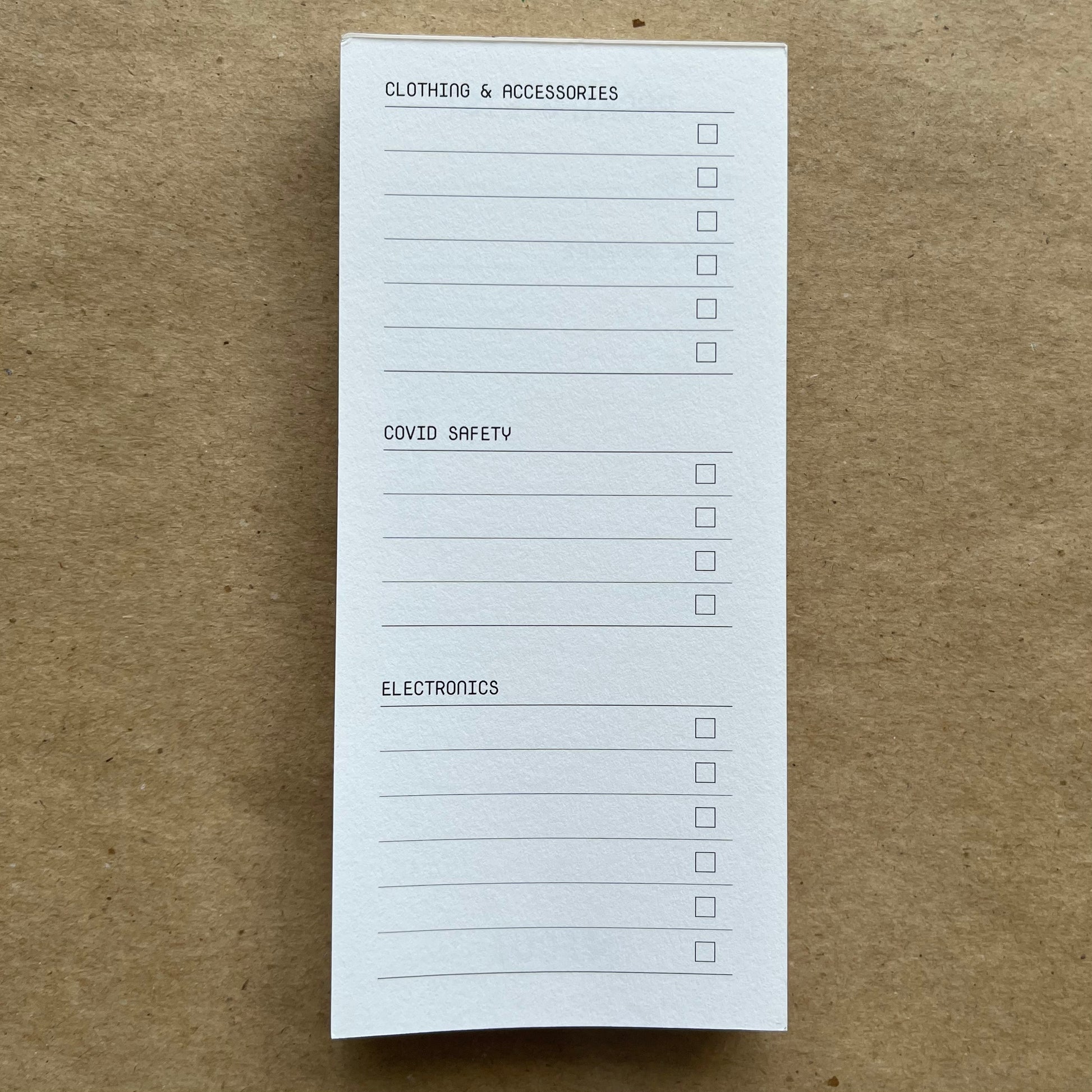 A handy little checklist with organised subsections for easy tracking, great for travel or day to day bag organisation.