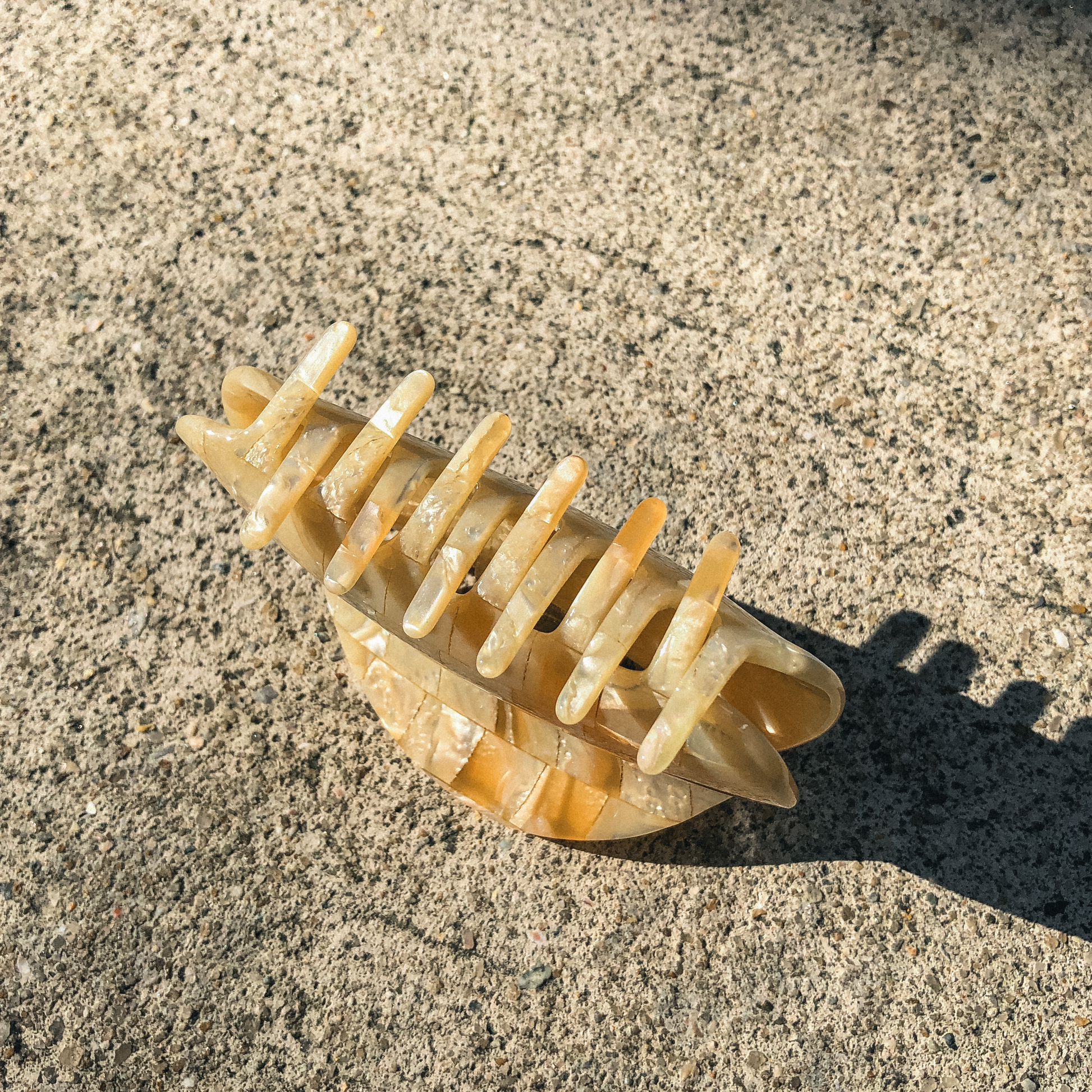Made with biodegradable acetate, this collection of neutral toned hair claws come in a variety of finishes. Each hairclaw is handmade, patterns & measurements will slightly vary according to batch.
