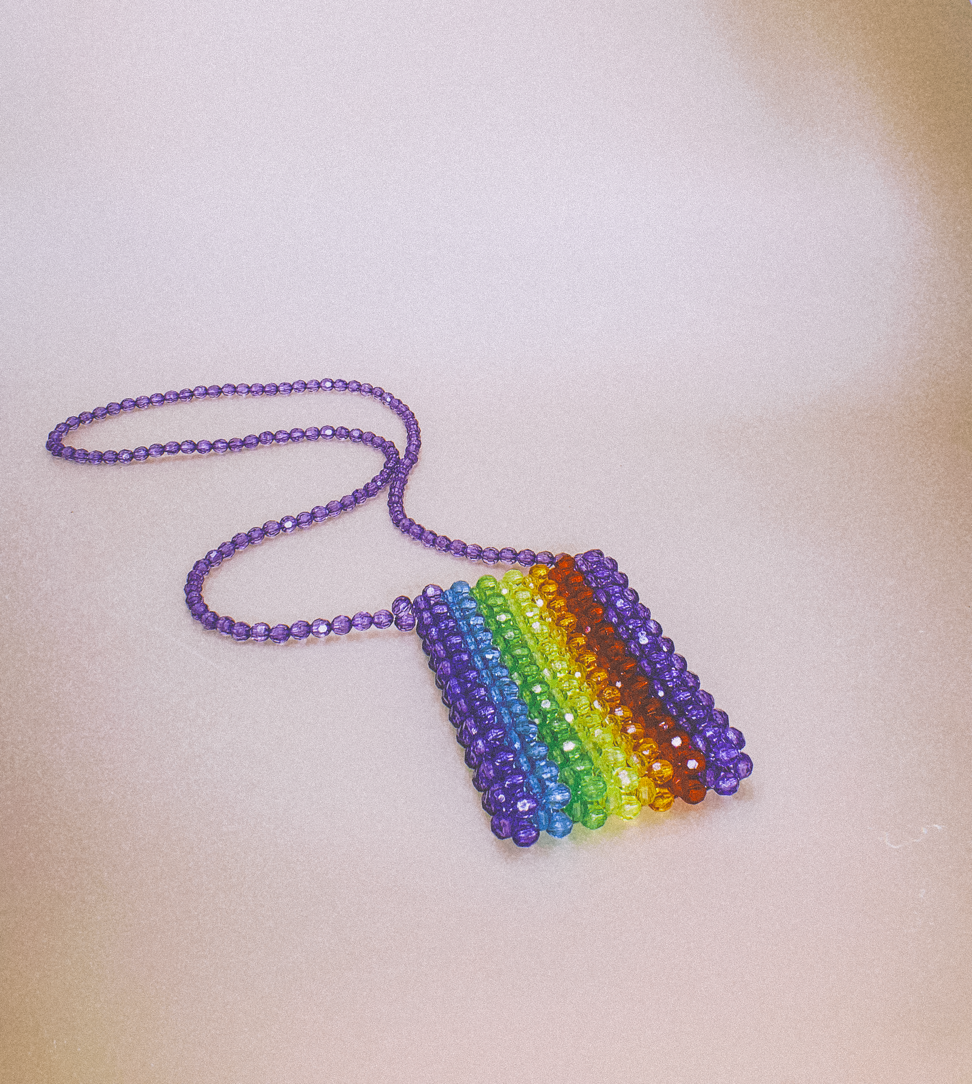 Channelling the best Lisa Frank 90s vibes with this fun beaded rainbow phone sling. The Lisa Phone Sling is handmade with rainbow crystal beads, and comes with a handy crossbody strap.