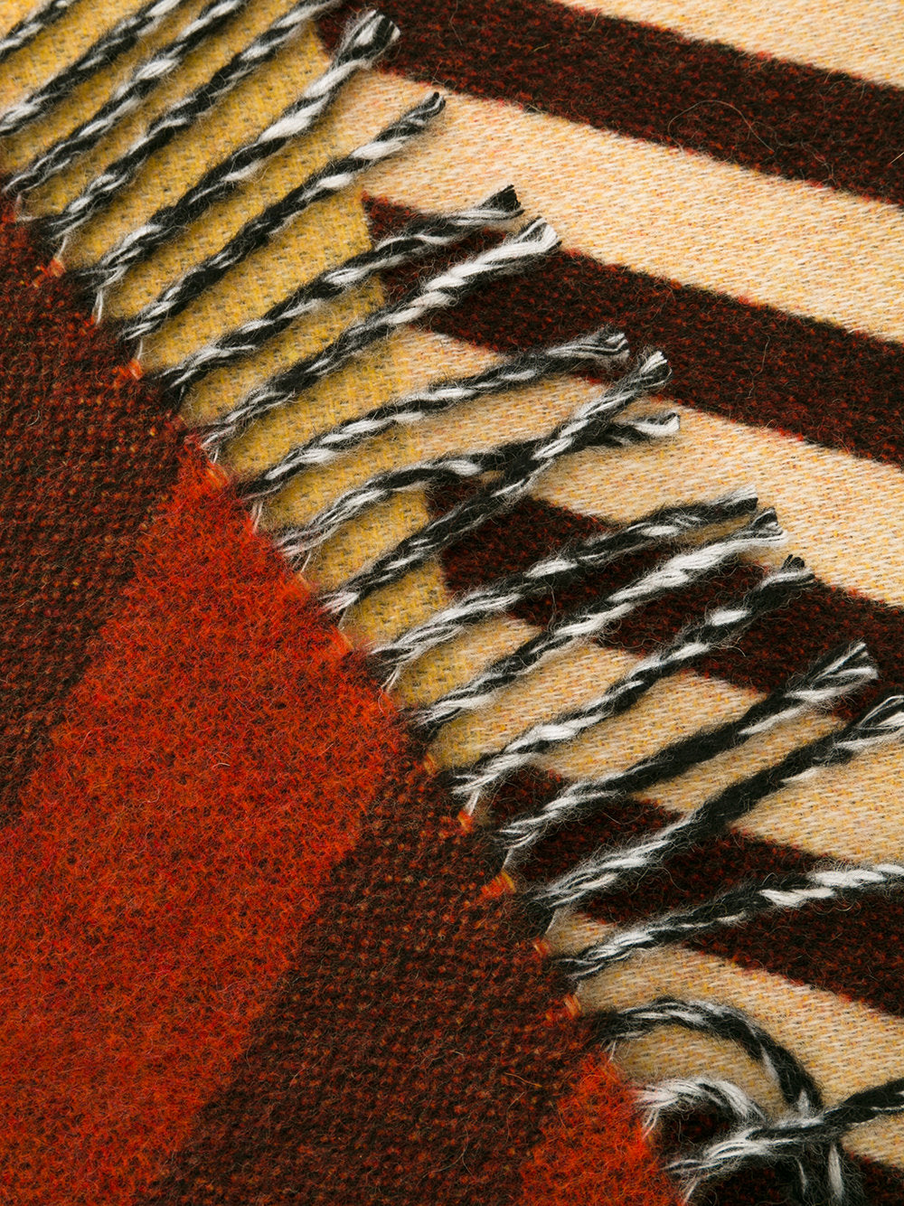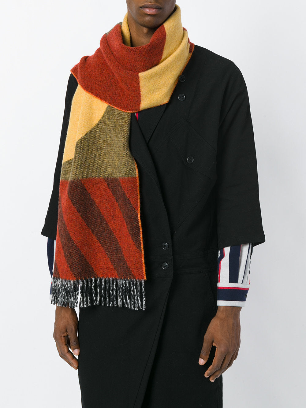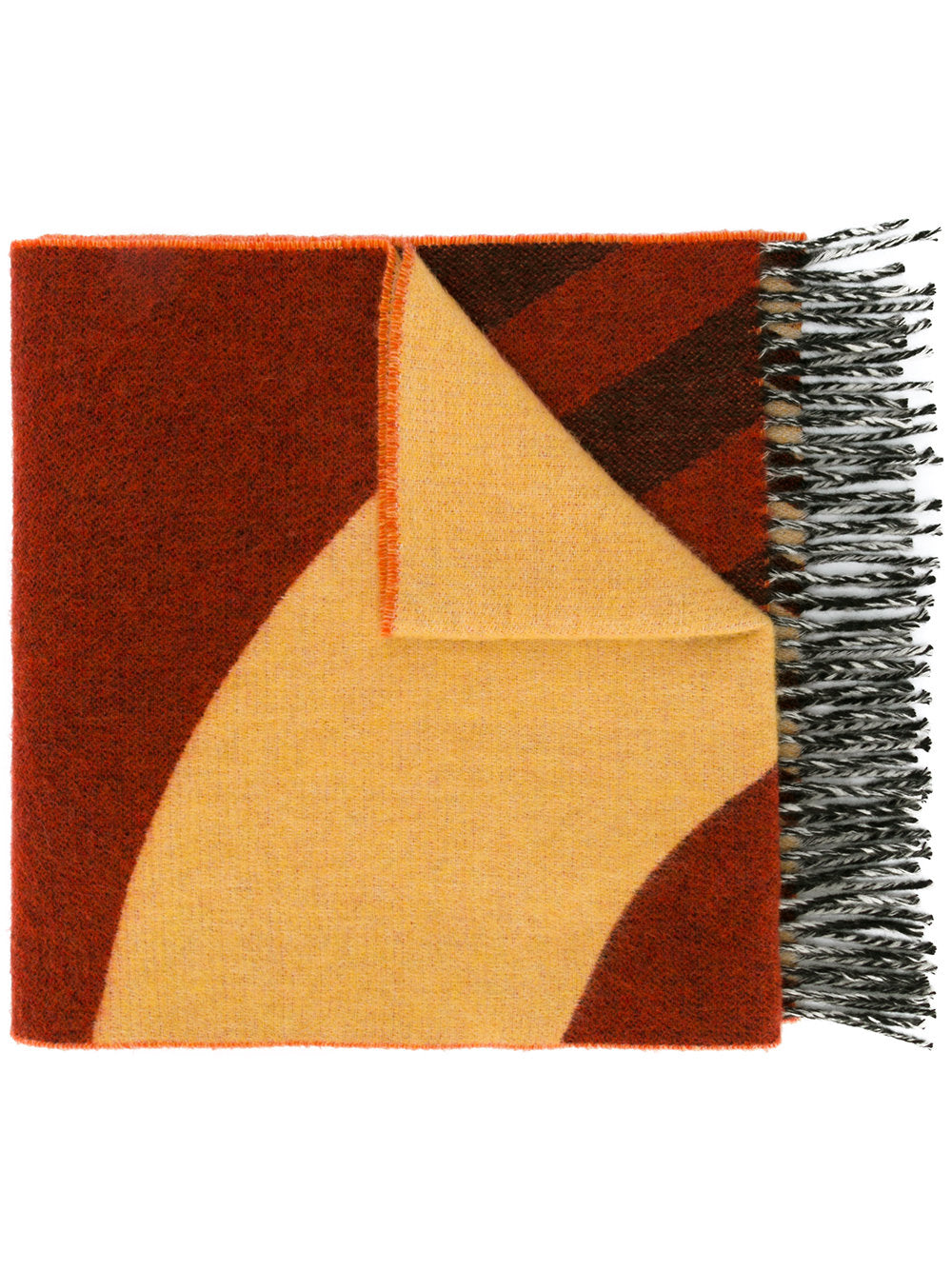 Henrik Vibskov Whoop Scarf. Blue and red virgin wool scarf with geometric pattern throughout and fringe trim.