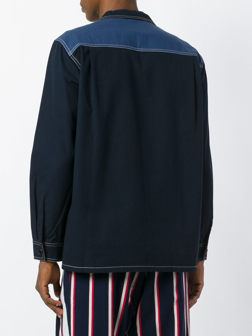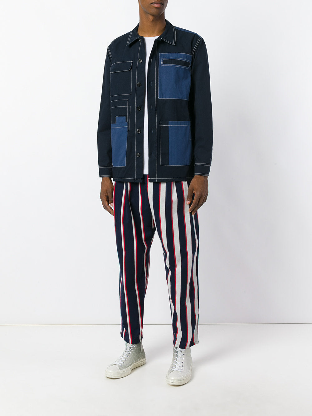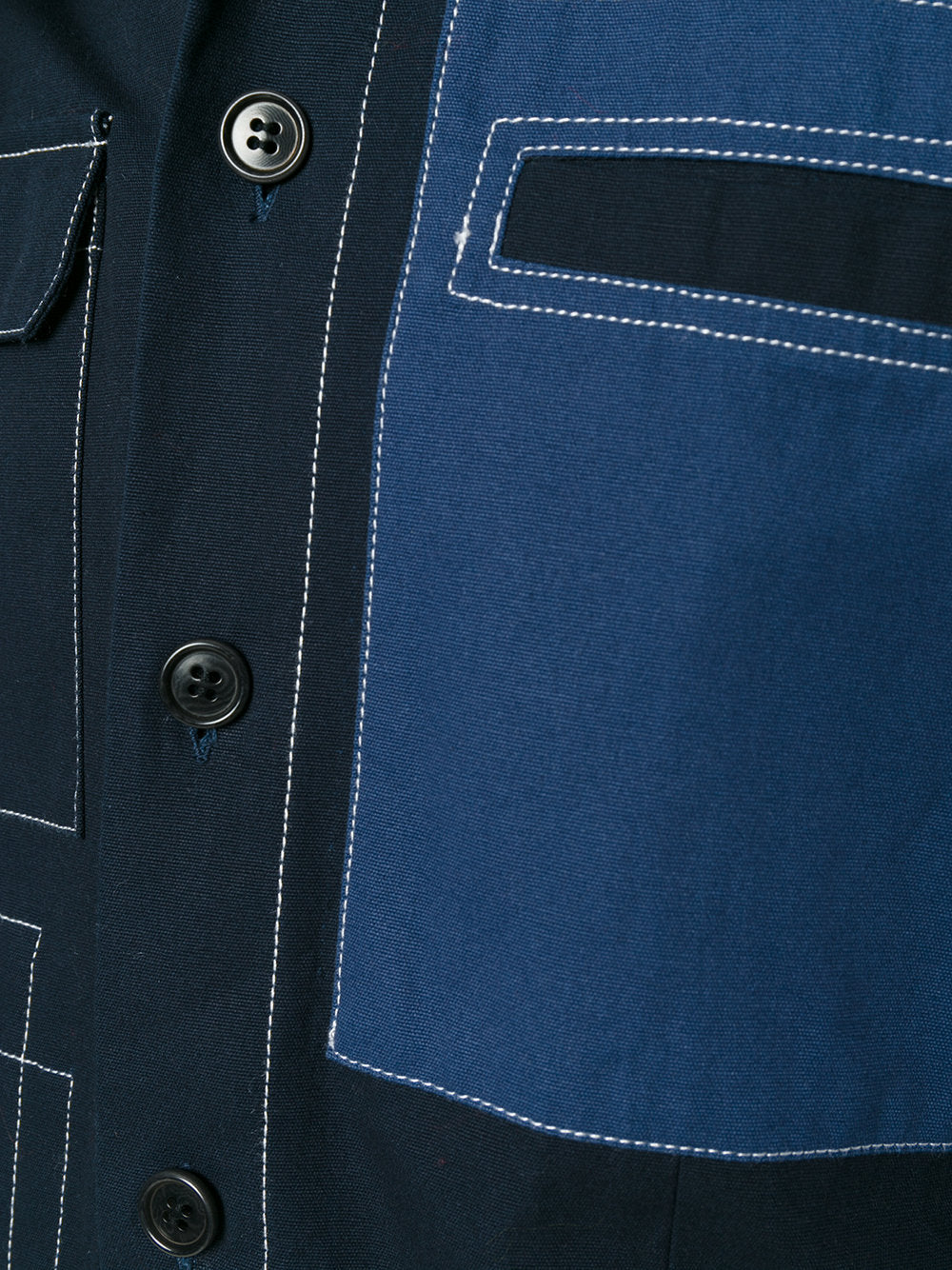 Hard-working canvas gives this high-concept shirt jacket a familiar feeling, but with loads of personality. Two tones of blue and prodigious patching reimagines workwear as designer sportswear. Leave it open over graphic tees and jeans to give weekend looks a bold update.