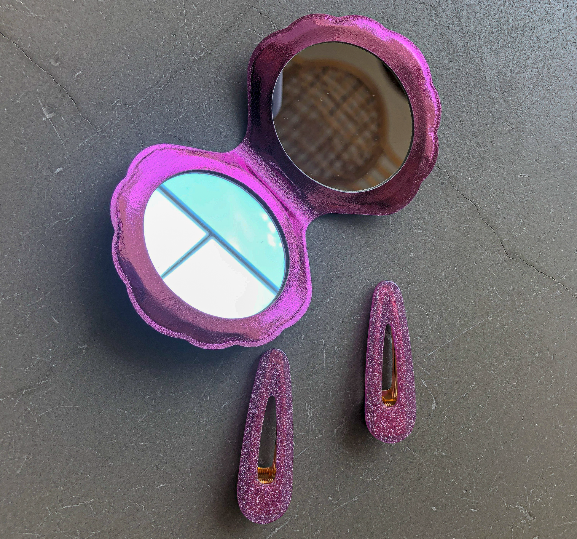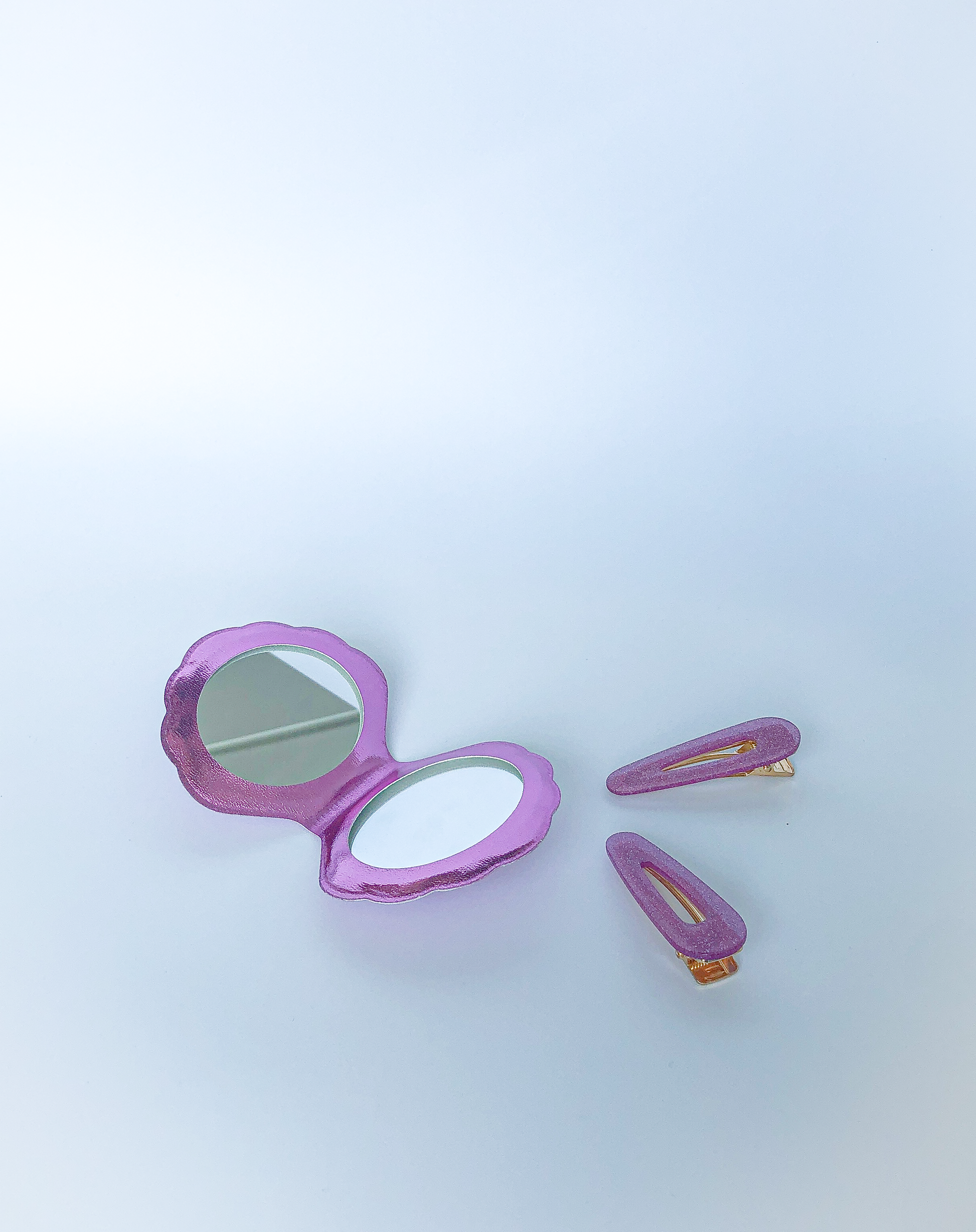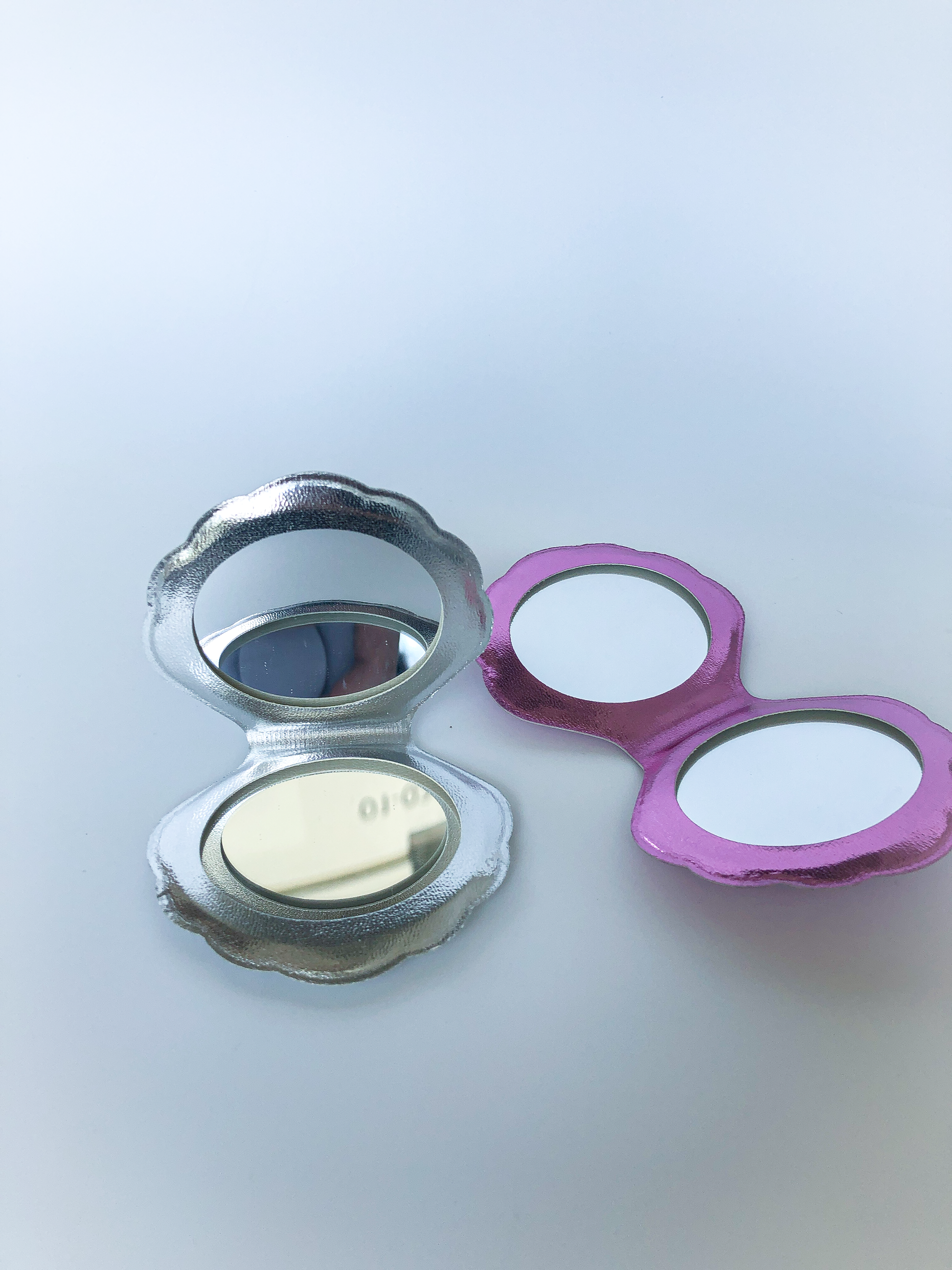 This double sided mirror comes with 1 regular surface and 1 magnifying surface. Great to have handy in your everyday bag for touch ups or by your work station for those Zoom meetings. Available in Holographic Silver or Pink.