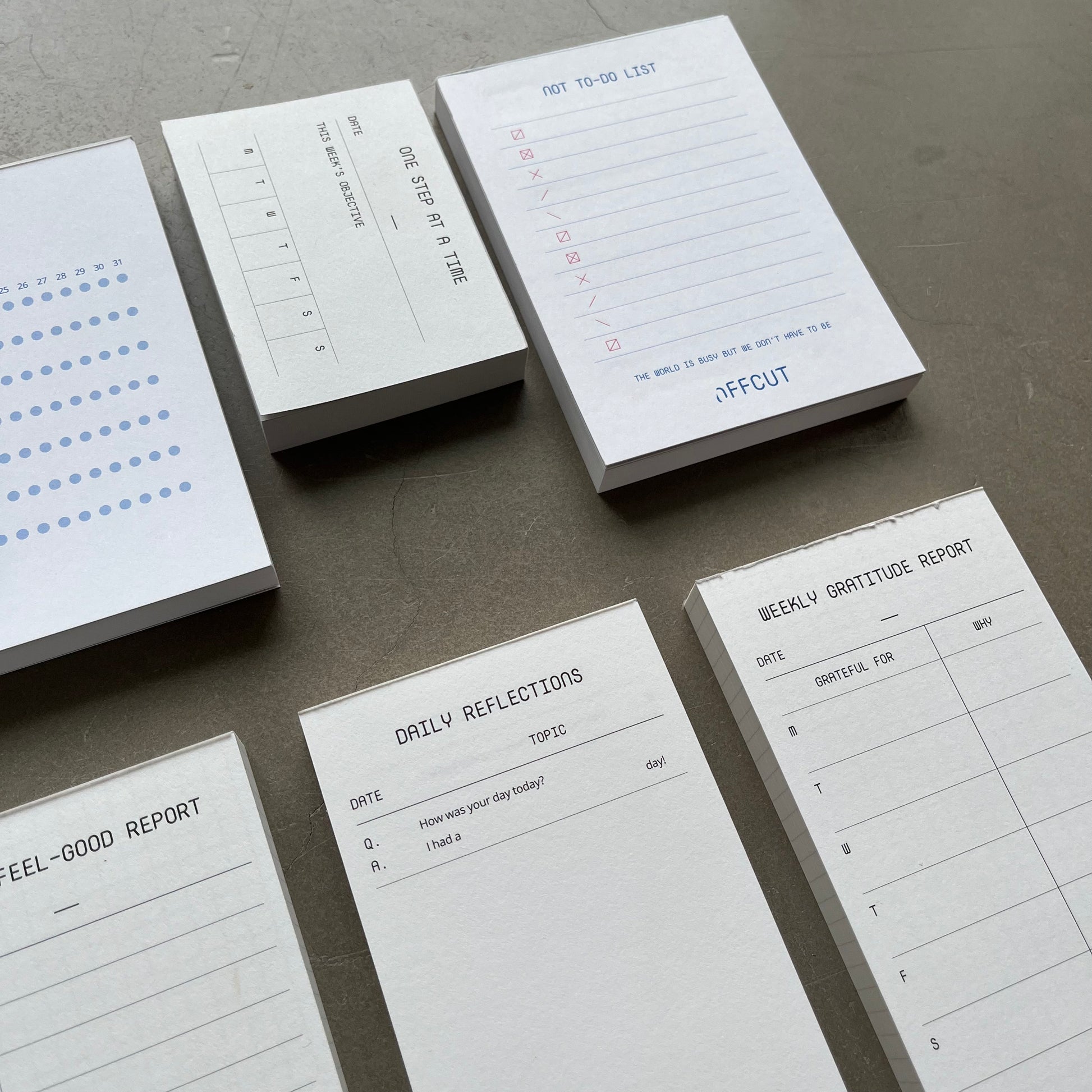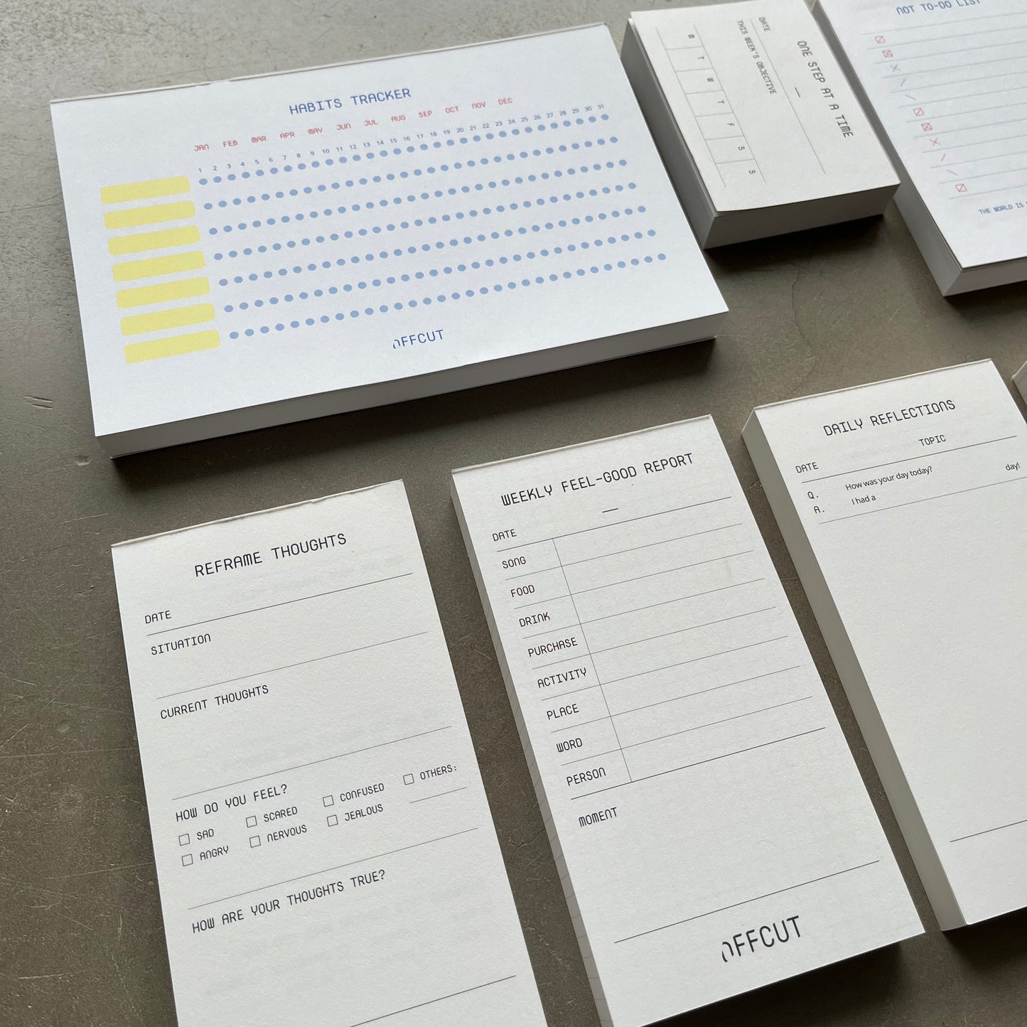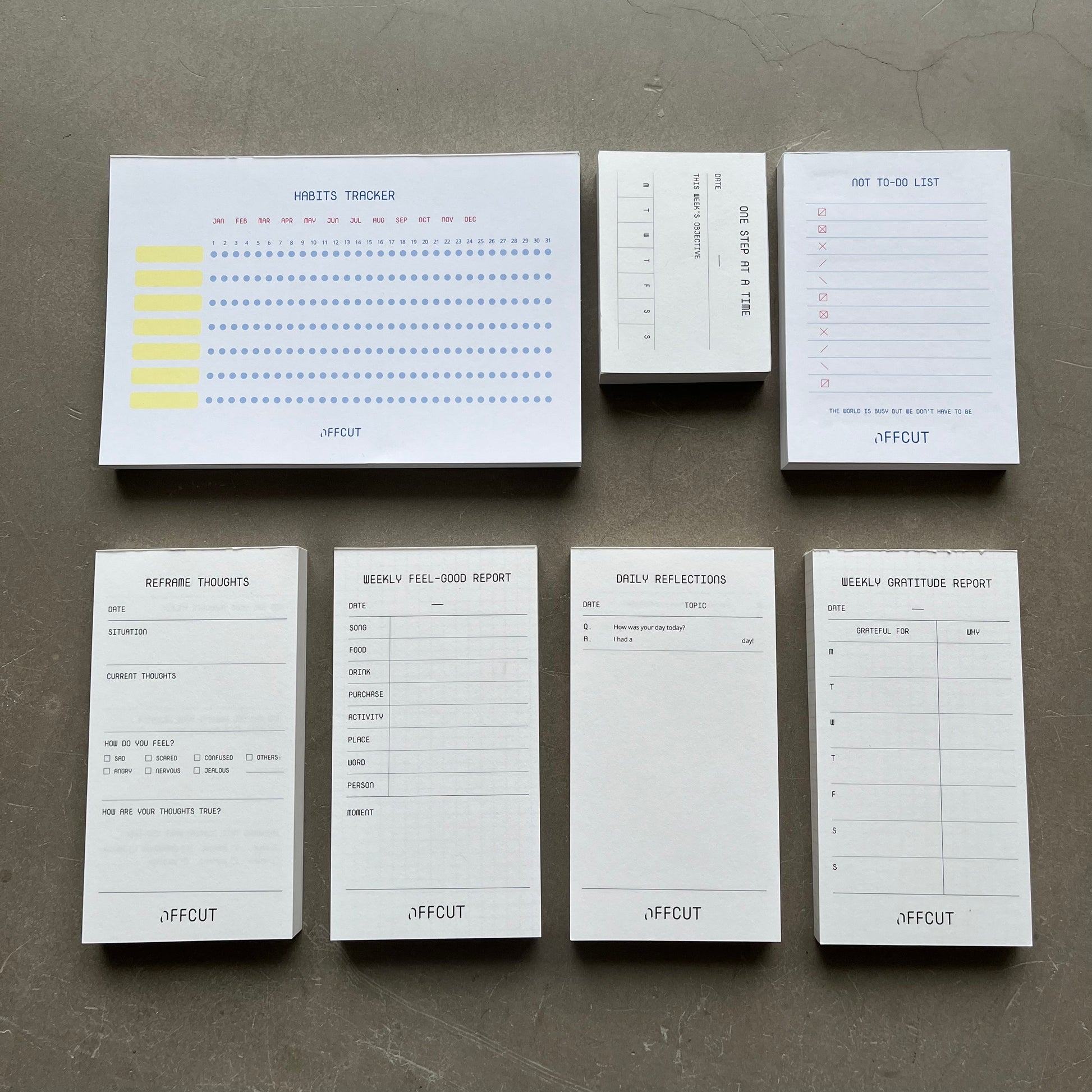 This 7 piece bundle consists of 1 Habits Tracker, 1 Not To-Do List, 1 Weekly Gratitude Report, 1 One Step At A Time, 1 Reframe Thoughts, 1 Weekly Feel-Good Report and 1 Daily Reflections pad.