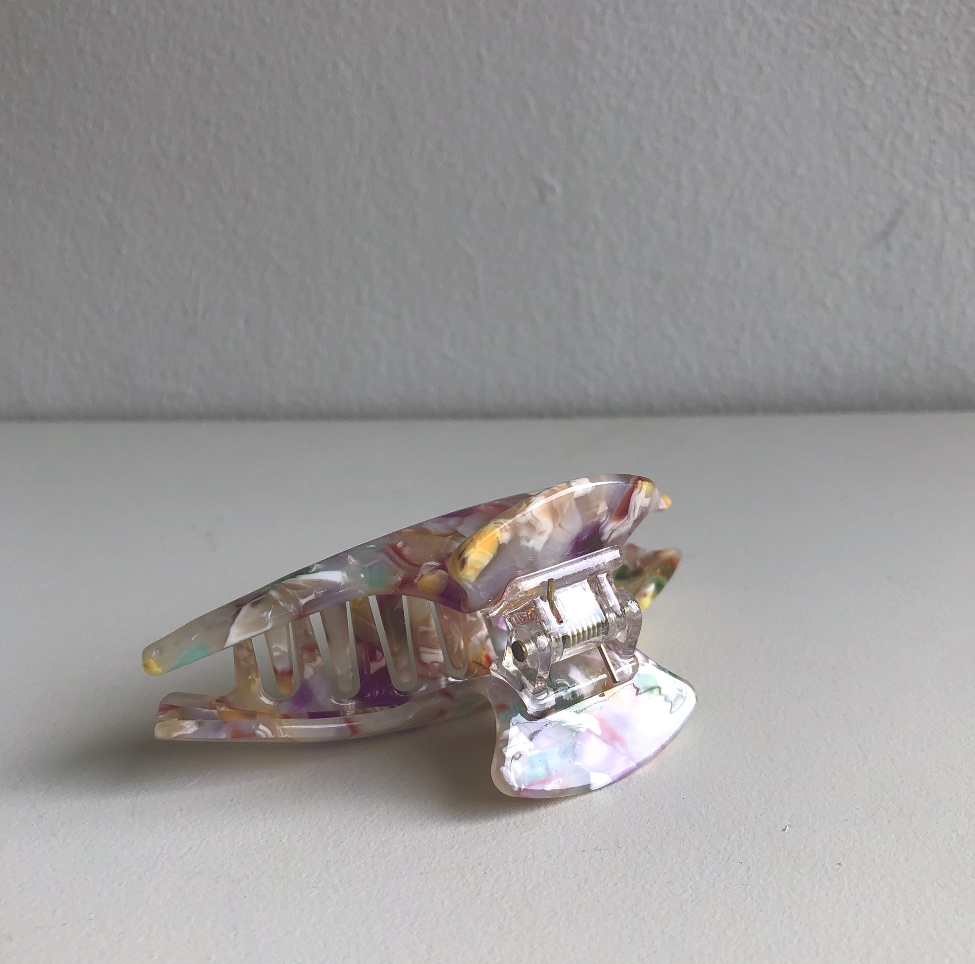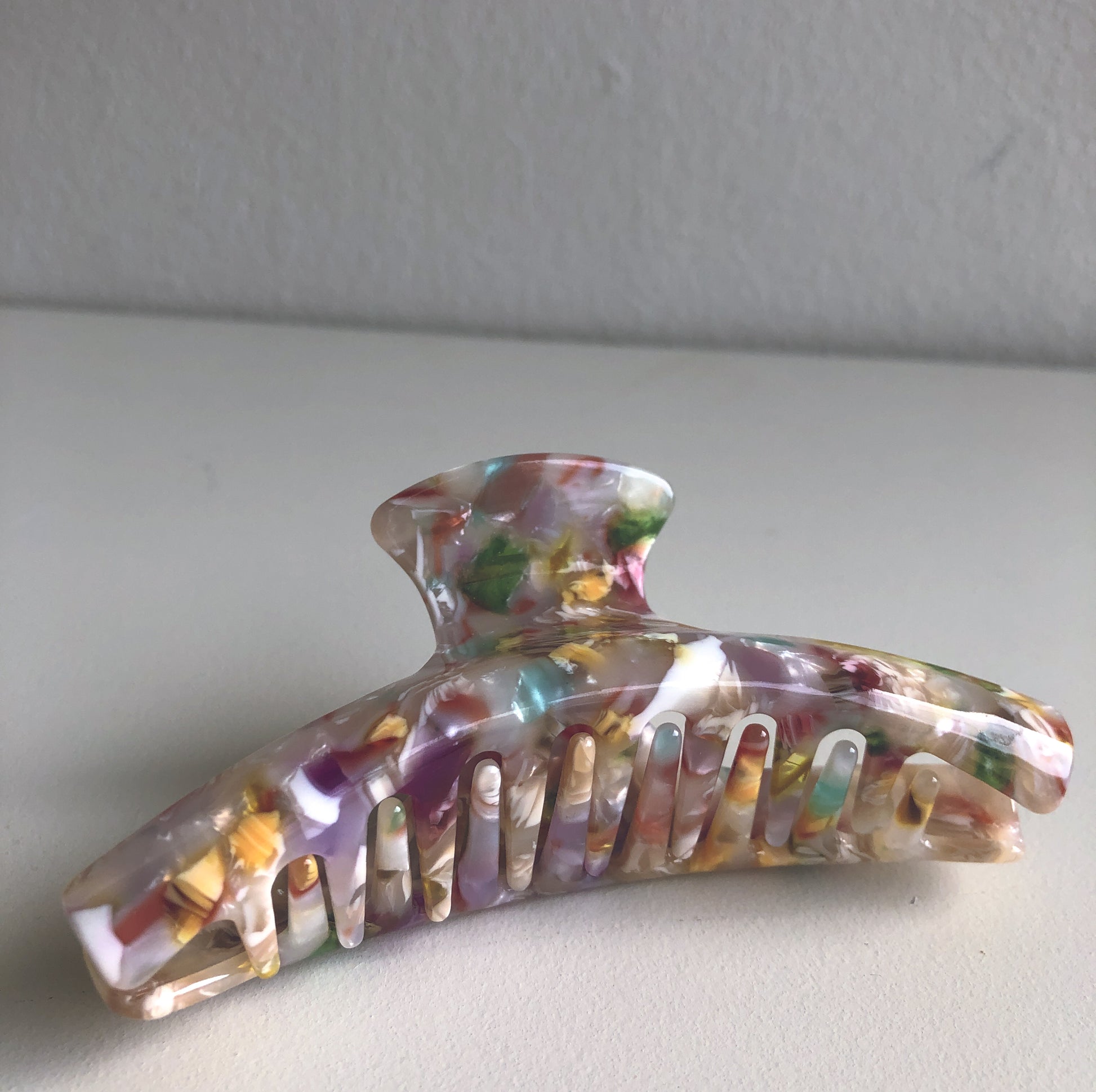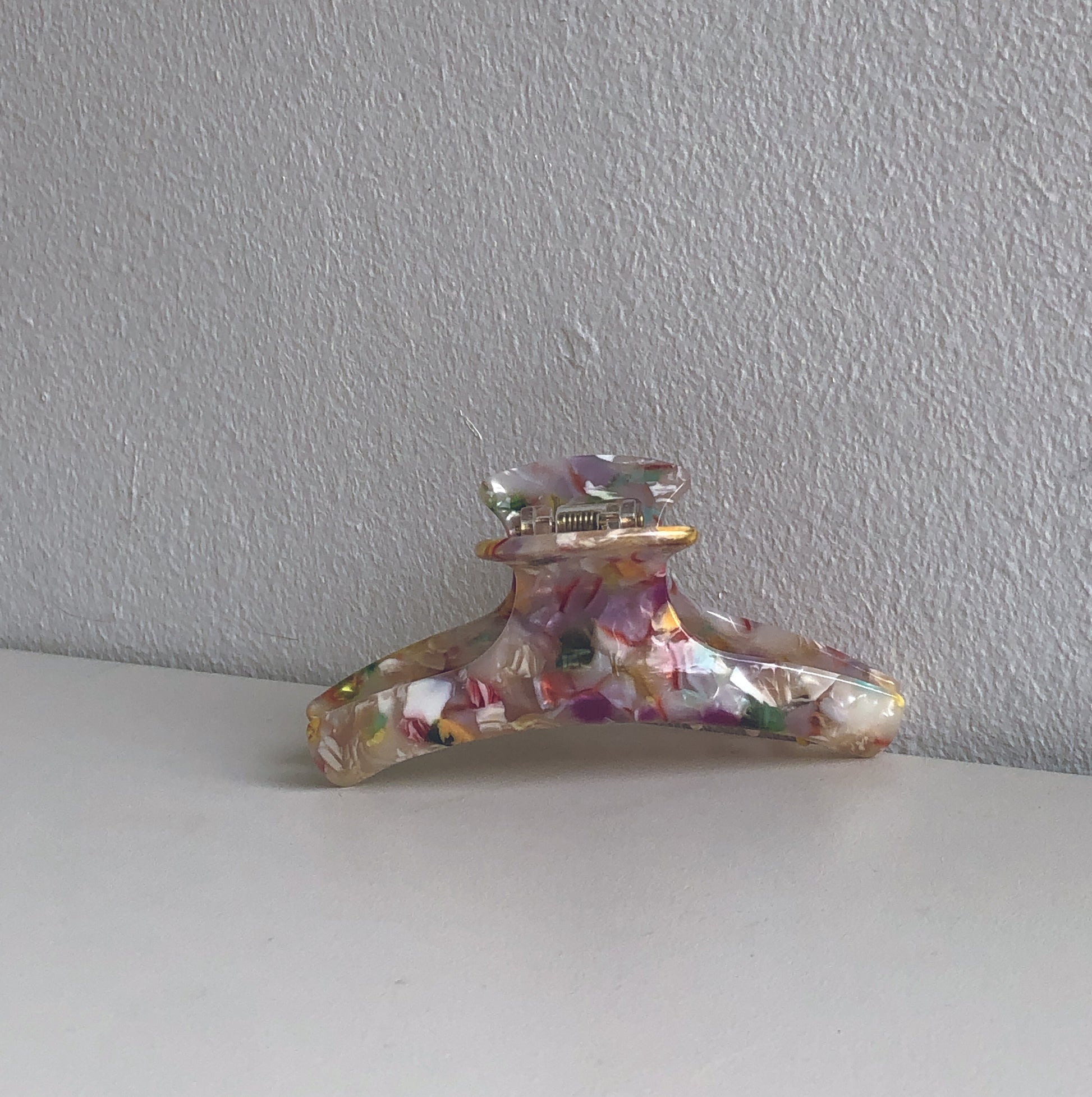The Arabella Hair Claws come in a beautiful shell finish with a smattering of pink, white, red and green, that are a great accent in any hairstyle and are perfect for a pop of colour in an half up-do.