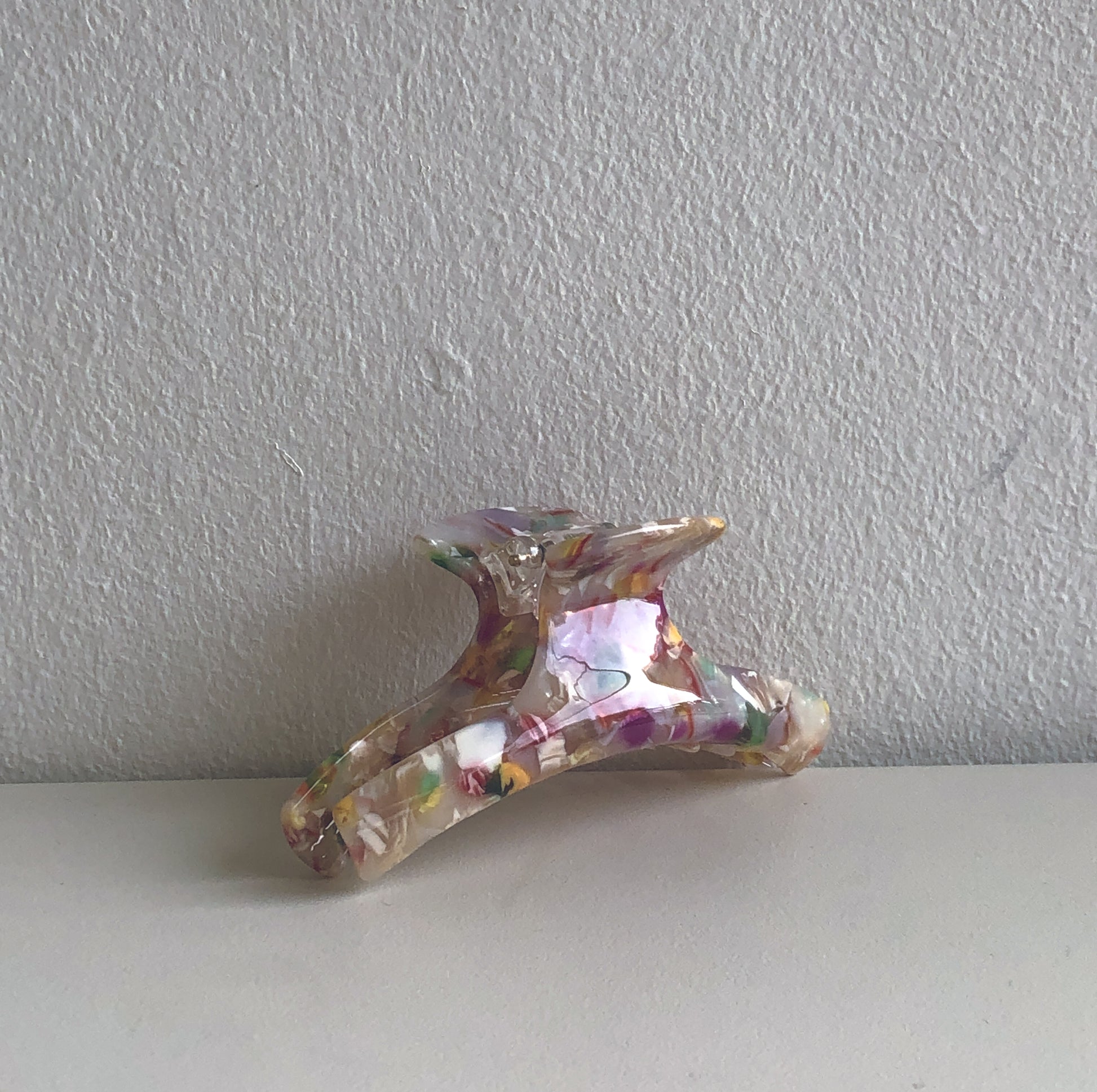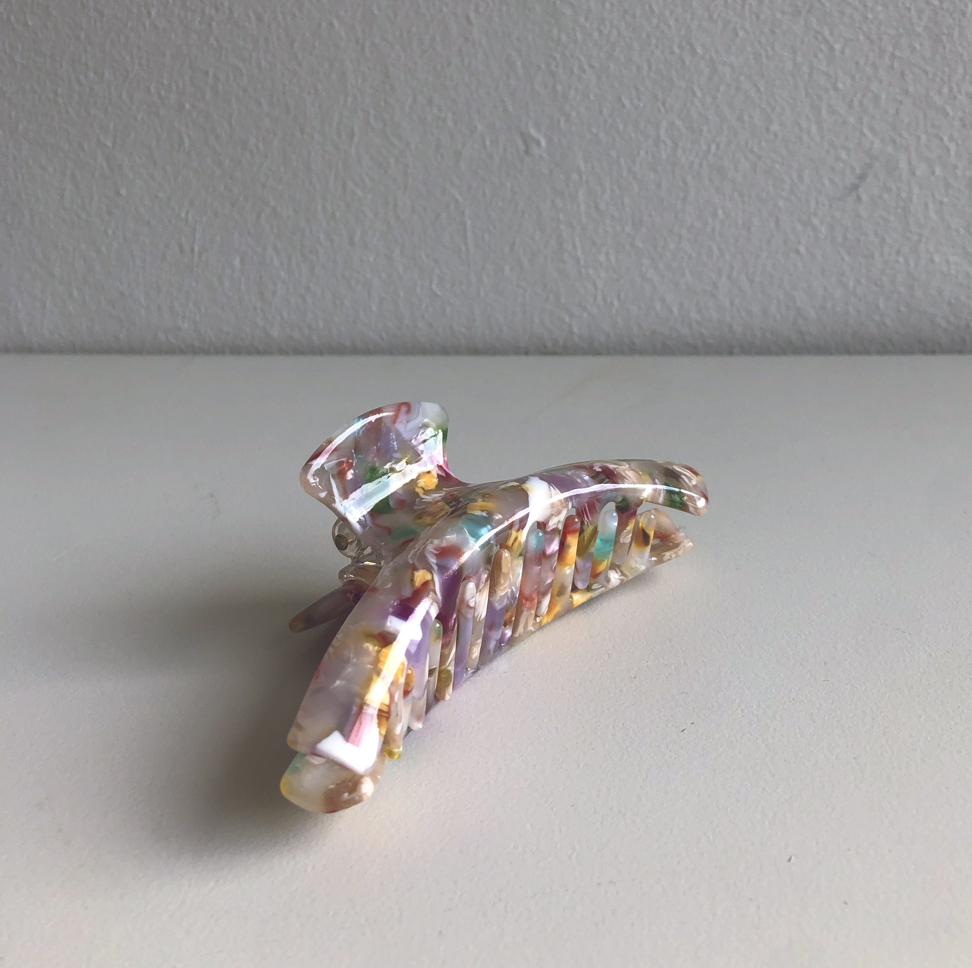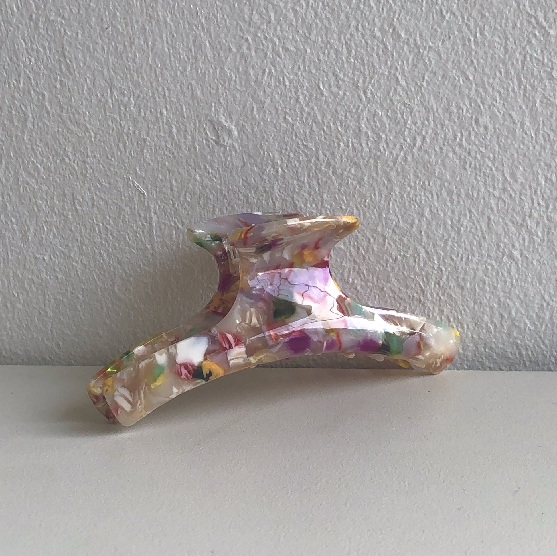 The Arabella Hair Claws come in a beautiful shell finish with a smattering of pink, white, red and green, that are a great accent in any hairstyle and are perfect for a pop of colour in an half up-do.