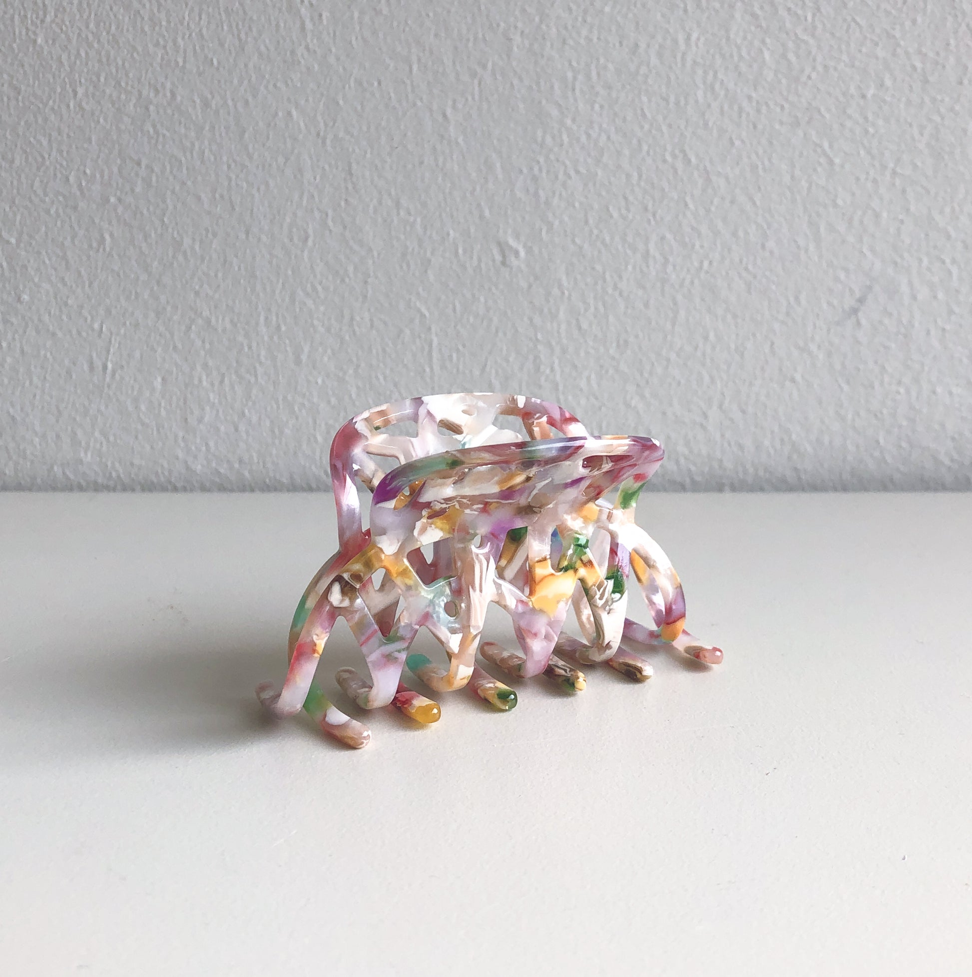The Arabella Hair Claws come in a beautiful shell finish with a smattering of pink, white, red and green, that are a great accent in any hairstyle and are perfect for a pop of colour in an half up-do.