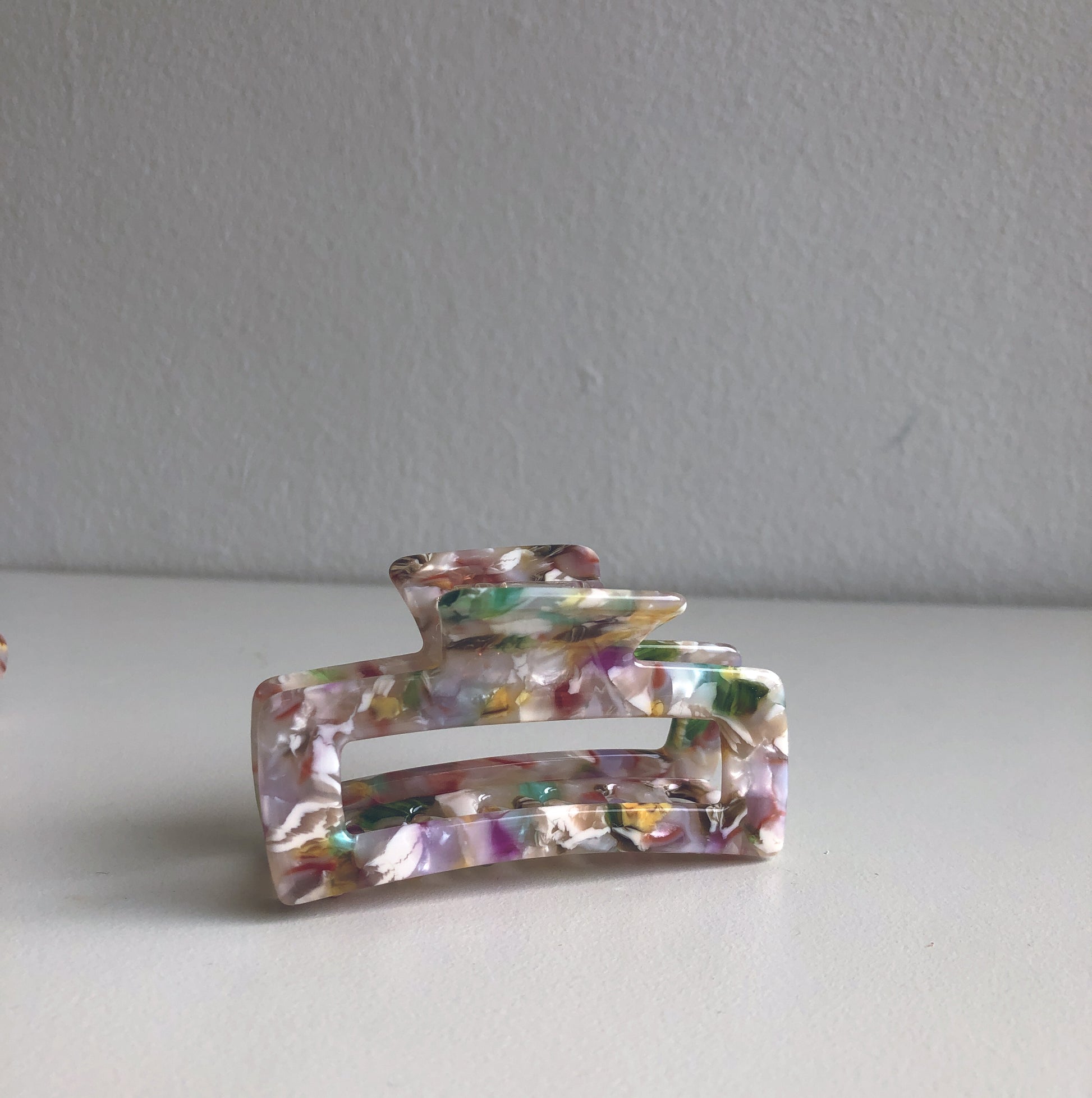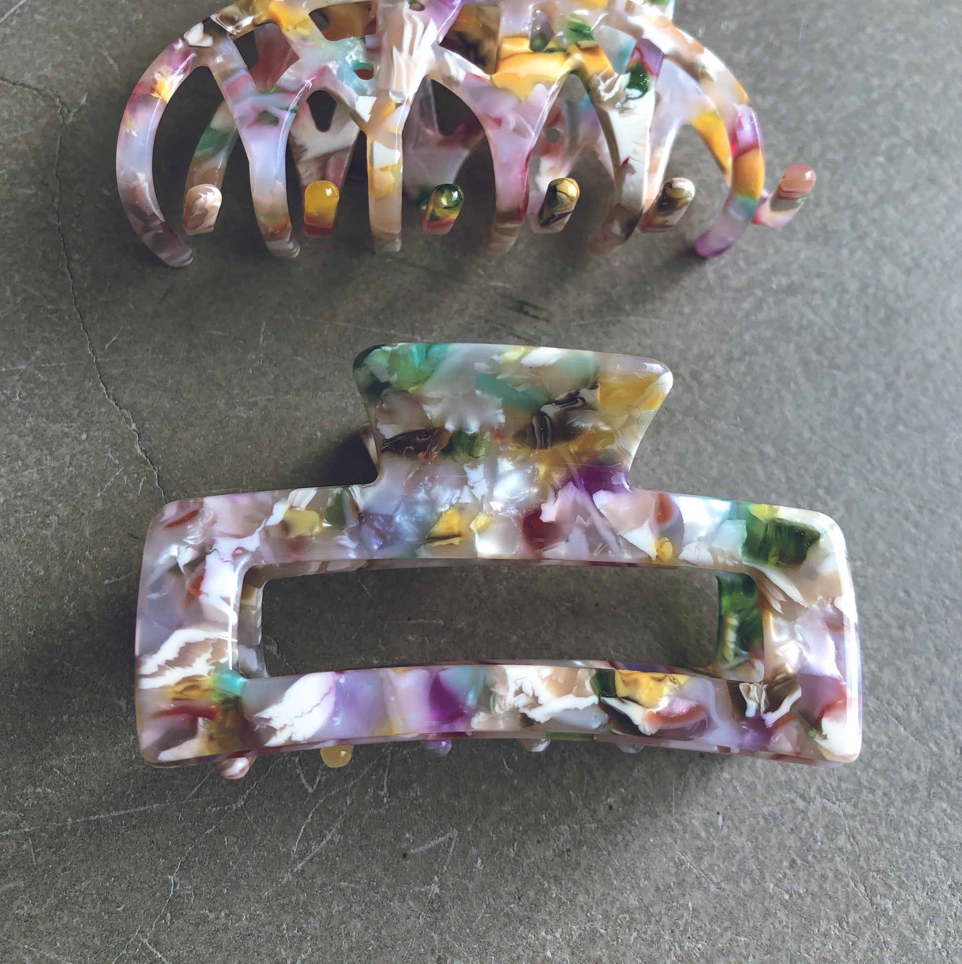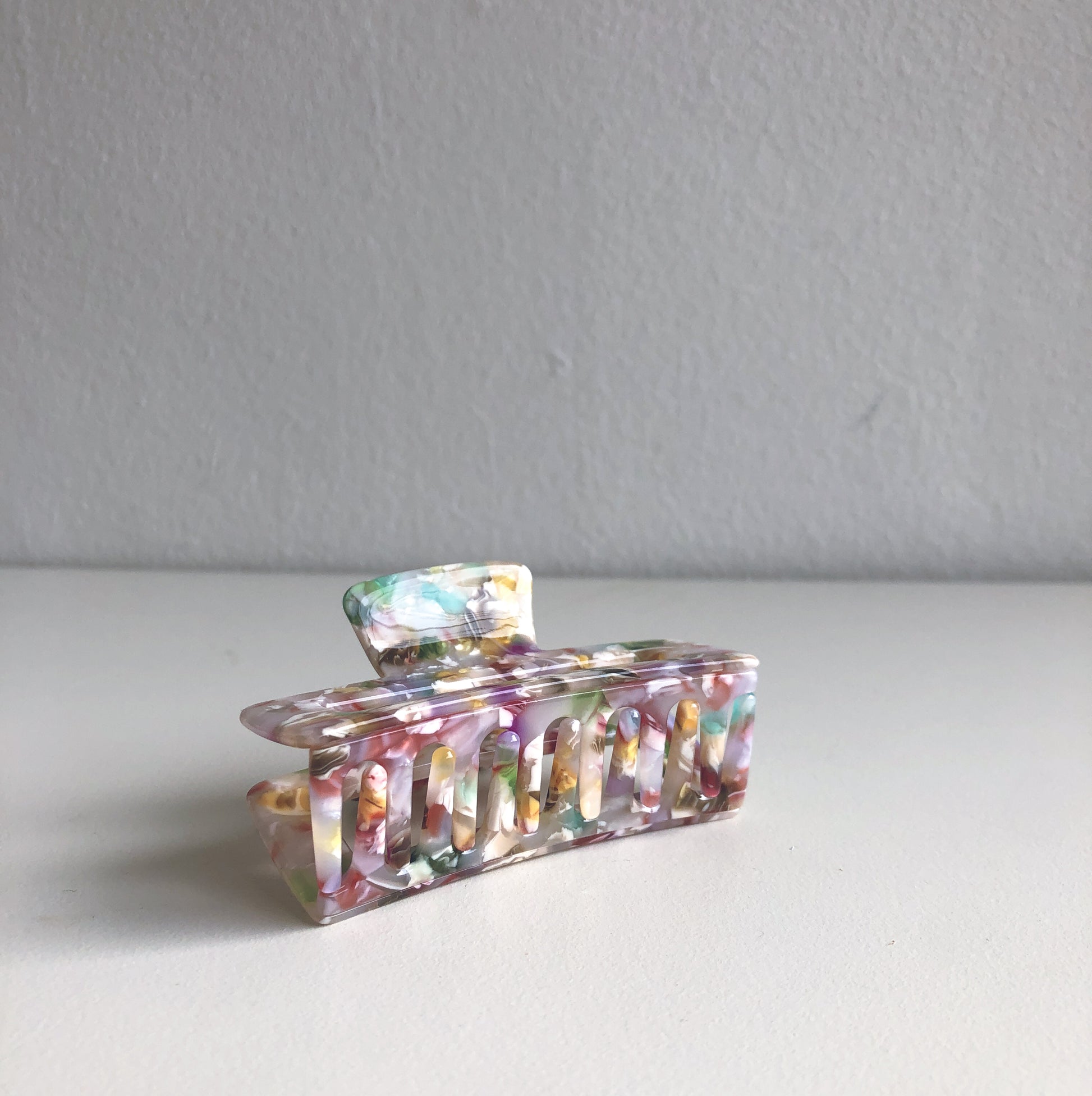 The Arabella Hair Claws come in a beautiful shell finish with a smattering of pink, white, red and green, that are a great accent in any hairstyle and are perfect for a pop of colour in an half up-do.
