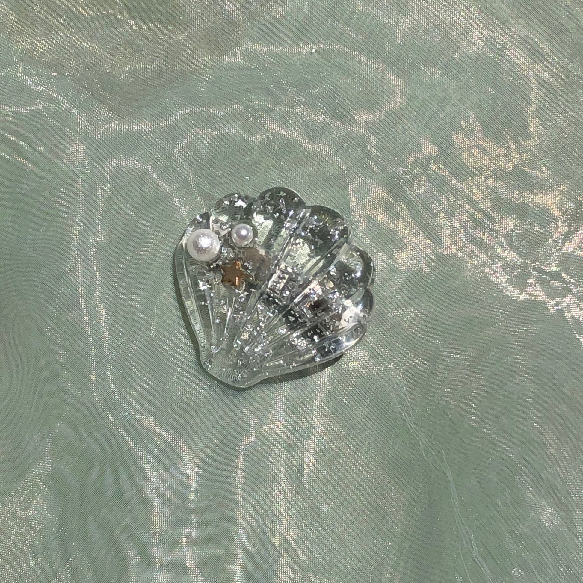 - Clear shell with silver foil and pearl detailing
