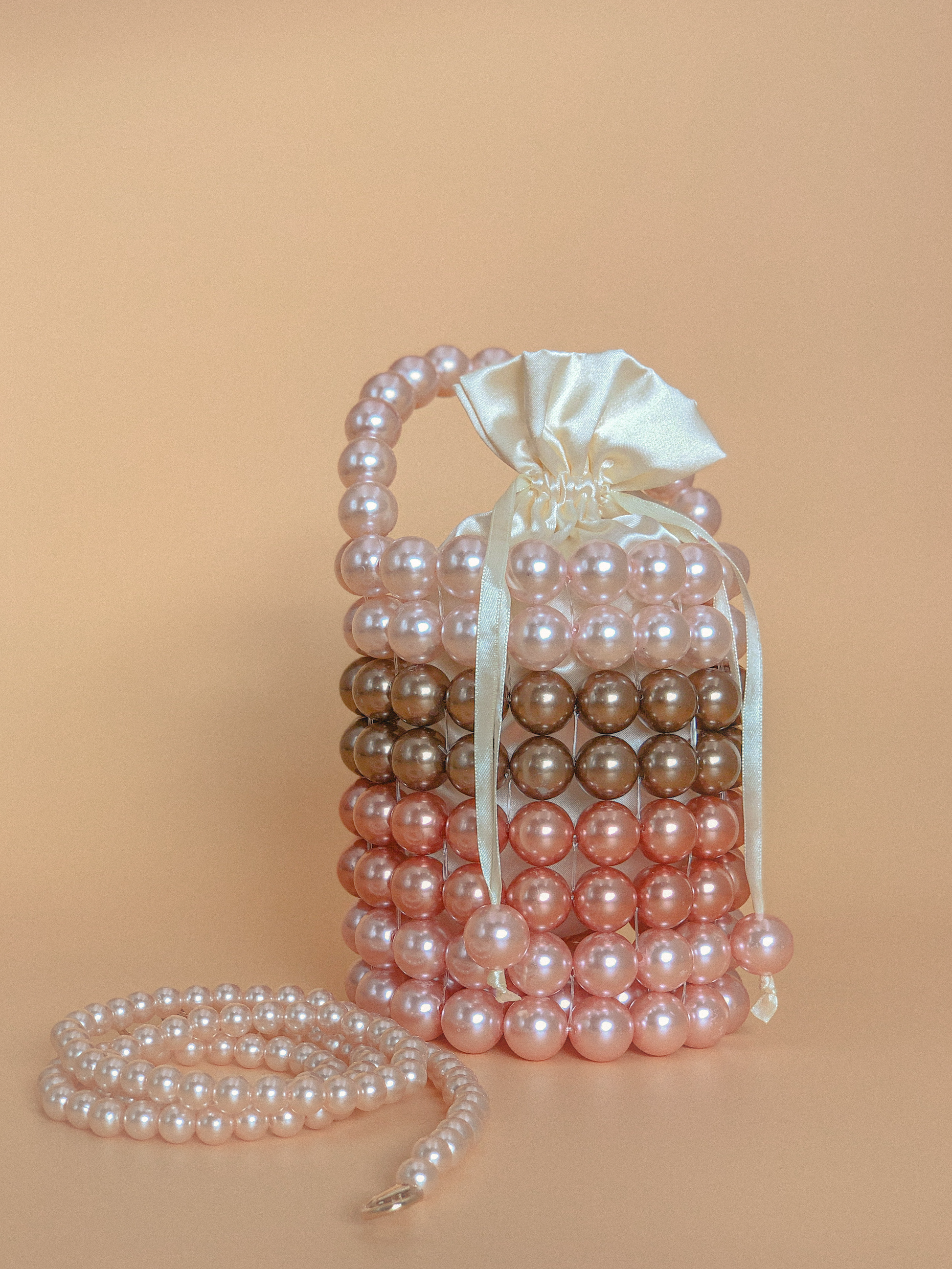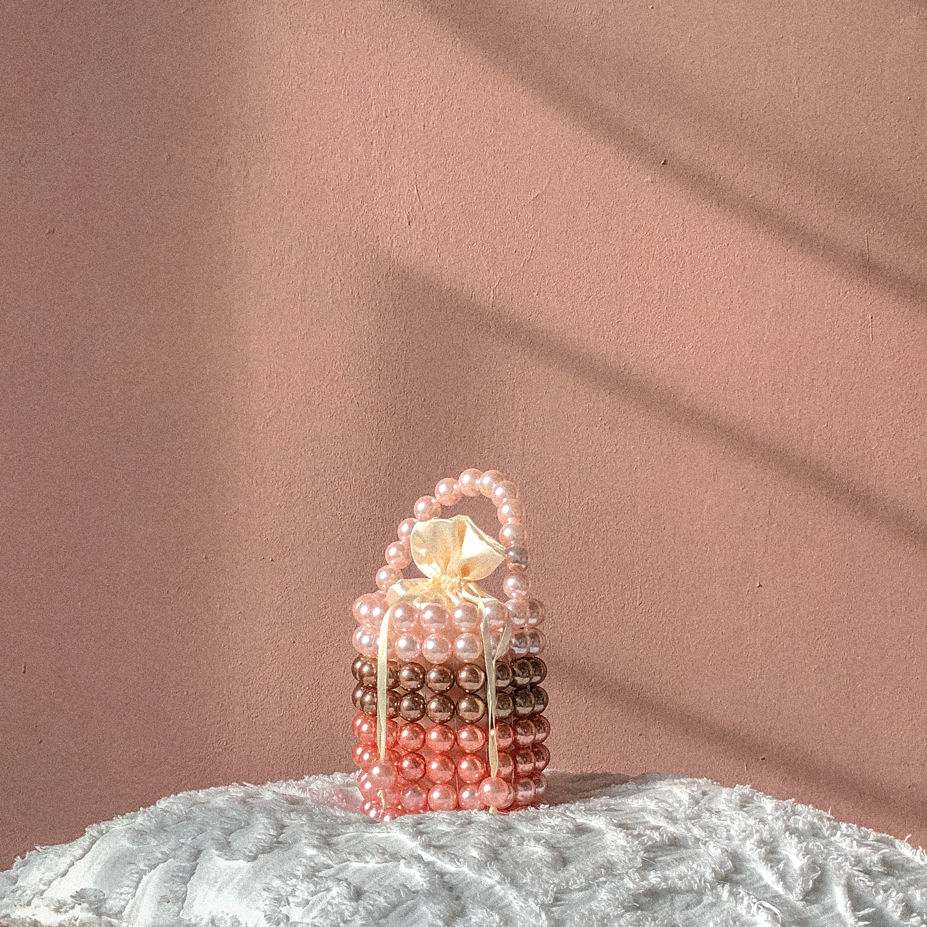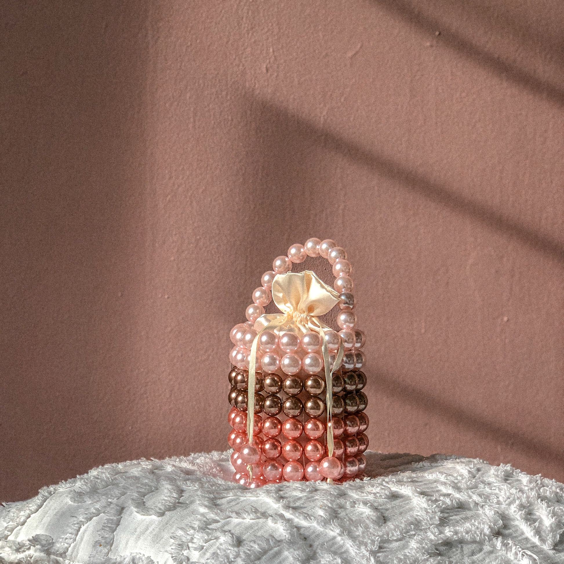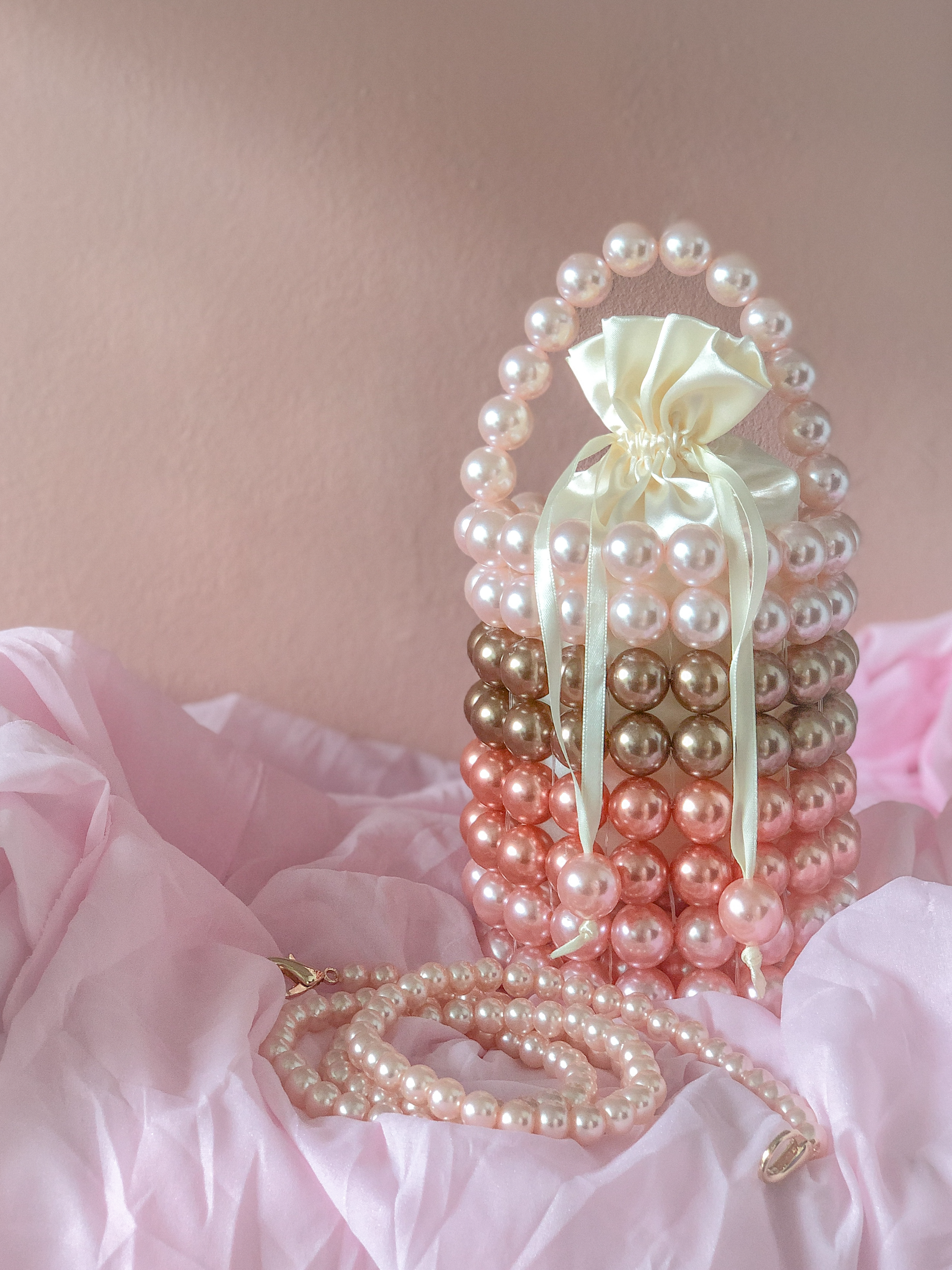 Channelling Audrey Hepburn 50s vibes with this elegant bucket bag in pink pearl. The Audrey Bucket is handmade with varying shades of pink pearls.