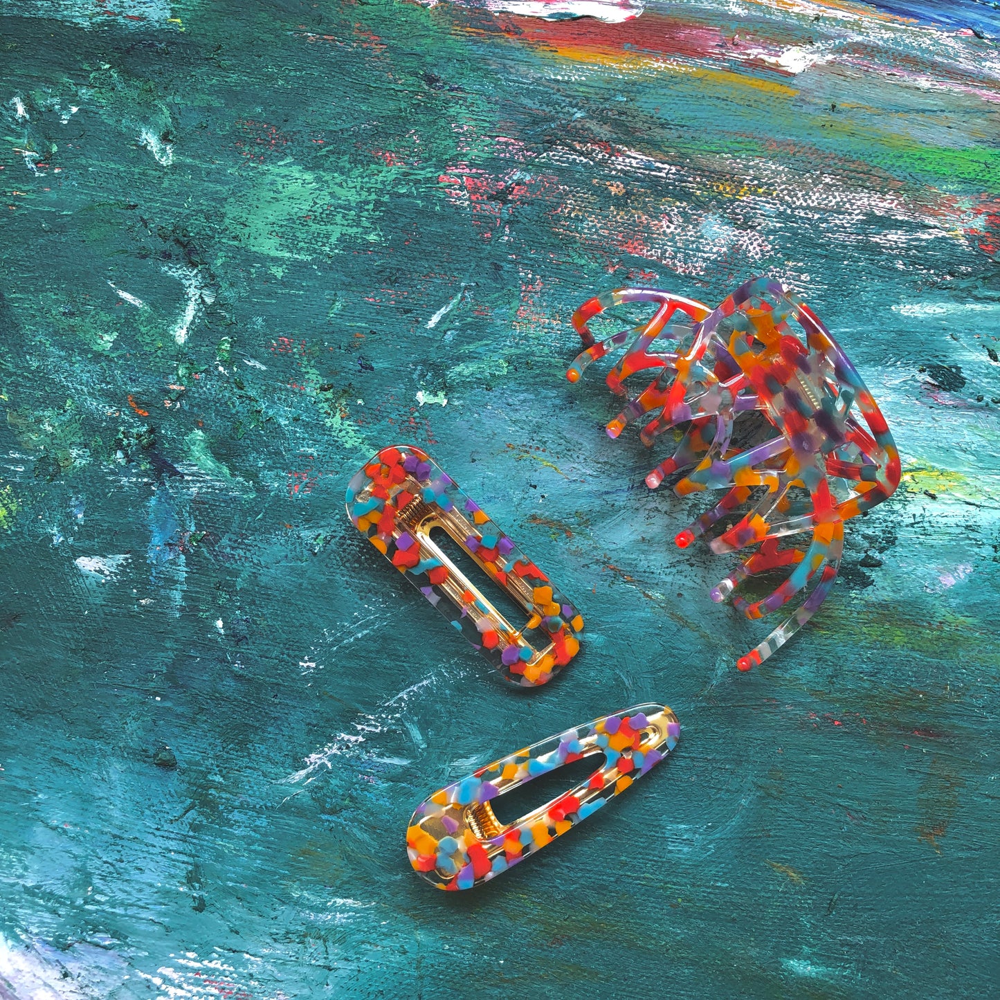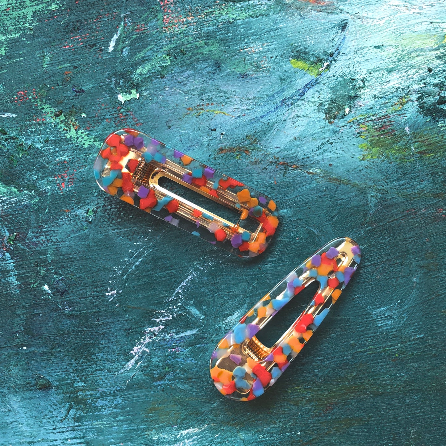 Styles available: Clear resin Hair Barrettes and Hair Claws speckled with dots of paint.