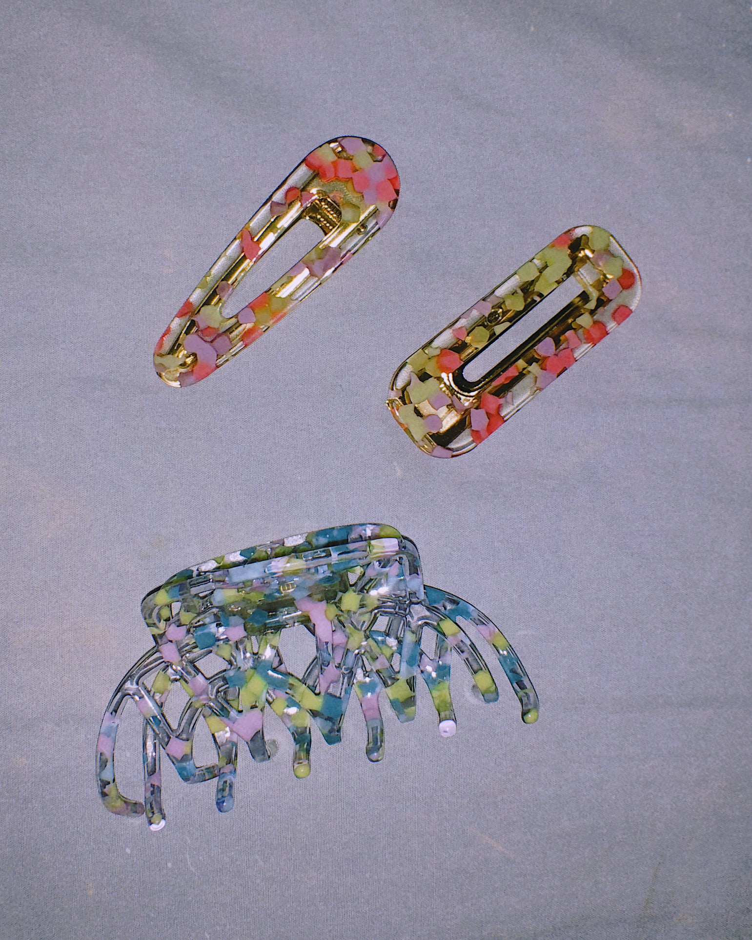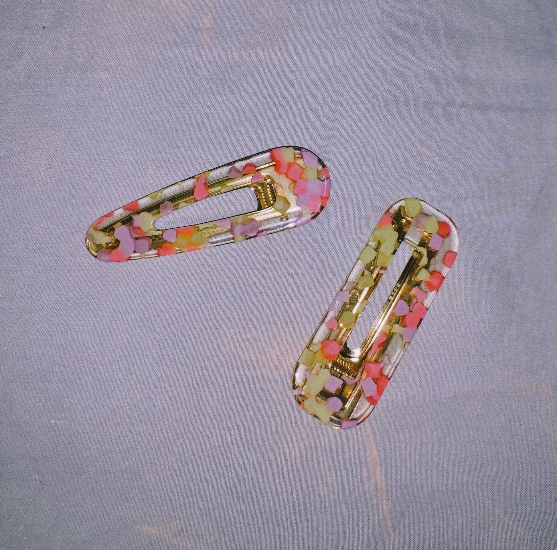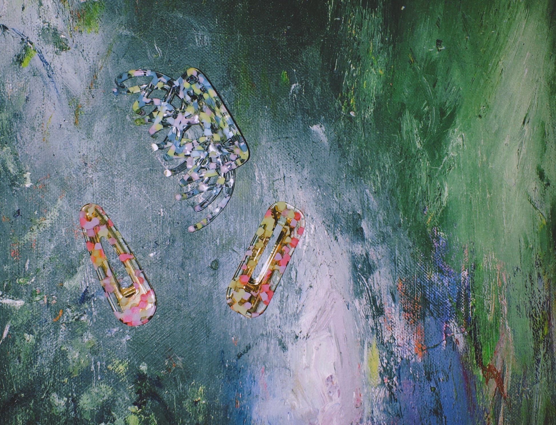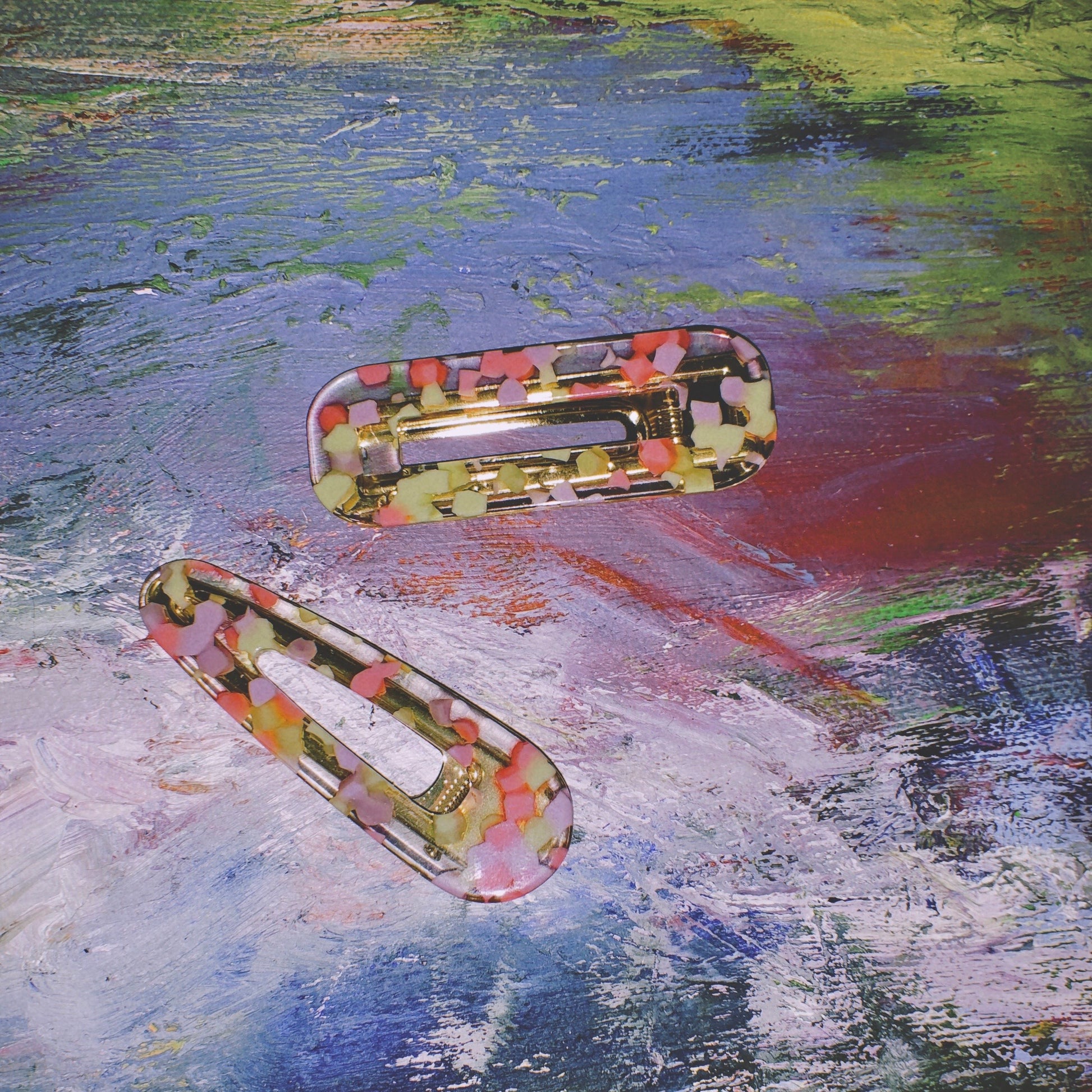 The Twilight Hair Barrettes are a new addition to our Rayleigh Paint Dots collection of hair accessories. The speckles of lilac, pink and mint paint dots give a bubbly pop of colour to your updo.