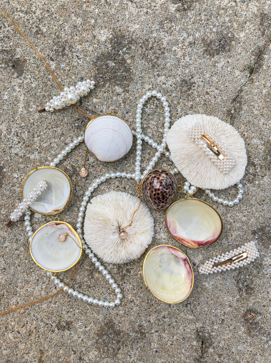 This Gift Set includes a Mermaid Coin Purse (Seashell) and 2-3 Pearl Hair Barrettes in a beautiful reusable pouch. Perfect for the mermaid in all of us.