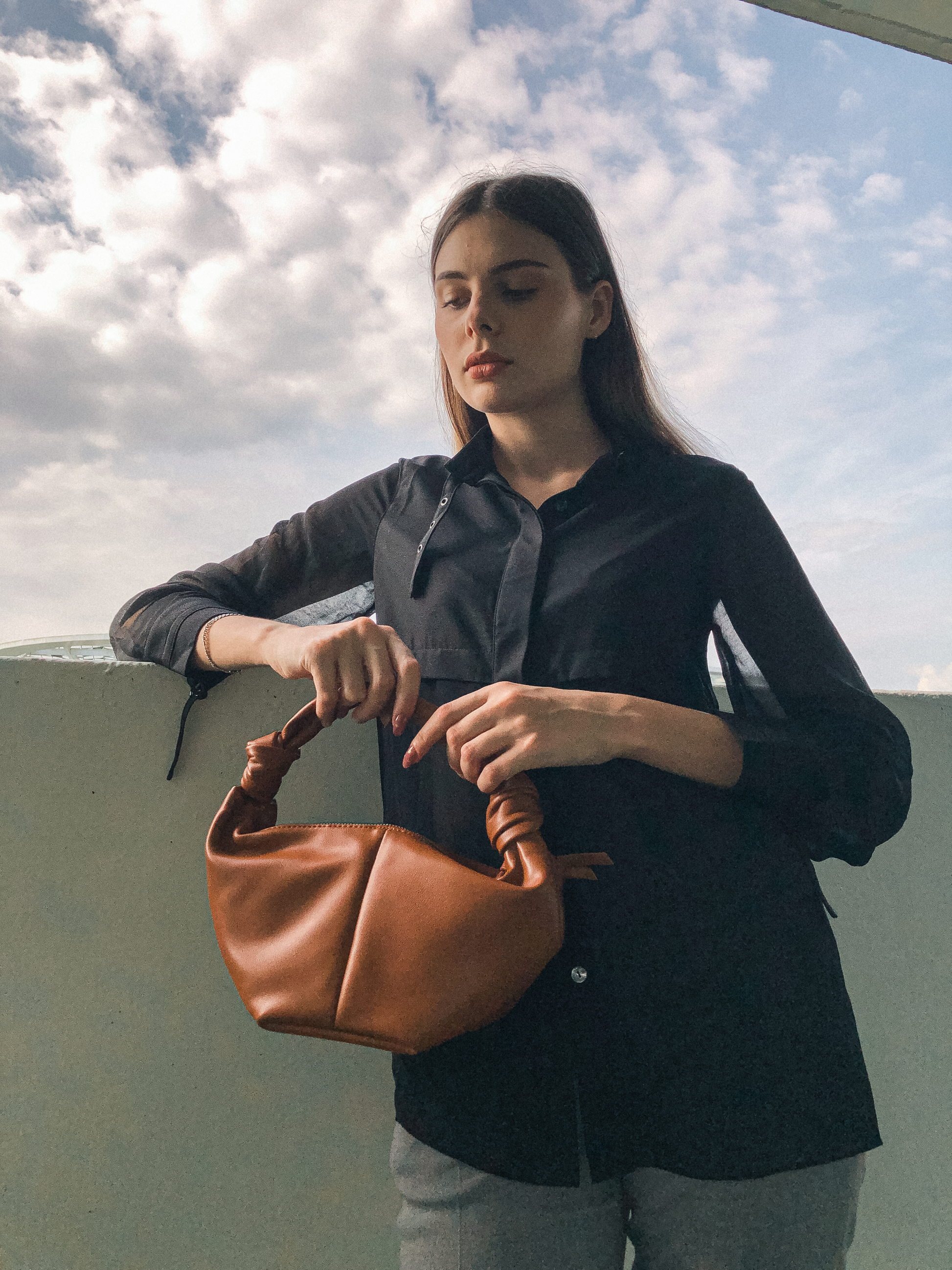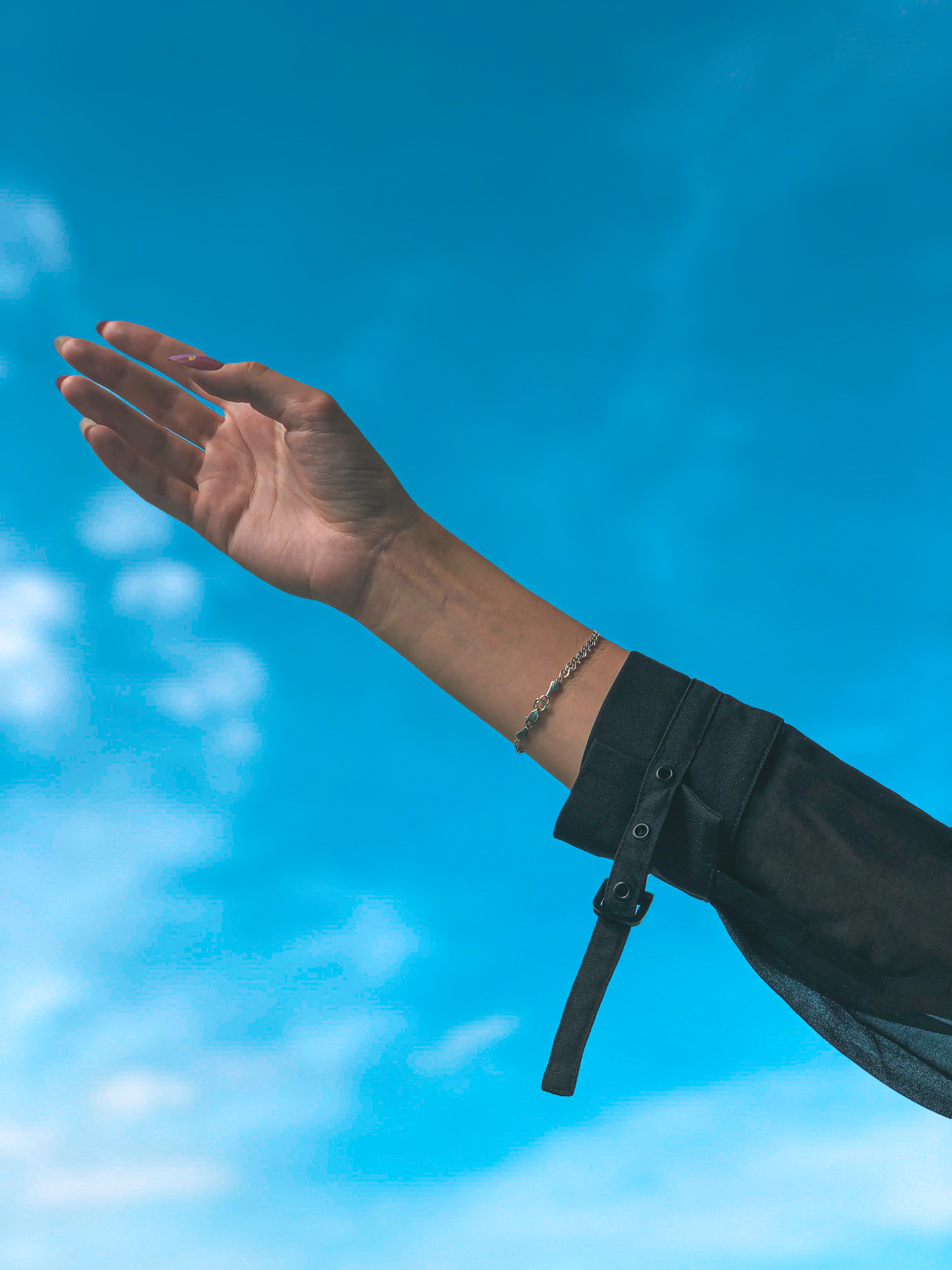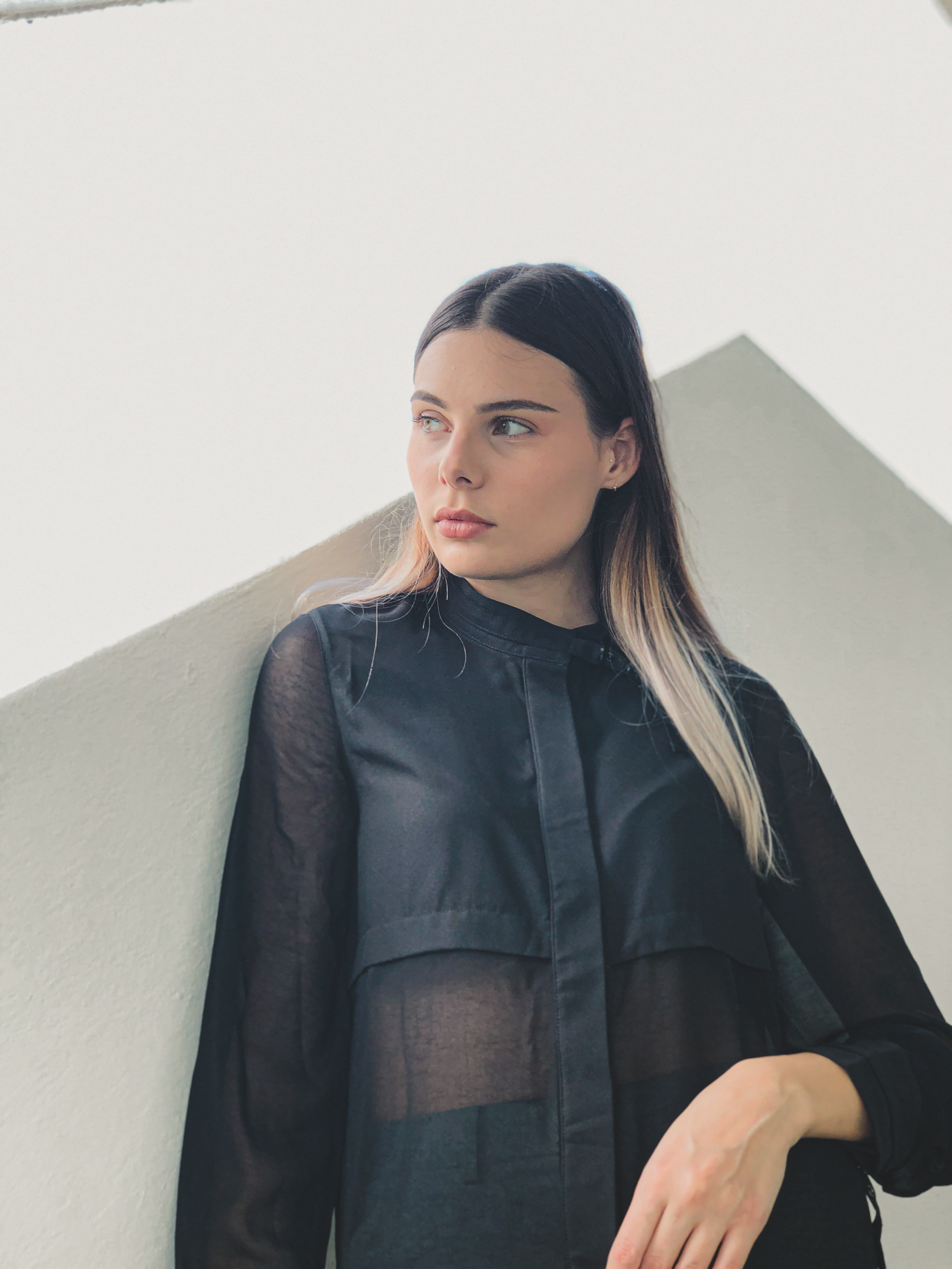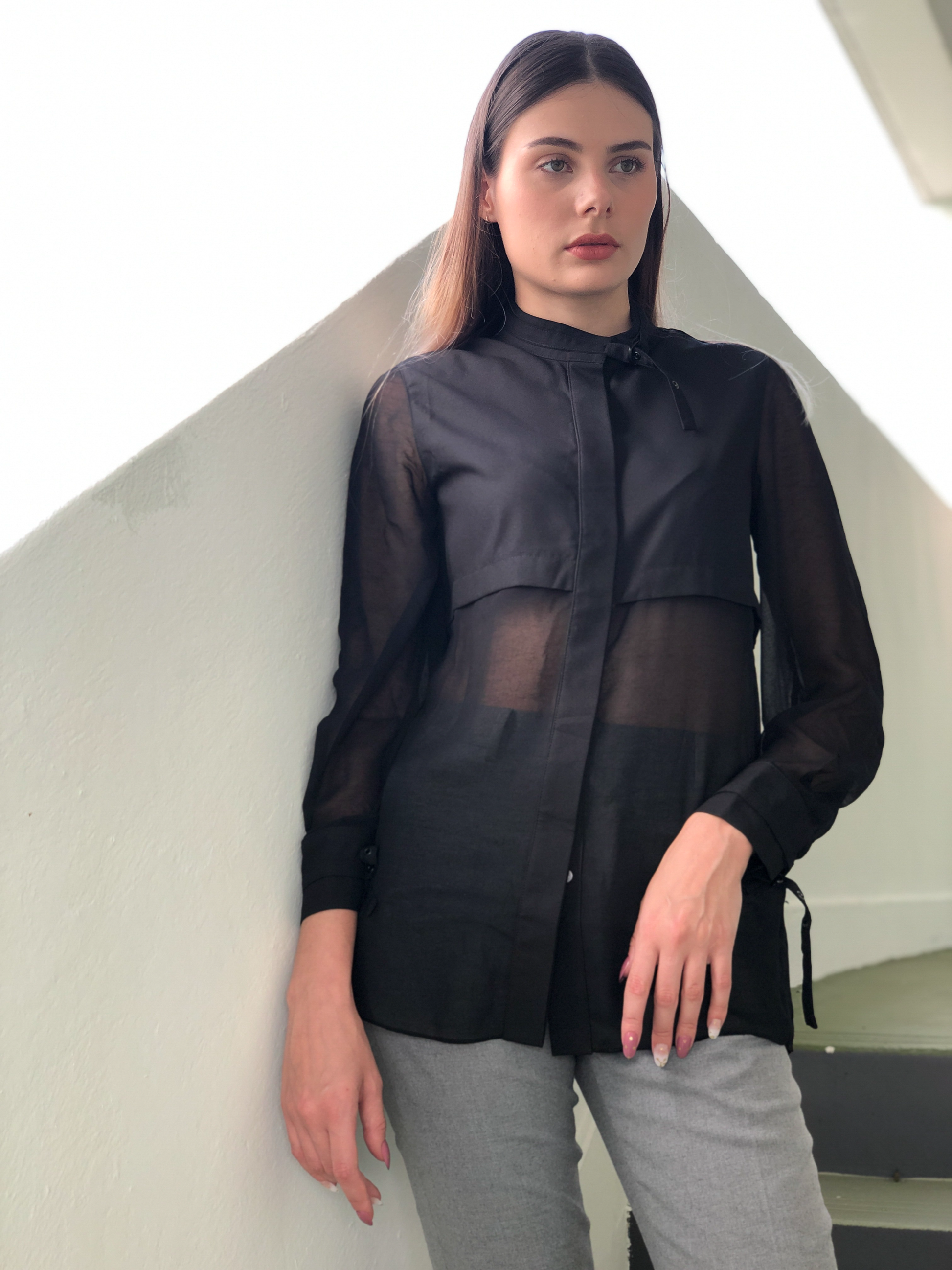 A long sleeved button-up shirt with sheer panels and silver detailing. Adjustable high mandarin collar and sleeves to take you from the office to drinks.