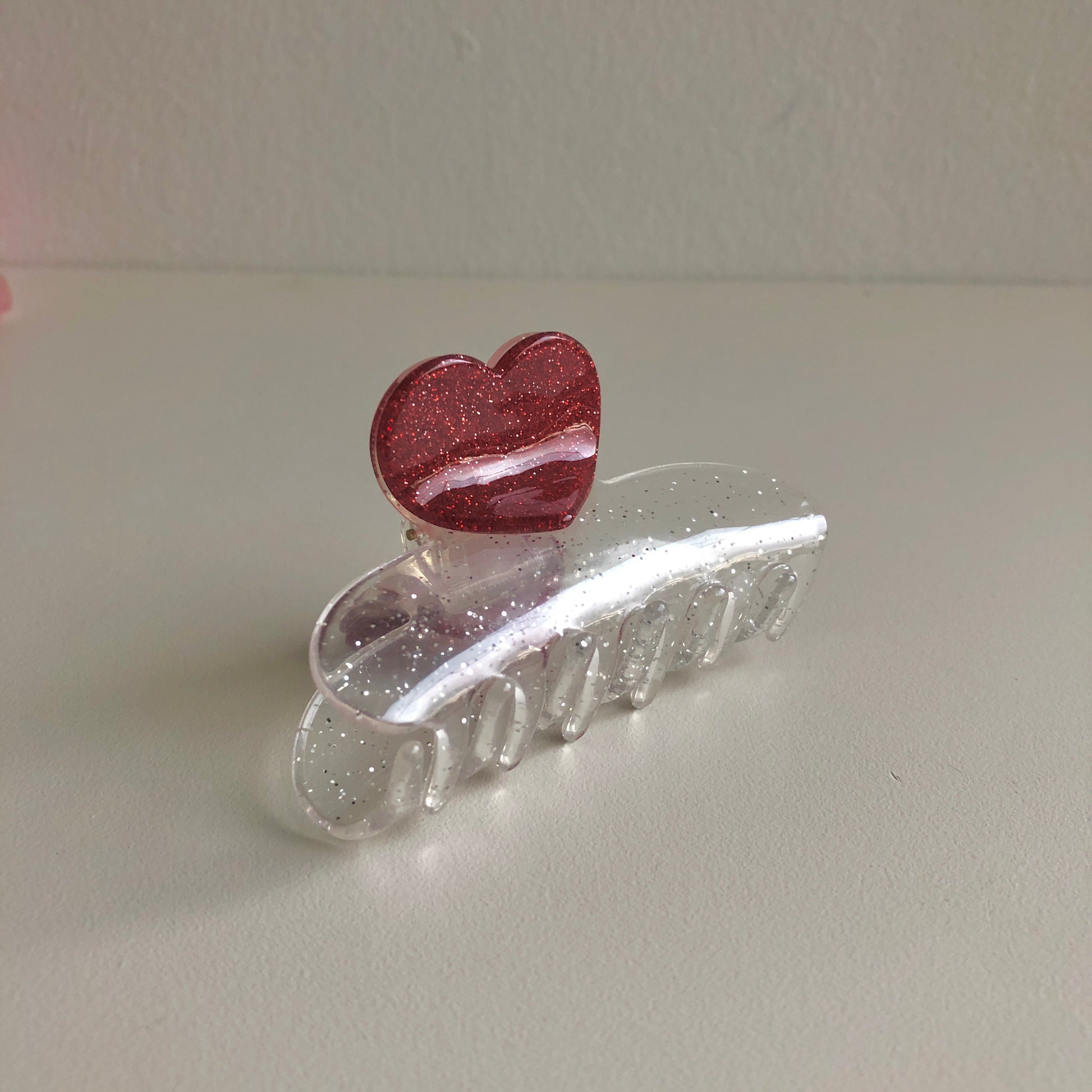 This adorable clear hair claw comes with silver glitter details and a red glitter heart.