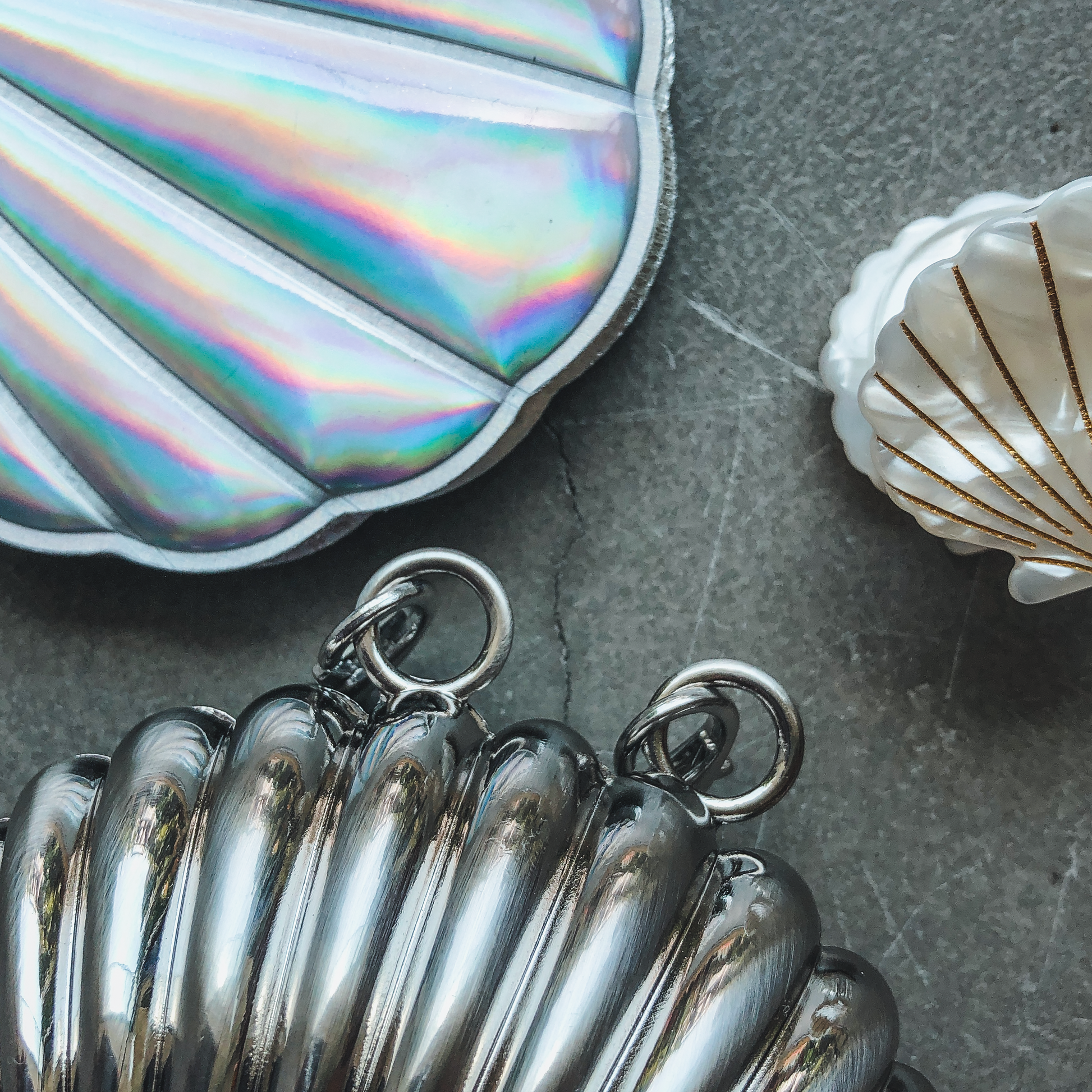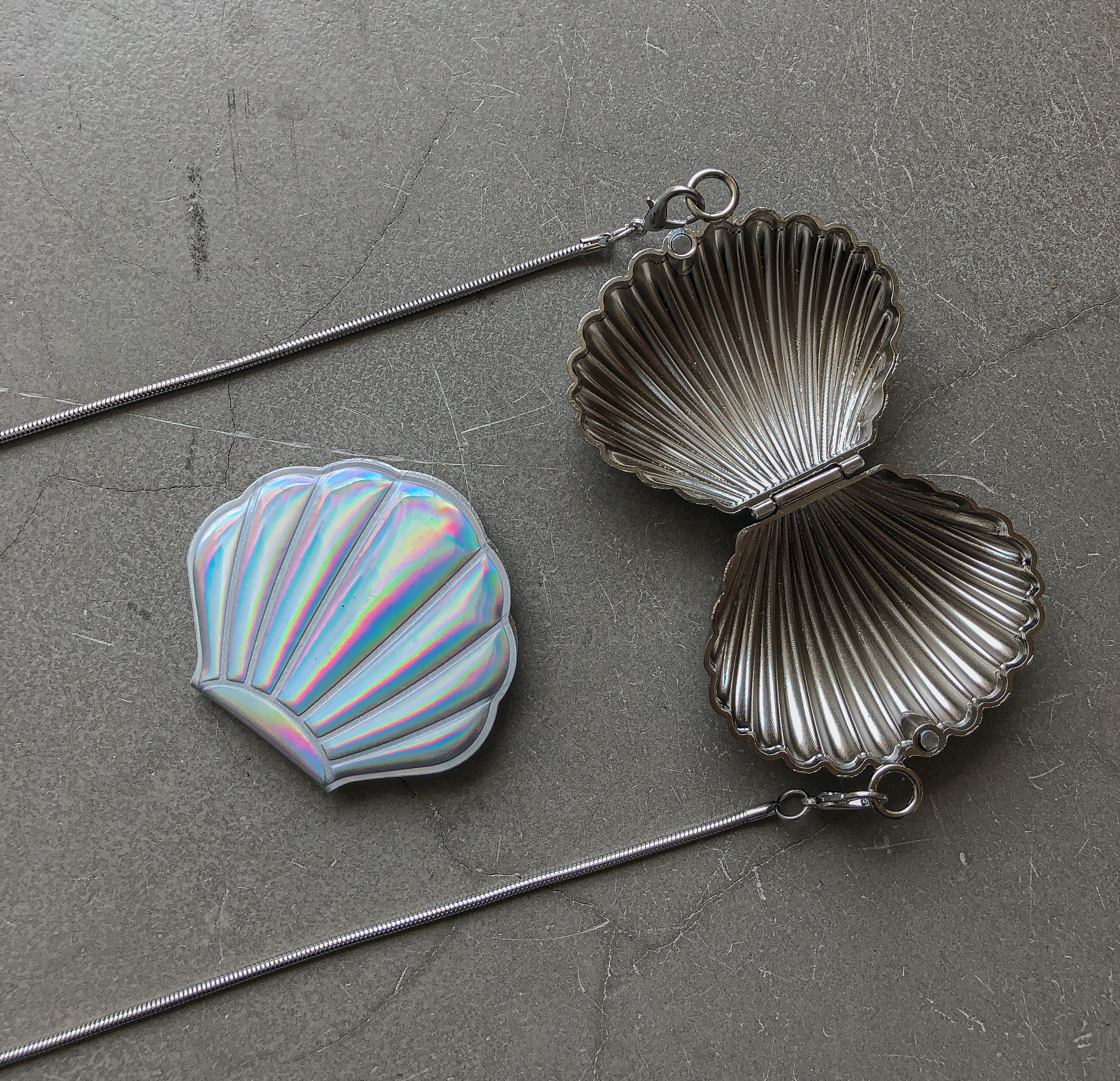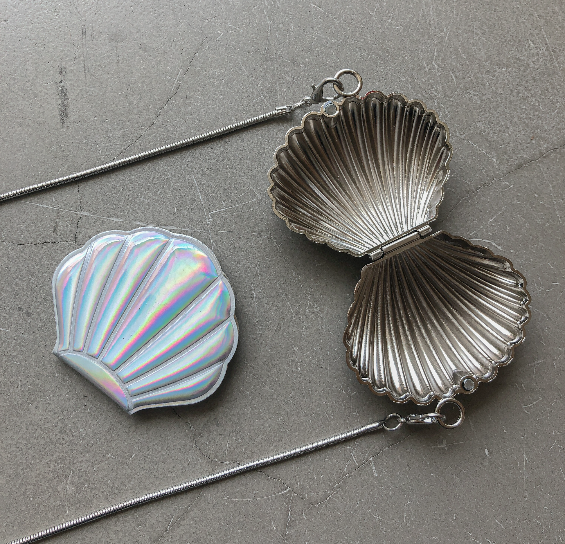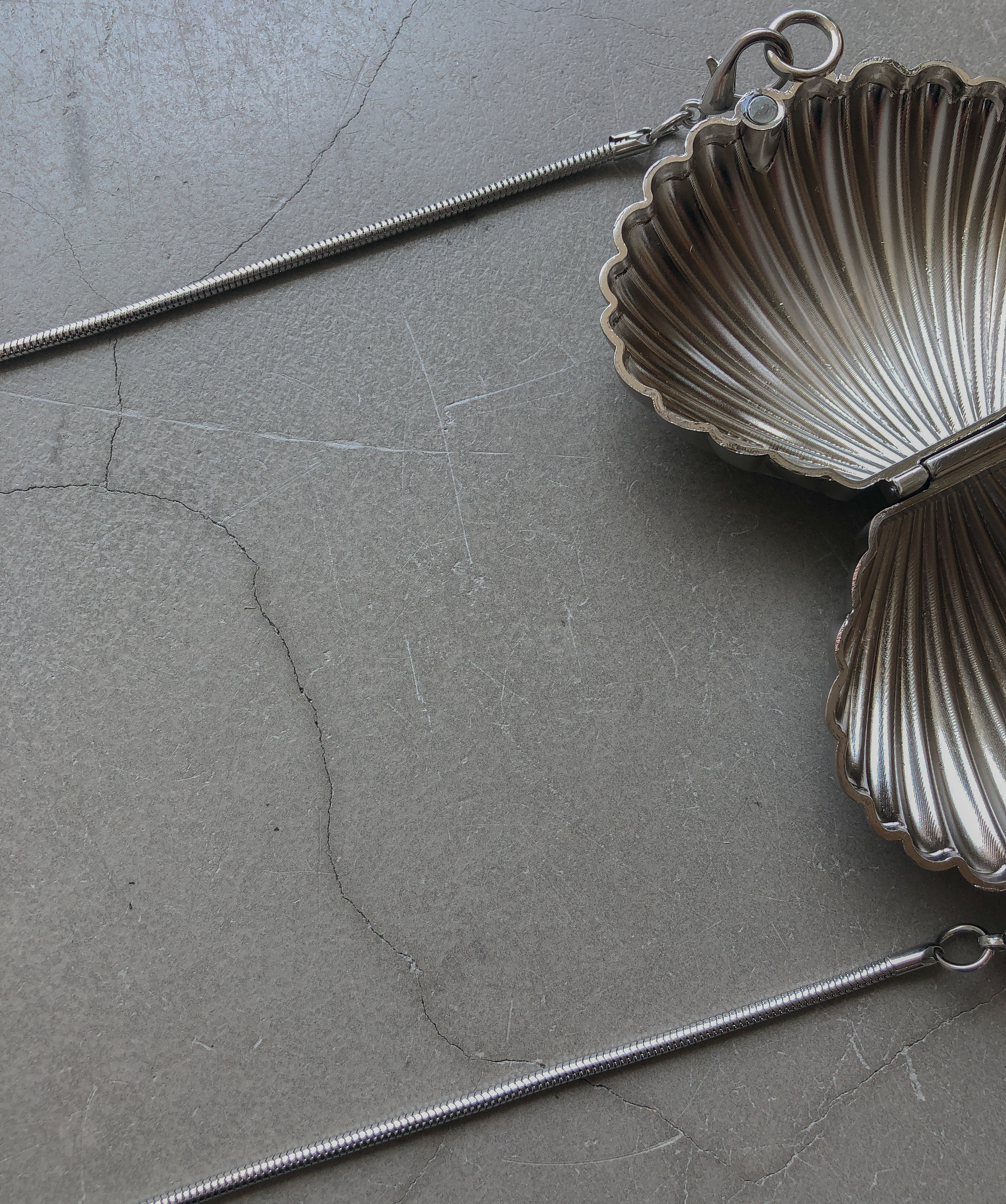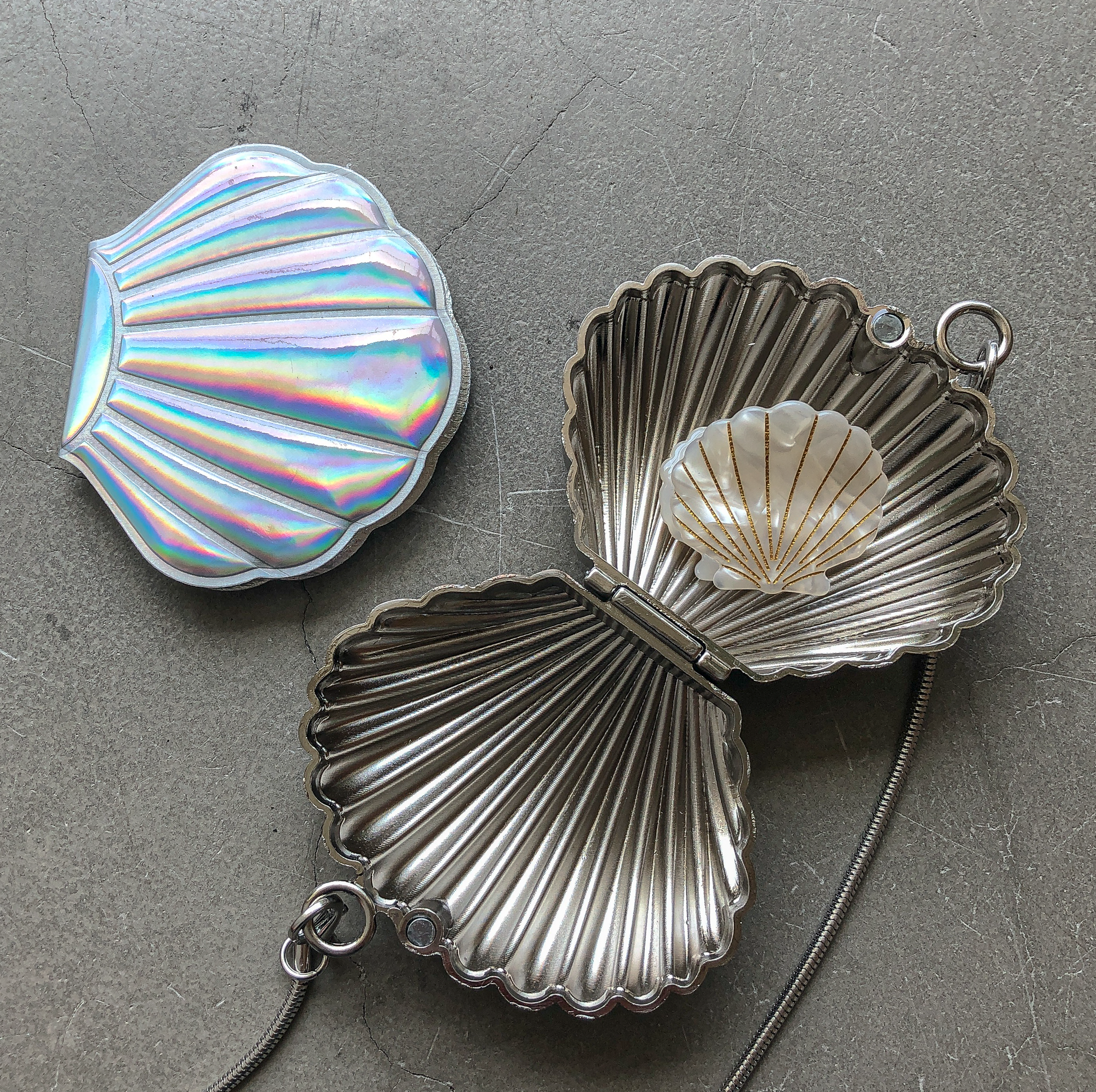 Vintage Lanvin inspired seashell mini bag with detachable sling, made entirely of stainless steel and a powder coated matte Mauve Pink finish. Perfect as a novelty candy or lipstick case as an outfit accent. Also available in Chrome Steel