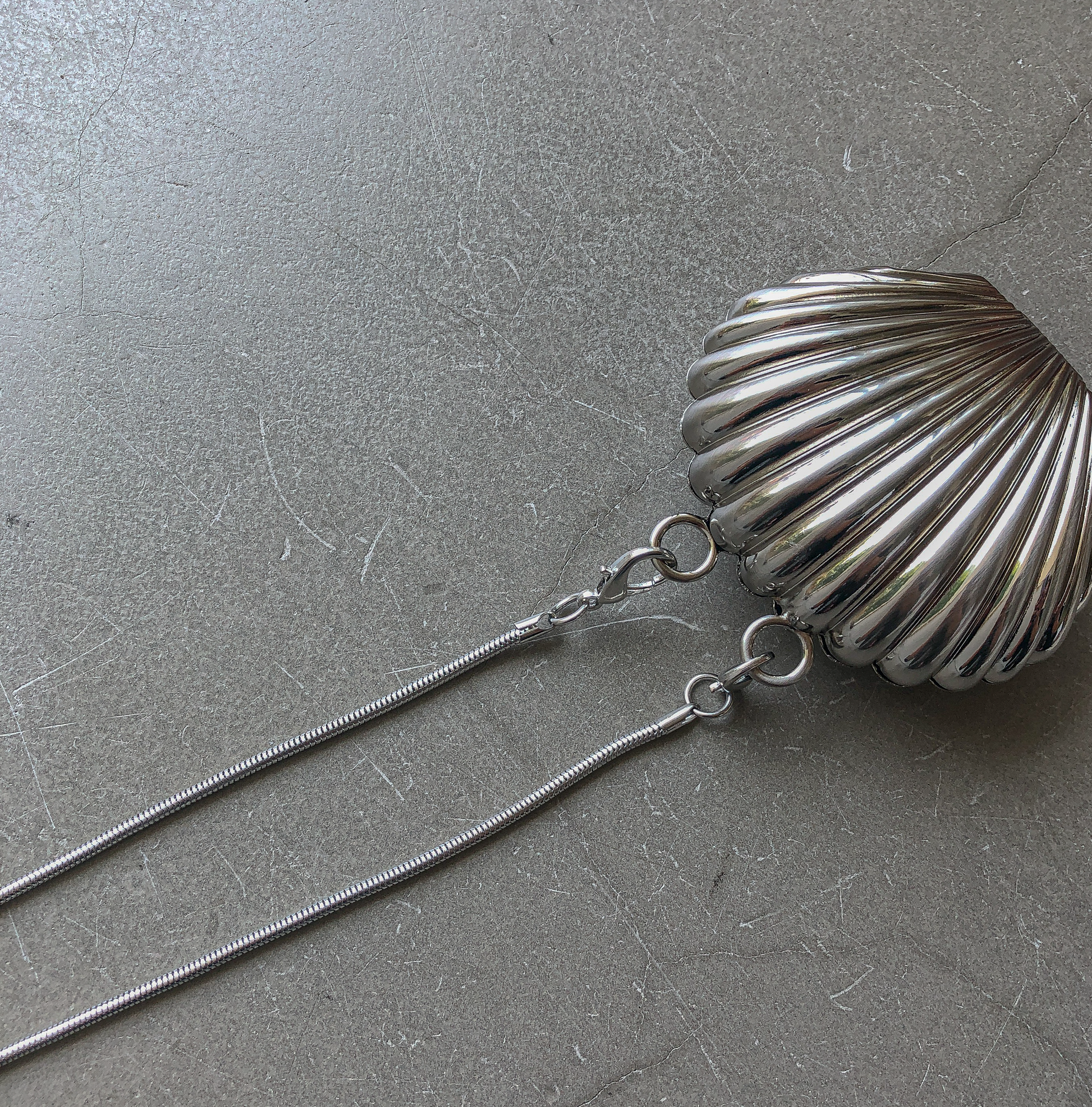 Vintage Lanvin inspired seashell mini bag with detachable sling, made entirely of stainless steel and a polished chrome finish. Perfect as a novelty candy or lipstick case as an outfit accent. Also available in Mauve Pink.