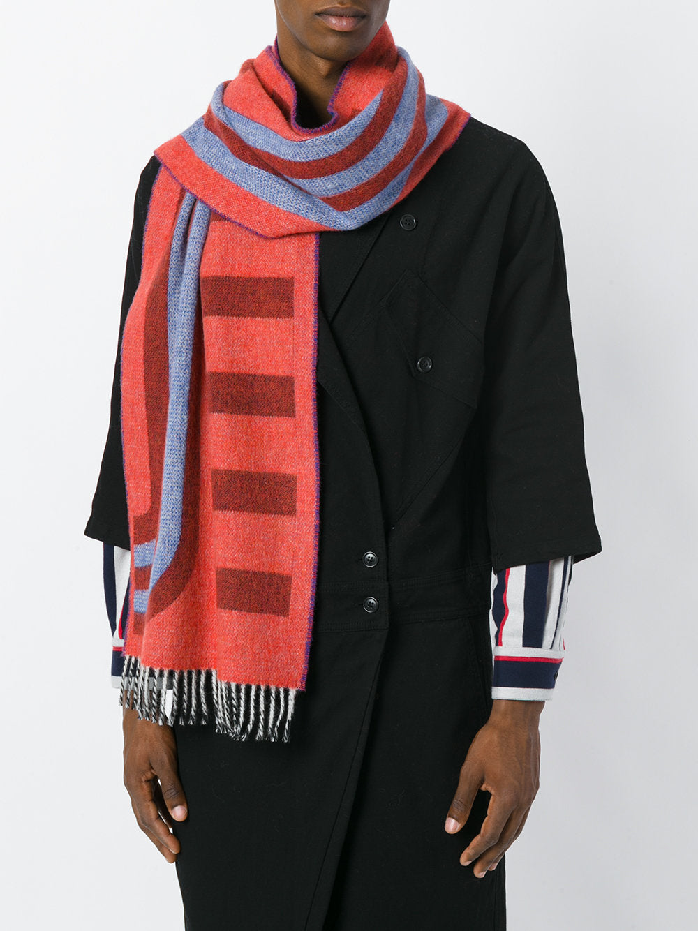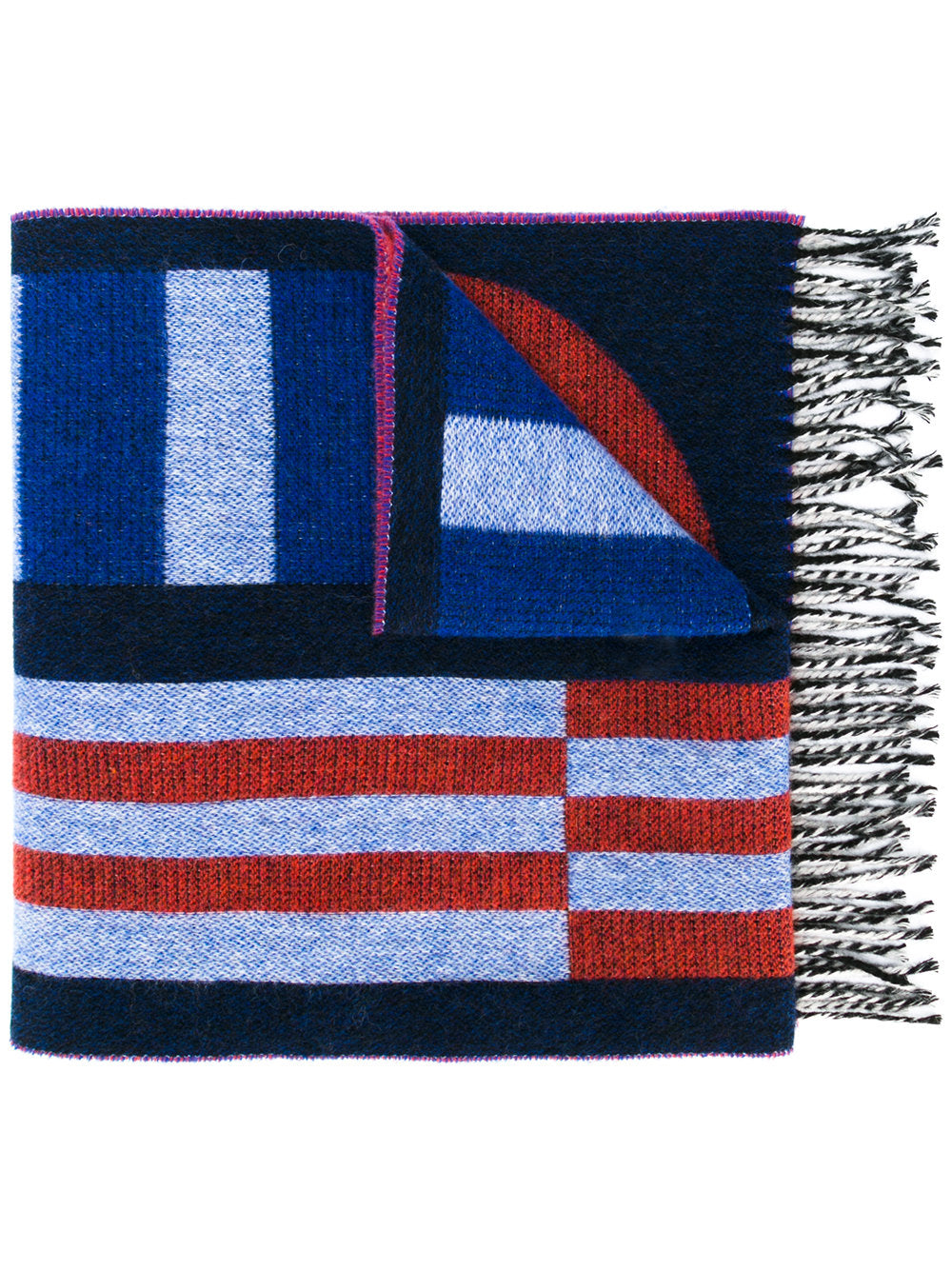 Henrik Vibskov Whoop Scarf. Blue and red virgin wool scarf with geometric pattern throughout and fringe trim.