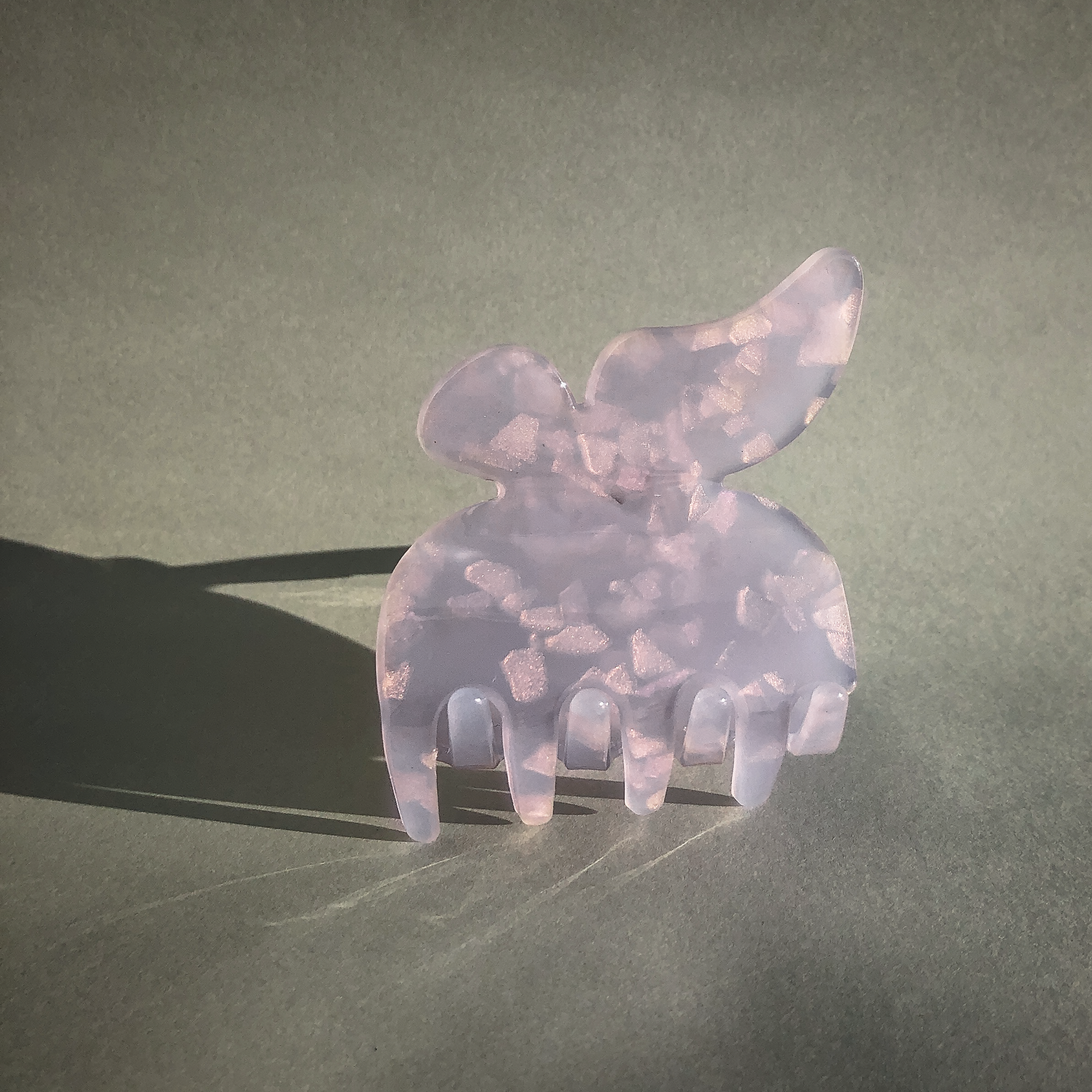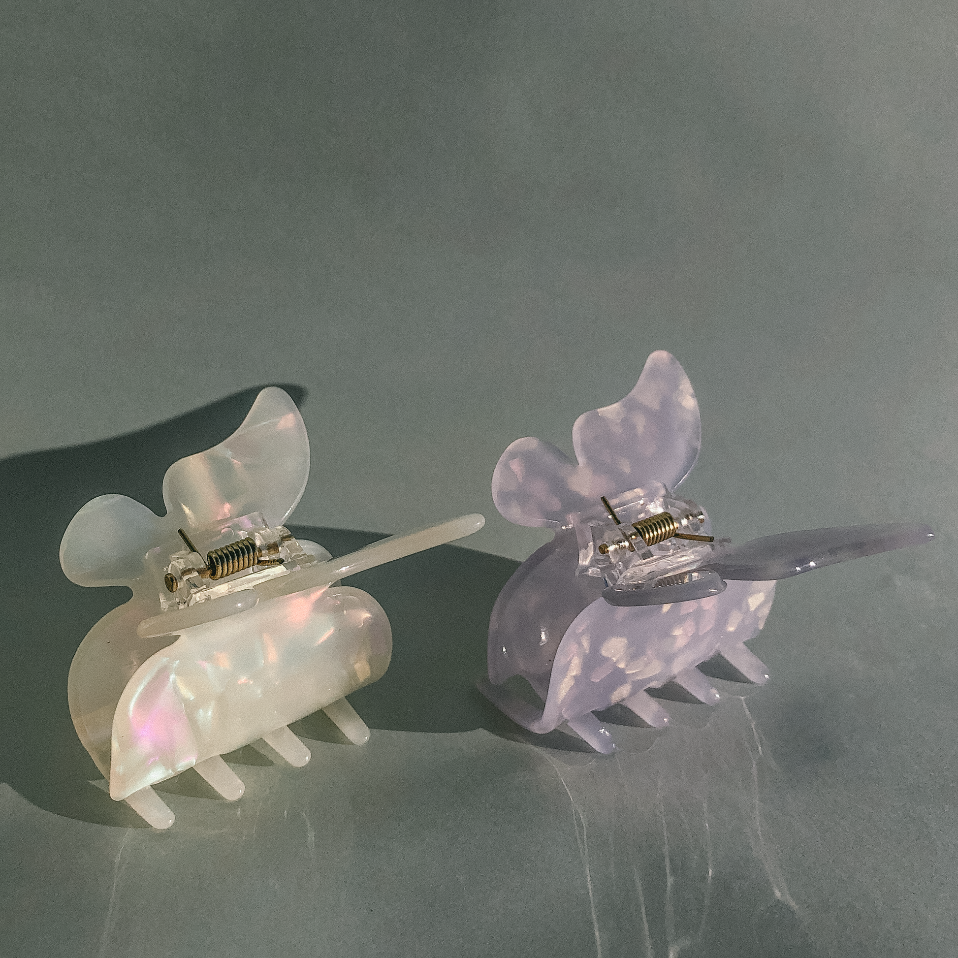 These XL Butterfly Hair Claws are a new addition to our retro acetate collection of hair accessories. The Lilac and White quartz shell Butterflies goes with any outfit and is perfect for updos.