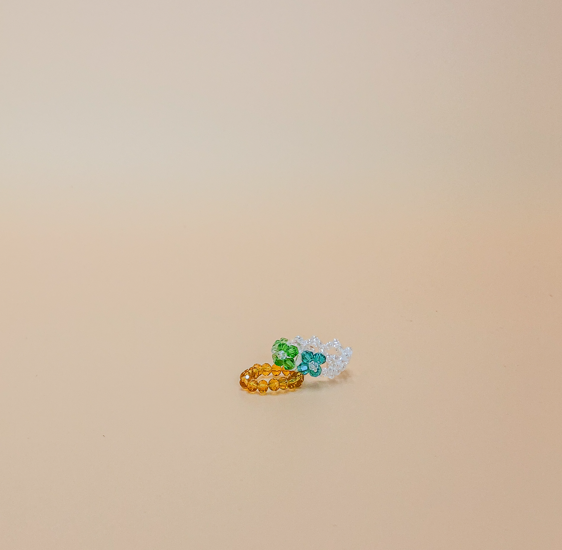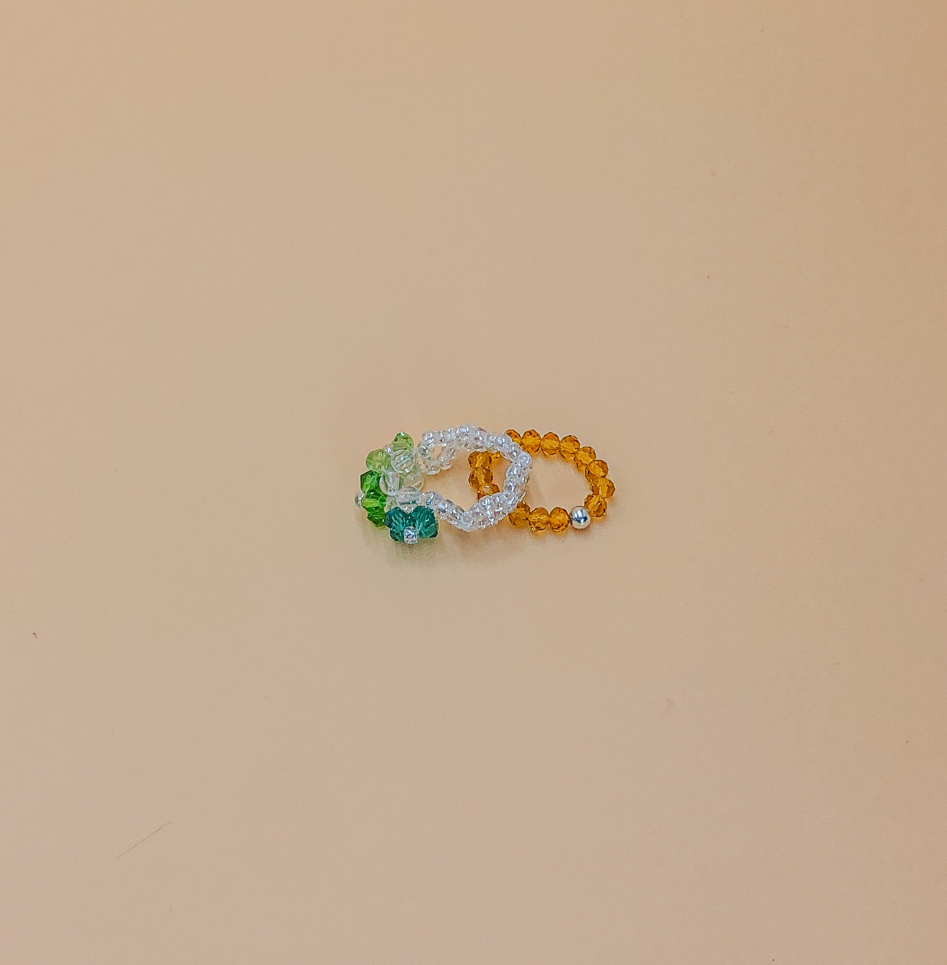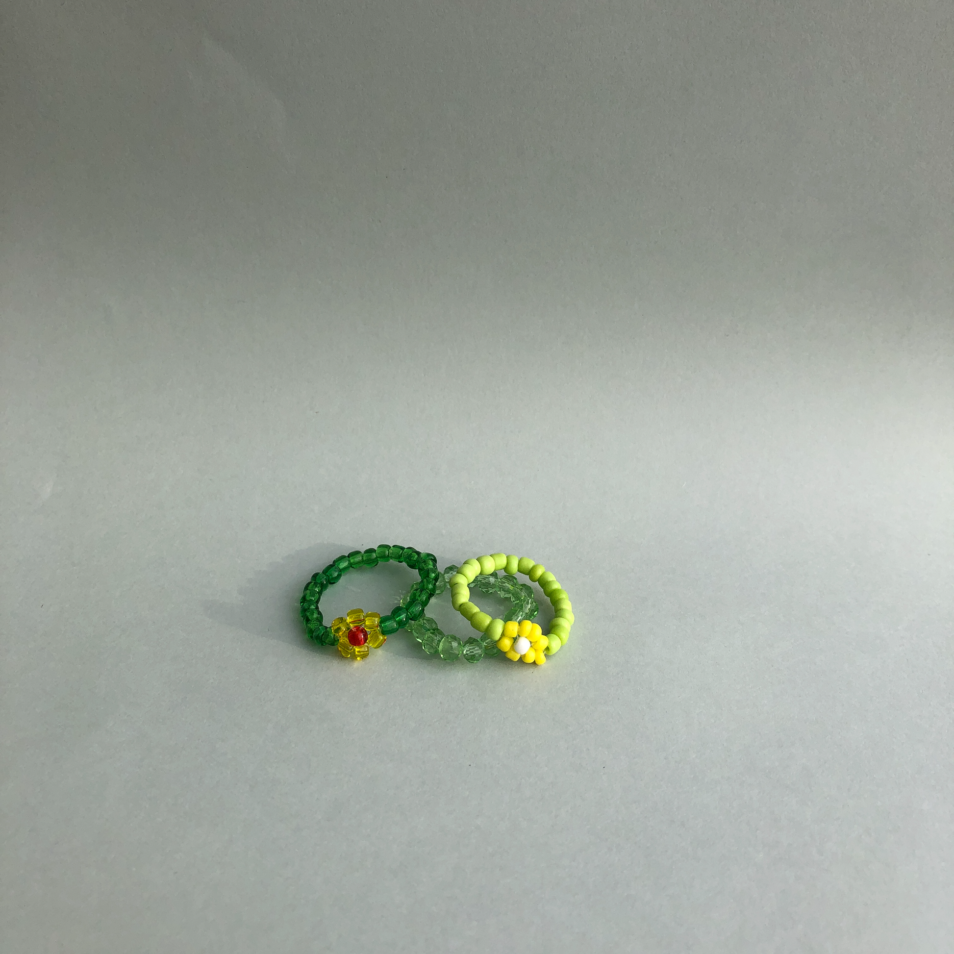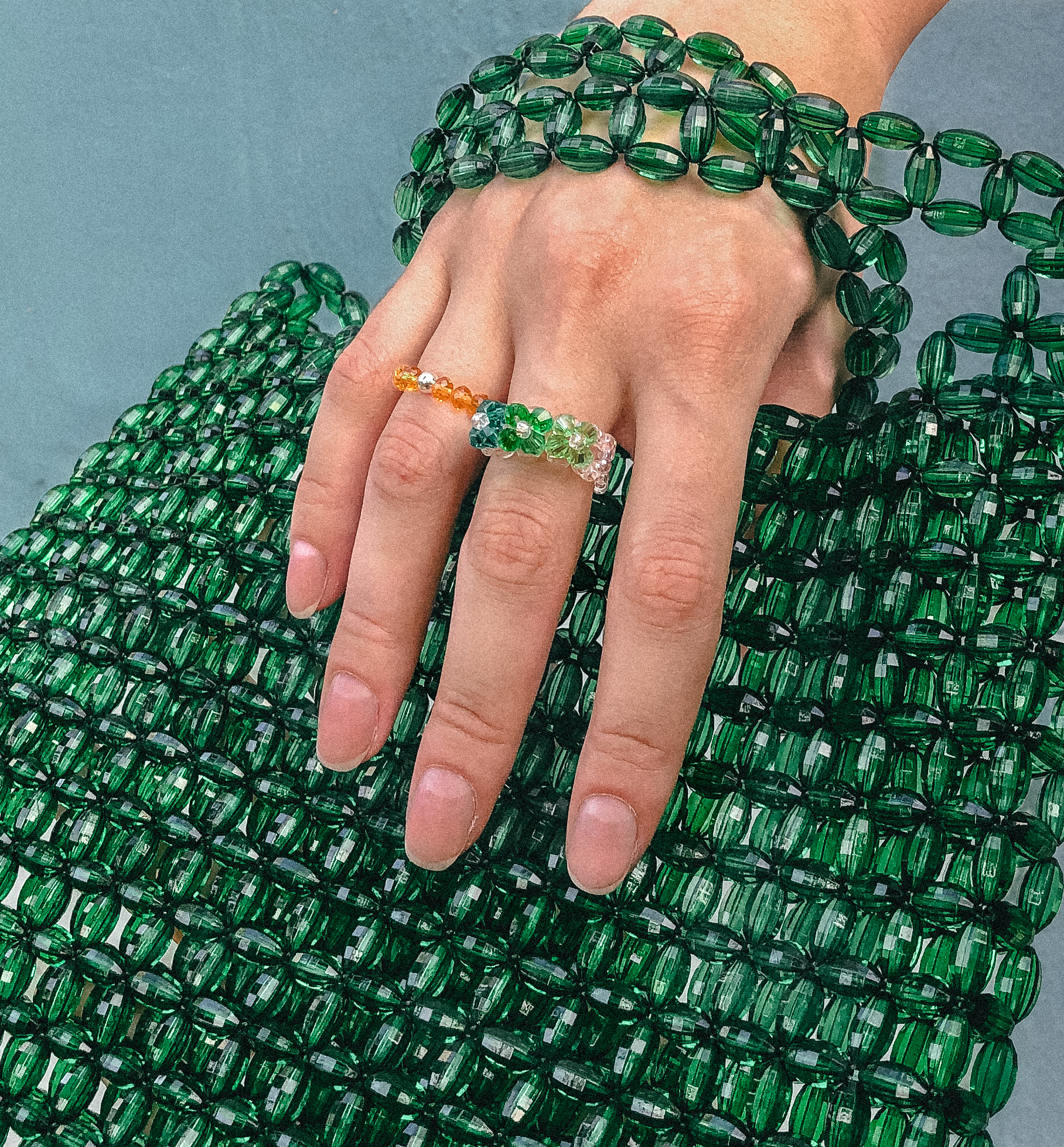 These are fun stretchy acrylic beaded rings seen in the Judy collection of emerald-hued accessories.