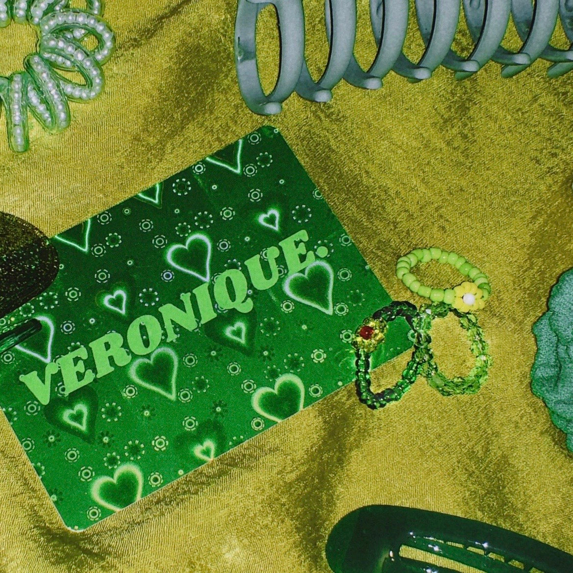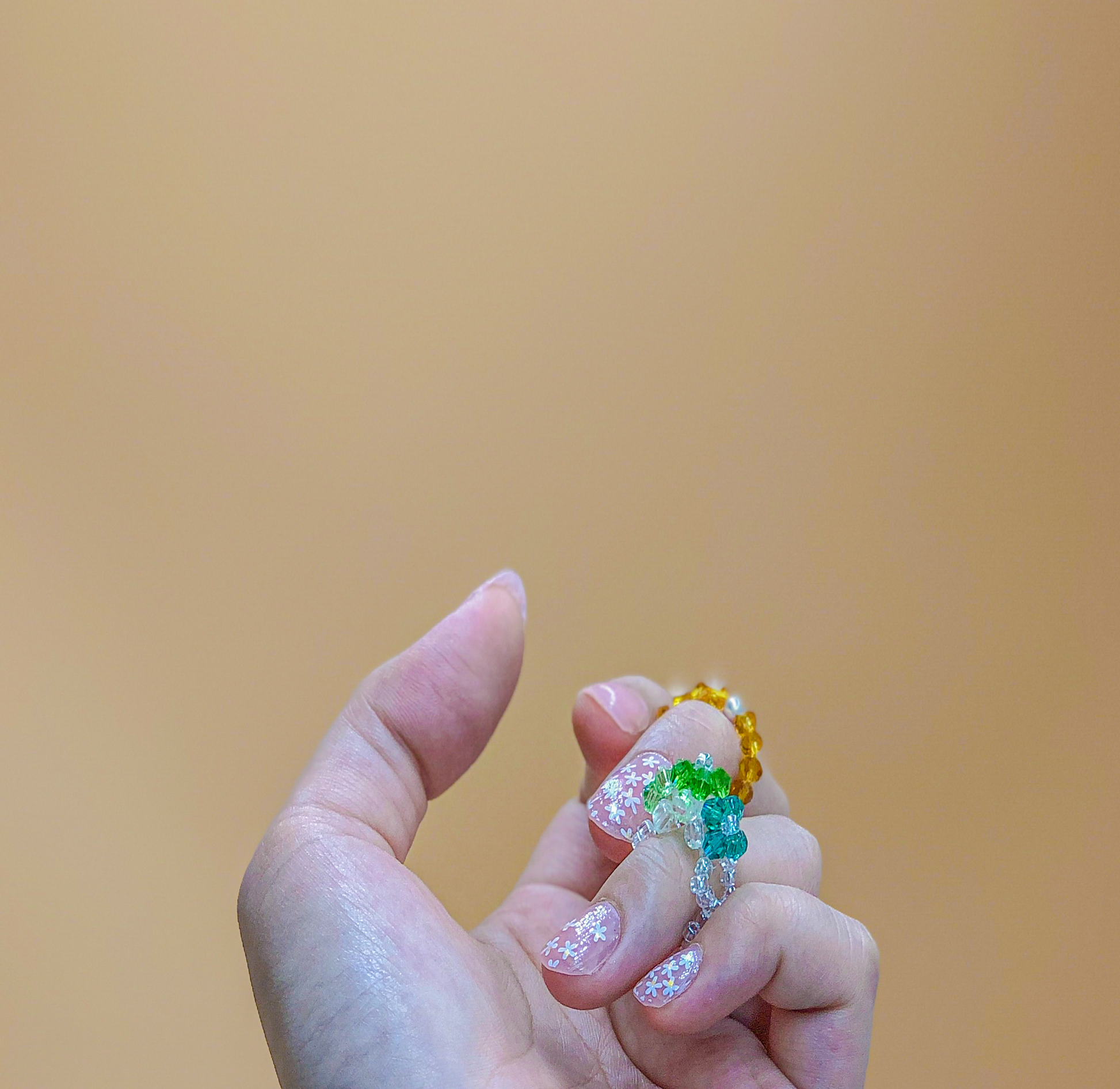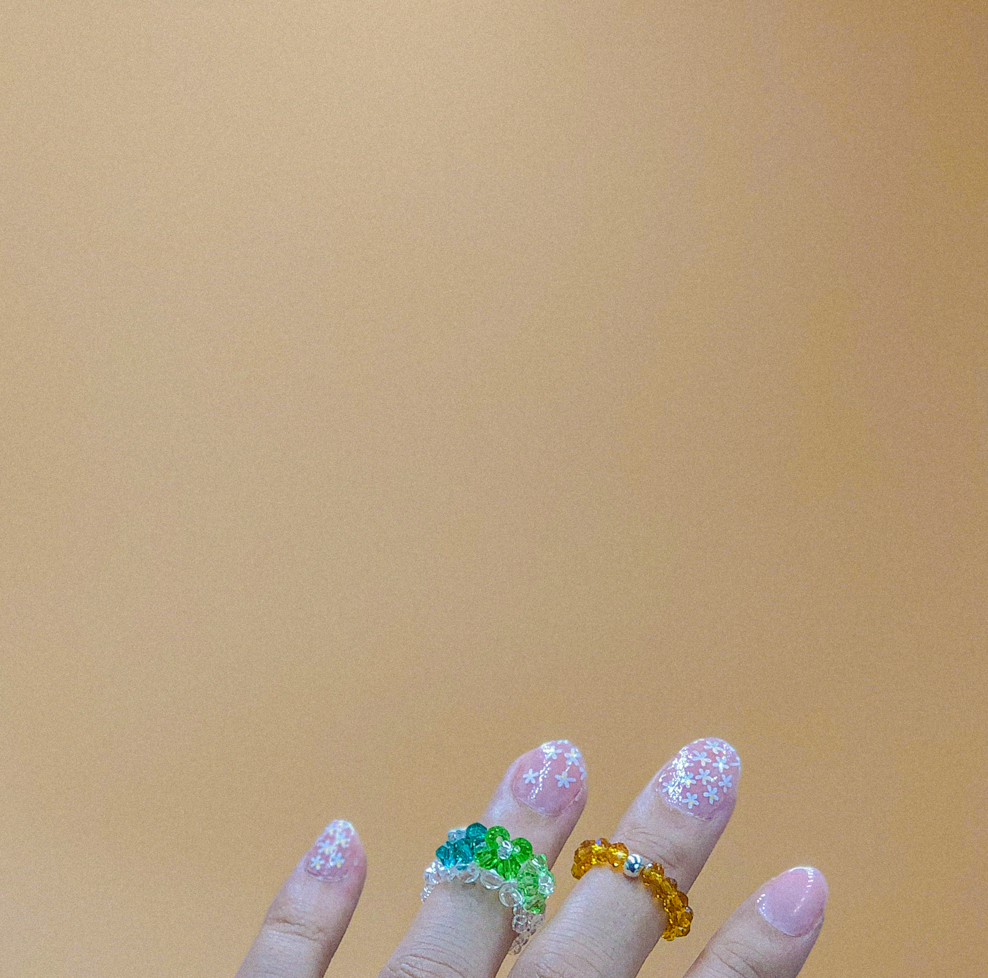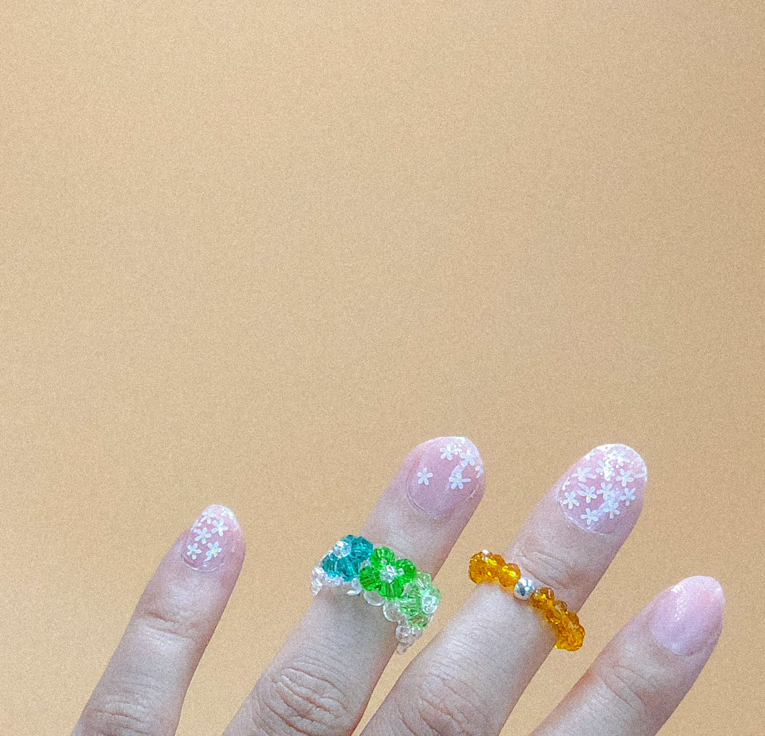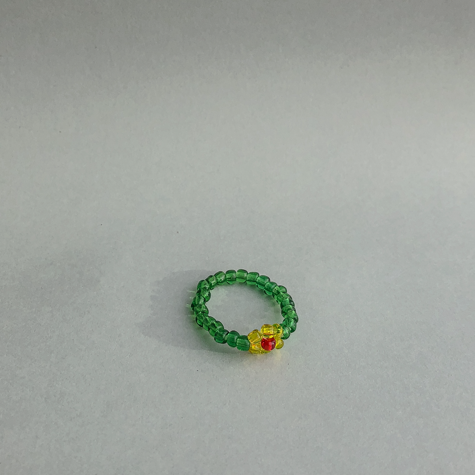 These are fun stretchy acrylic beaded rings seen in the Judy collection of emerald-hued accessories.
